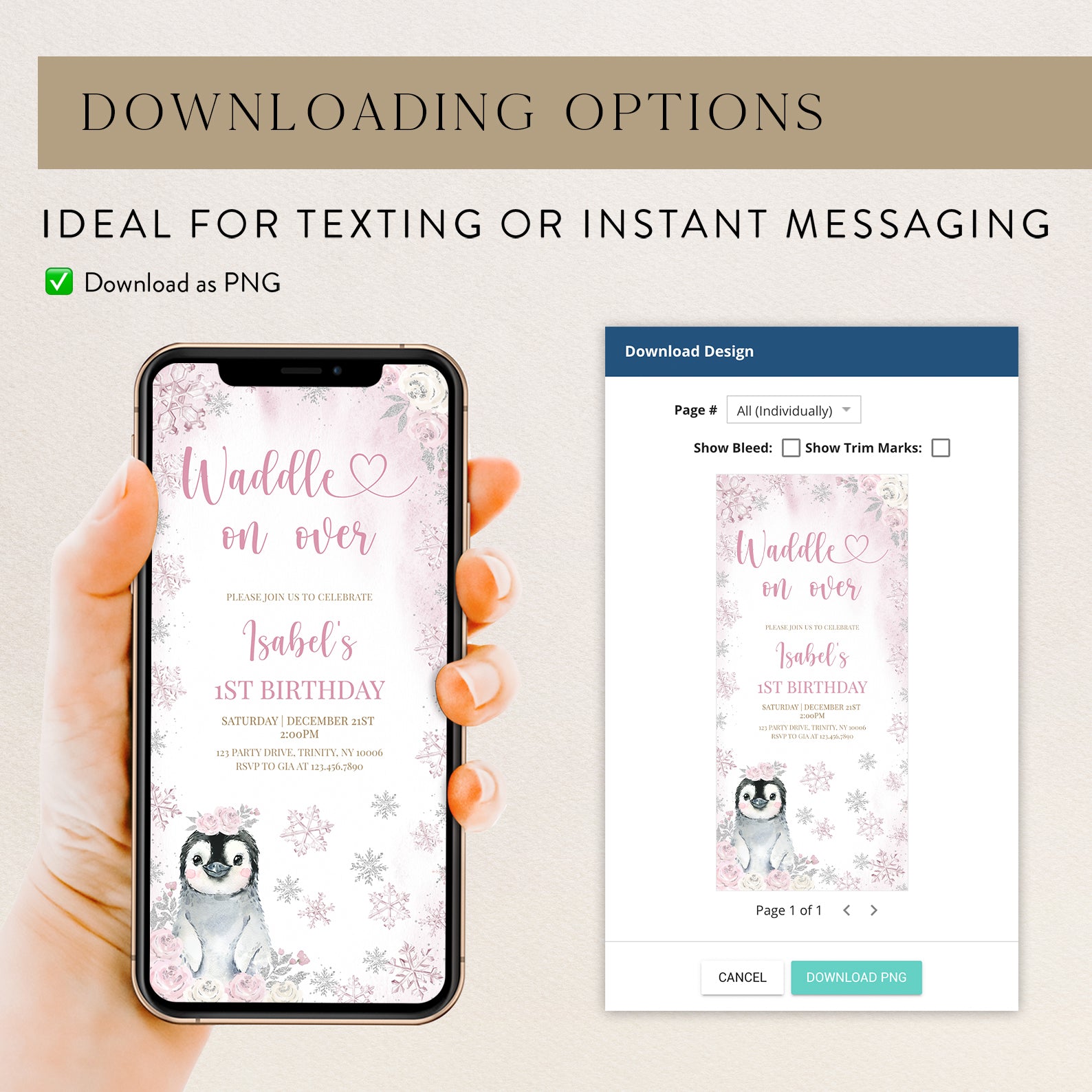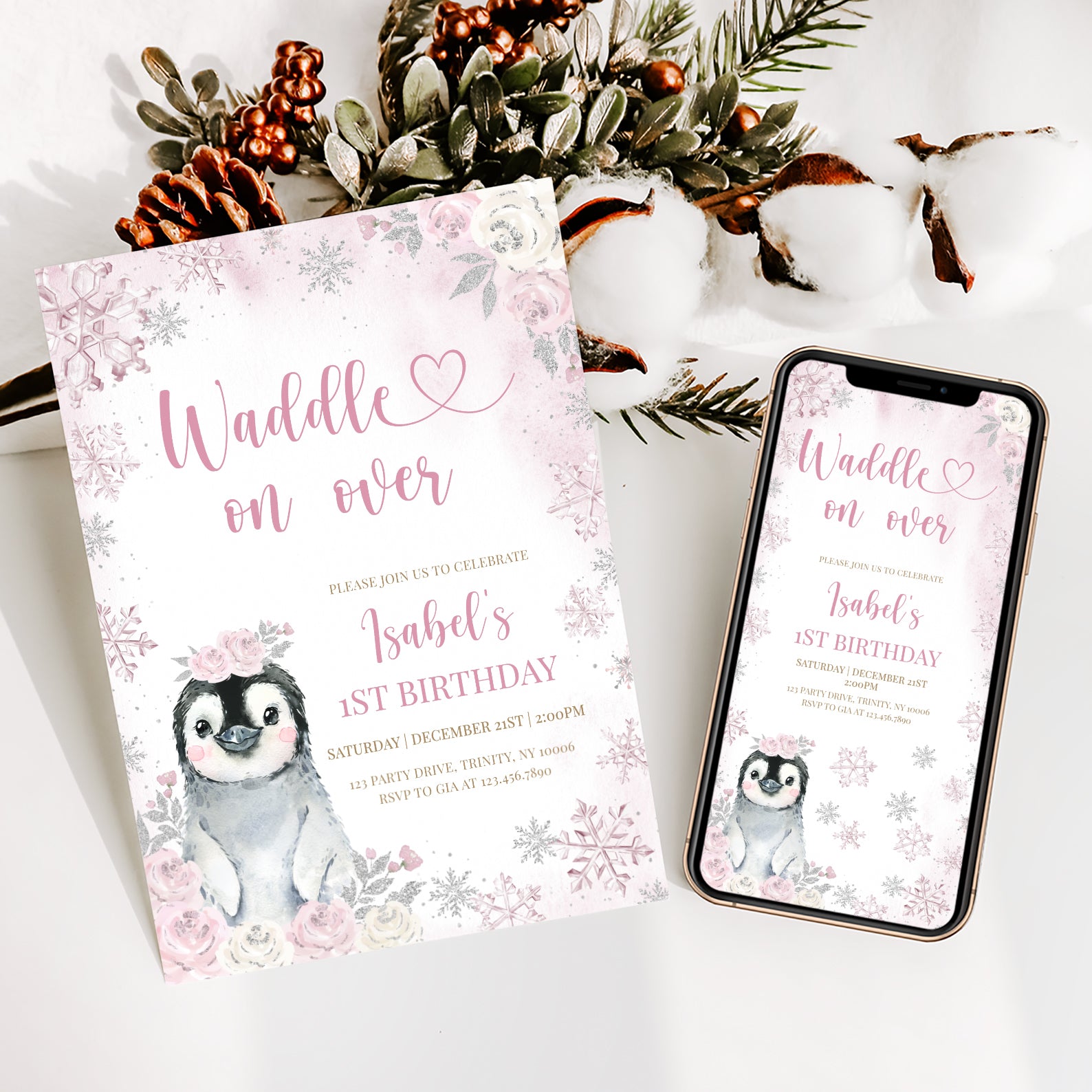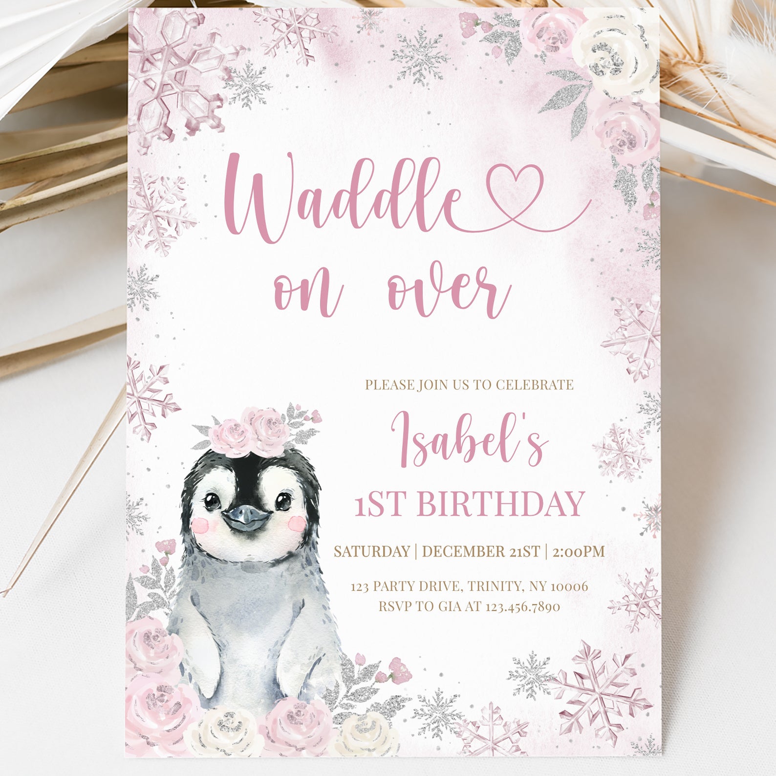 Celebrate your little one's first birthday with our enchanting Winter 1st Birthday Digital Invitation! Featuring a delightful baby penguin adorned with pink roses, this charming design is framed by a stunning pink and silver snowflake border, perfect for a winter wonderland theme. The combination of soft pink and white roses adds a touch of elegance, making it an ideal choice for your special celebration. Easily customizable and instantly downloadable, this invitation will set the tone for a memorable gathering. Waddle on over and make your baby's first birthday unforgettable!