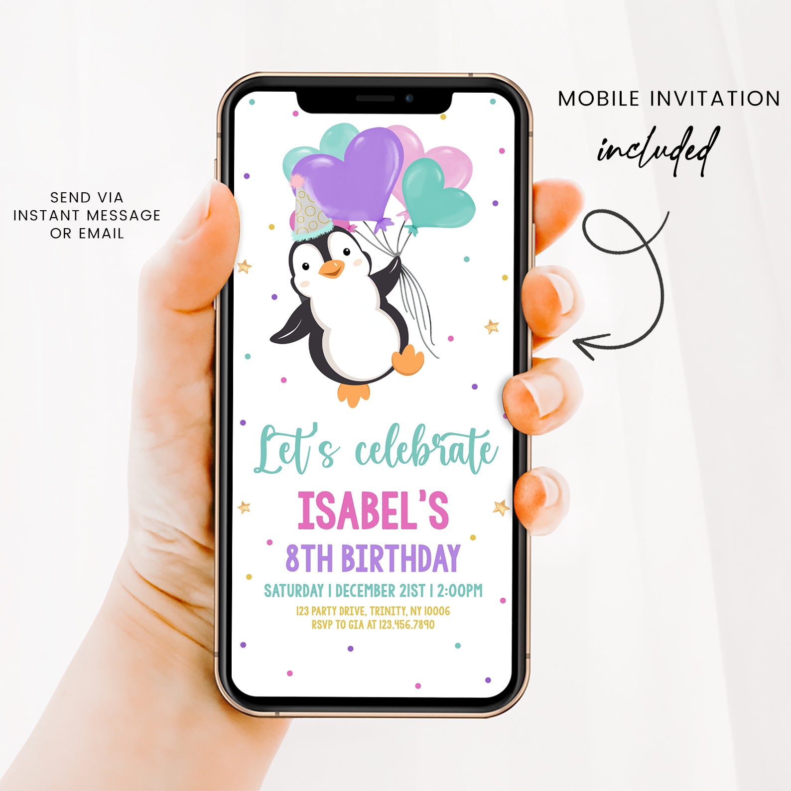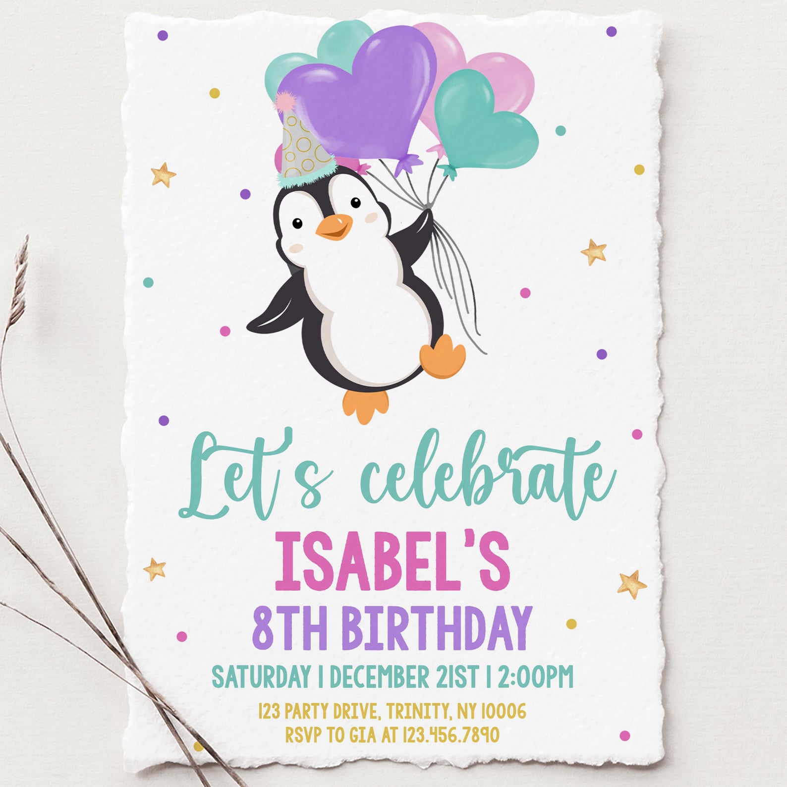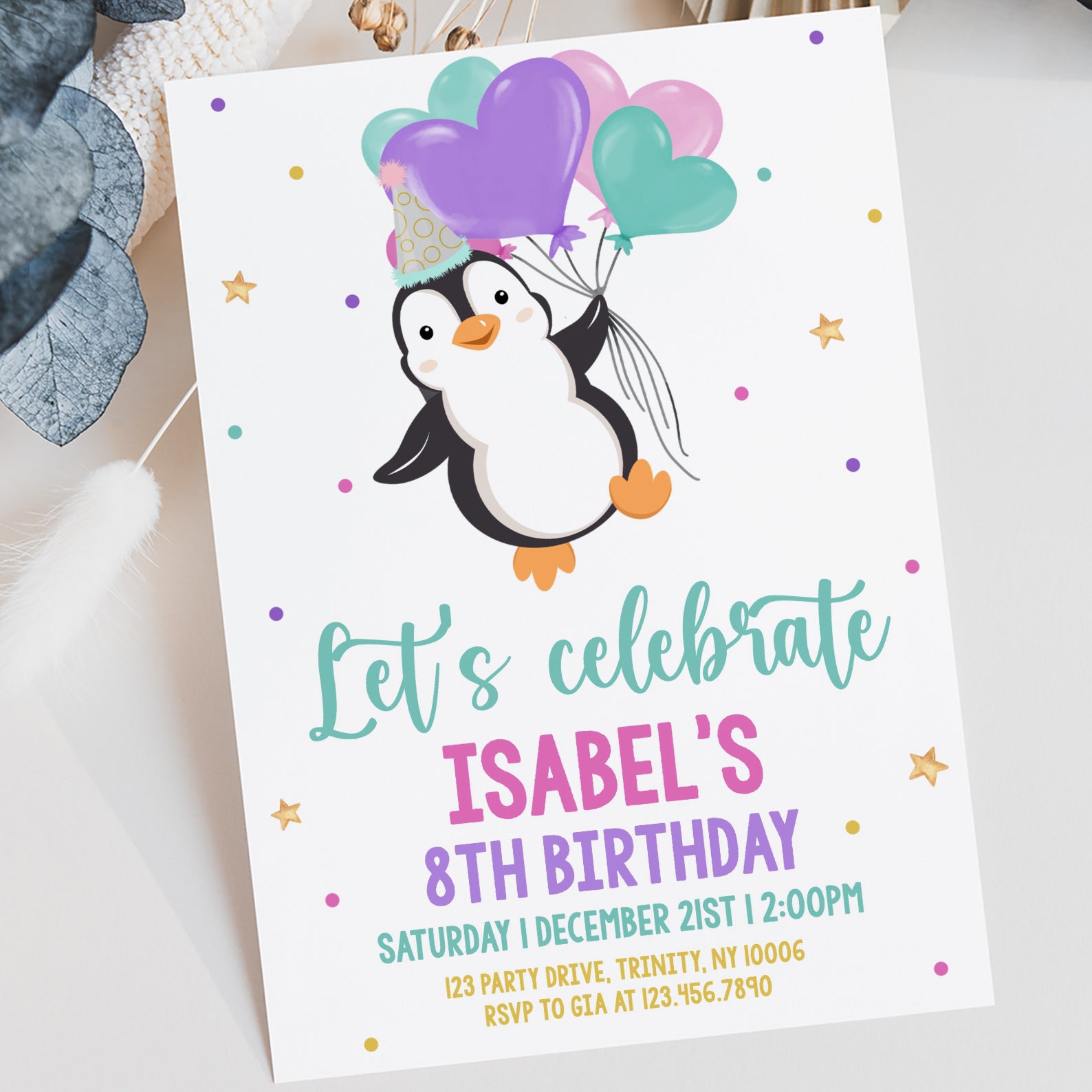 Celebrate your child's 8th birthday in style with our charming winter birthday digital invitation! Featuring an adorable penguin donning a festive party hat and holding heart-shaped balloons, this invitation is sure to bring smiles to your guests. Surrounded by twinkling stars and colorful dots, it sets the perfect tone for a fun and memorable celebration. Easy to customize and send, this invitation makes party planning a breeze. Let the festivities begin!