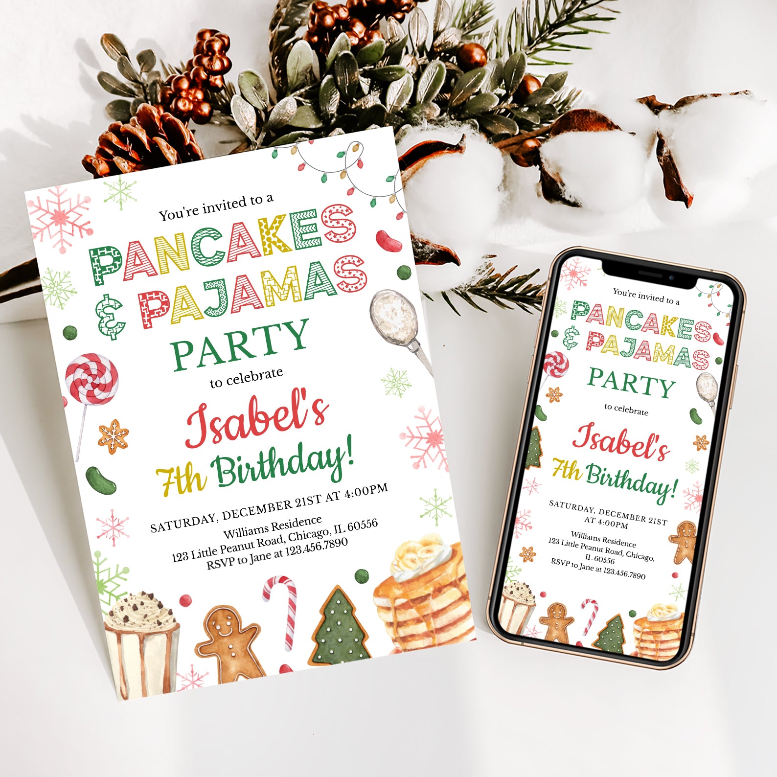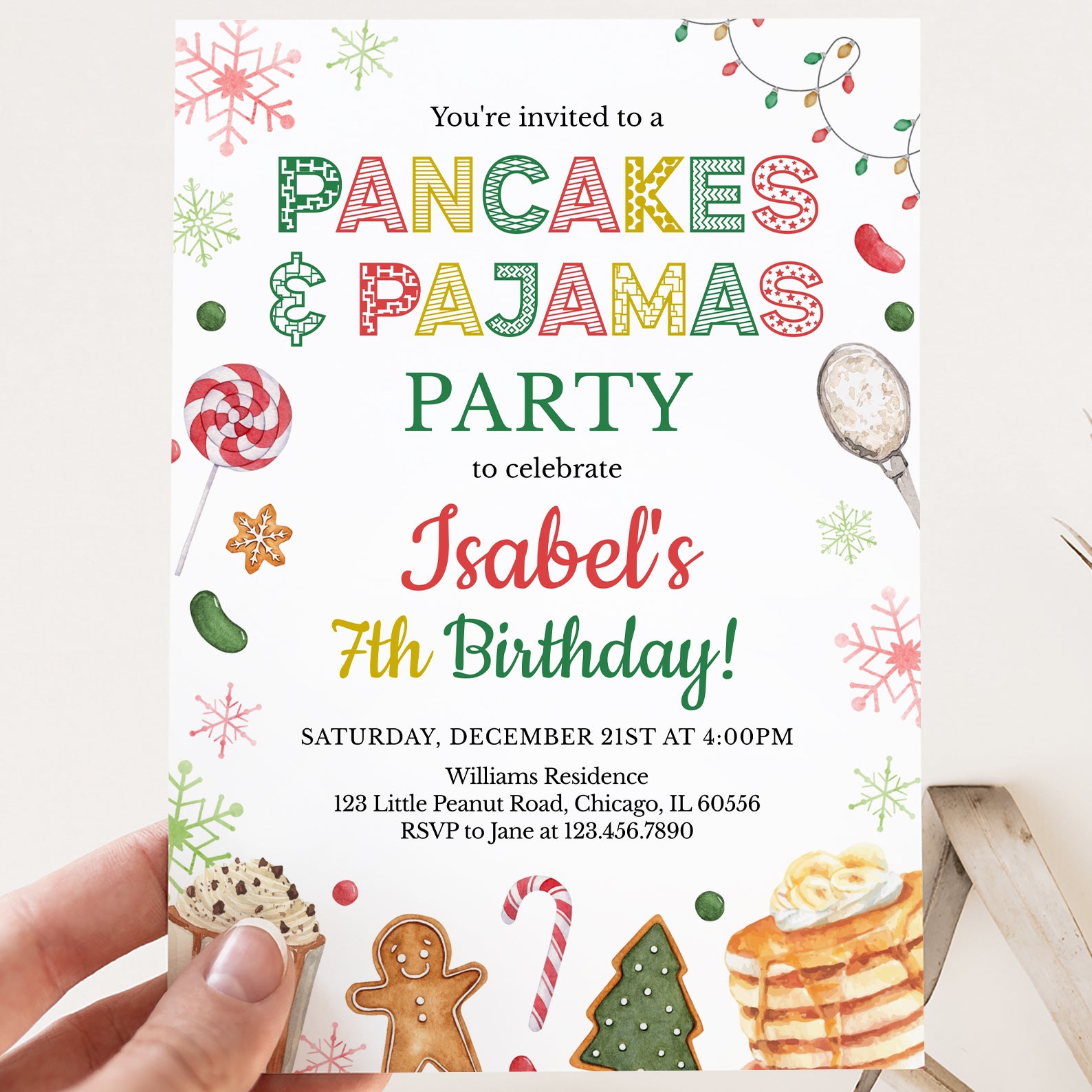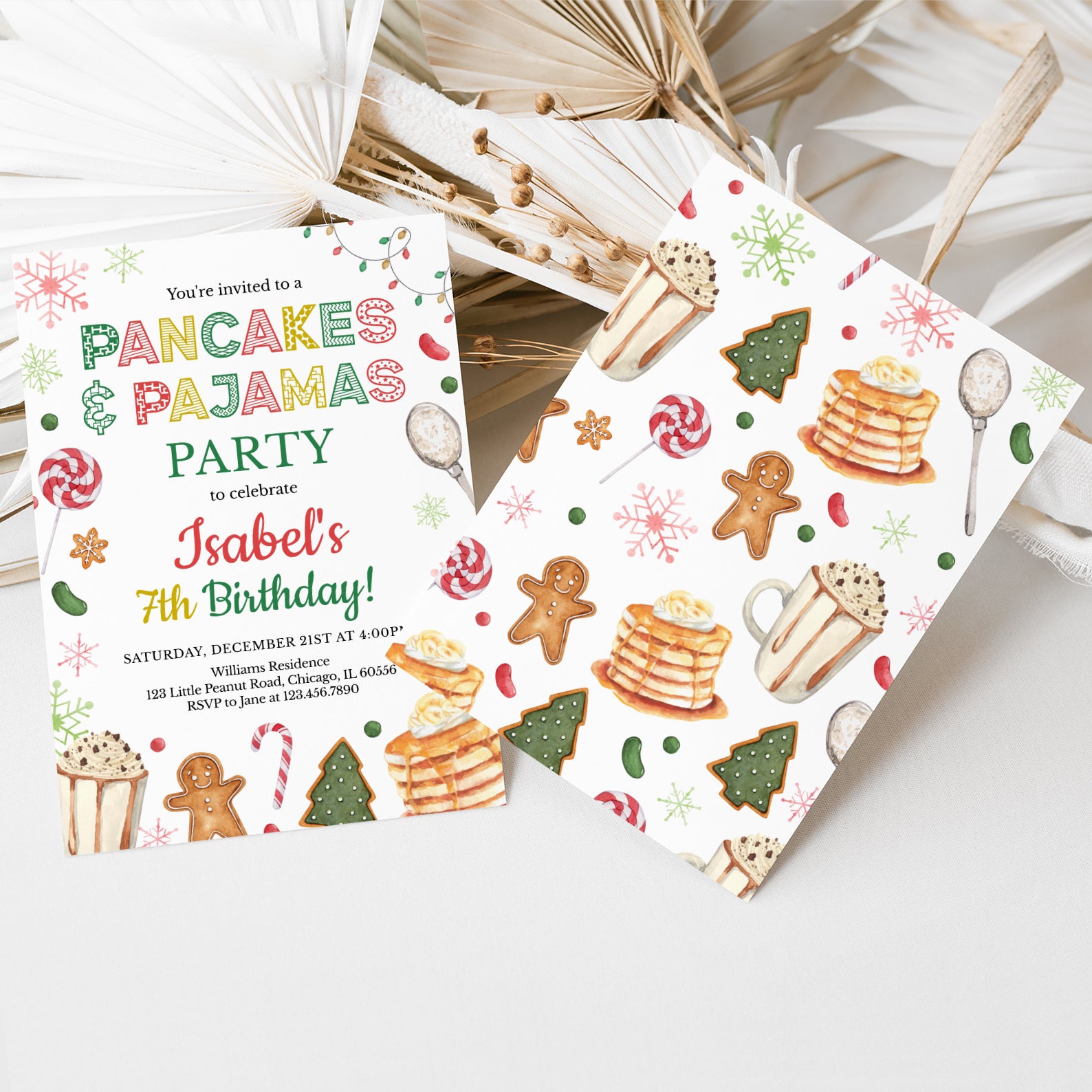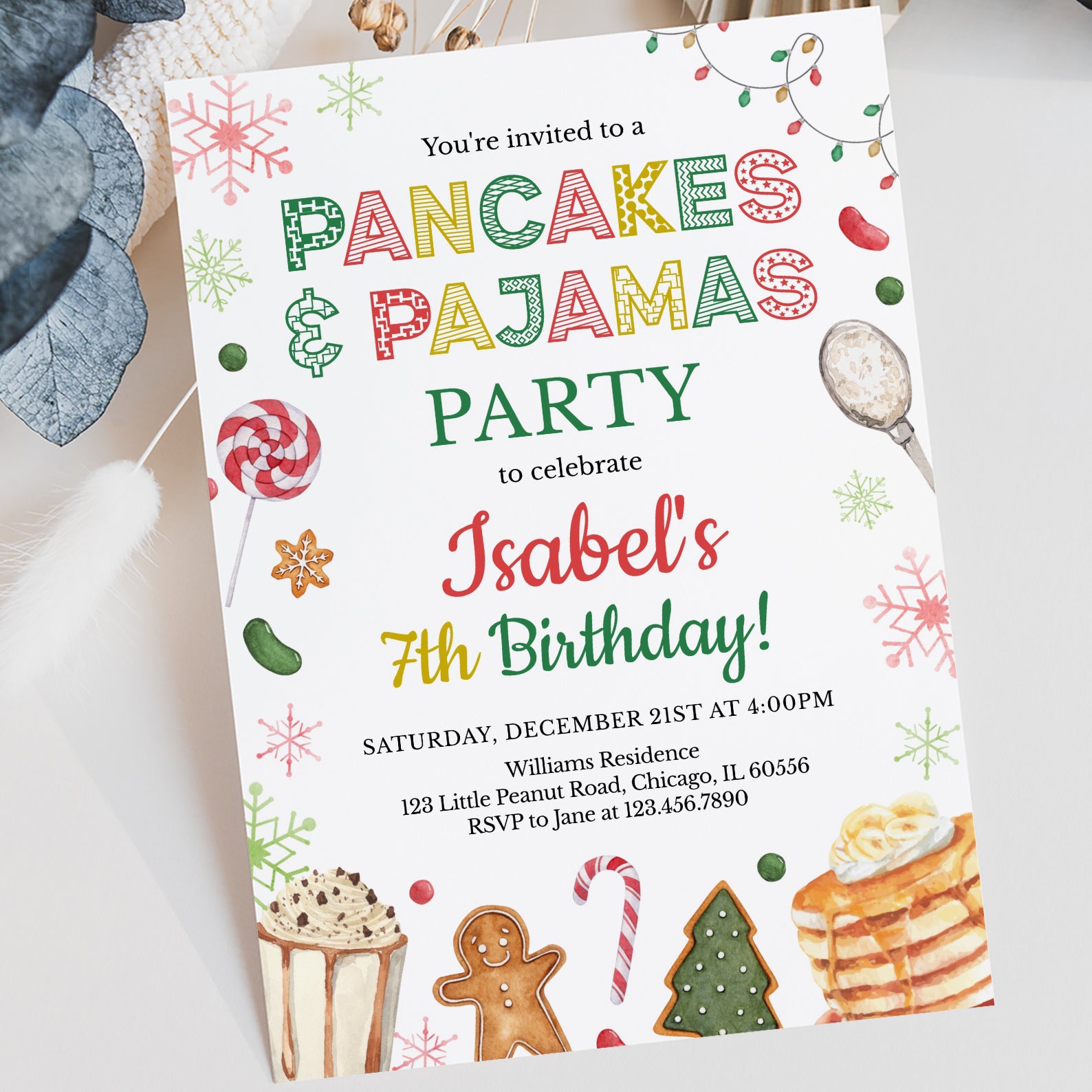- Purchase this Winter 7th Birthday Invite: Pancakes & Pajamas Fun template