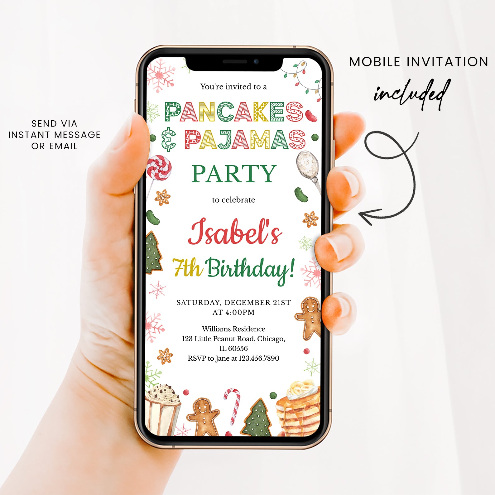 Celebrate your little one's 7th birthday in style with our enchanting Winter Birthday Digital Invitation! Featuring a delightful design adorned with colorful snowflakes, twinkling Christmas lights, and festive treats like candies, cookies, and candy canes, this invitation sets the perfect tone for a cozy pancakes and pajamas party. With a warm cup of cocoa and a whimsical winter theme, your guests will be excited to join in the fun and festivities. Make this birthday unforgettable with a charming invitation that captures the magic of the season!