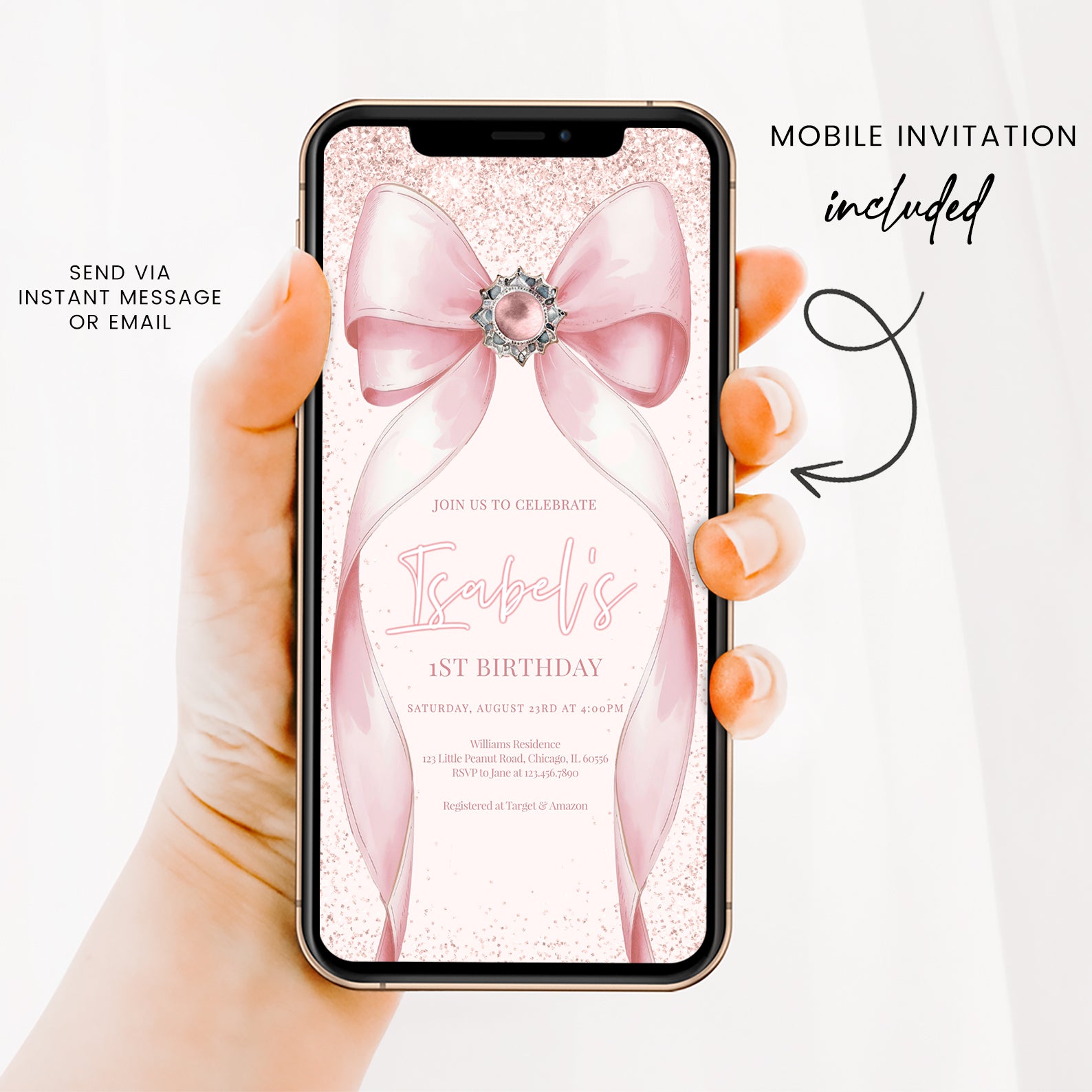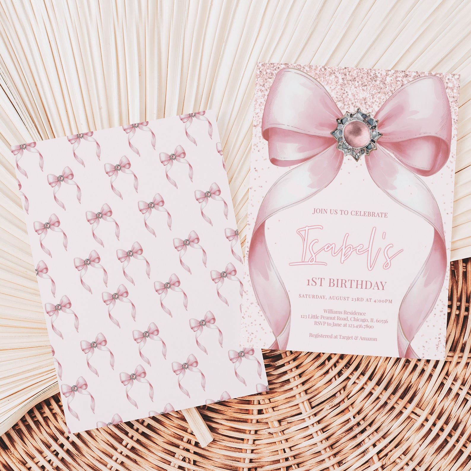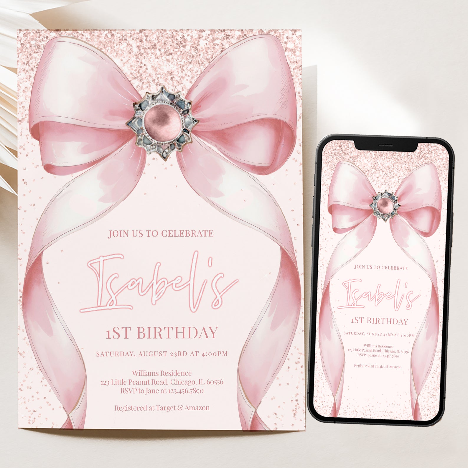 Celebrate your little one's milestone with our enchanting pink-themed digital invitation for their 1st birthday! Adorned with delightful pink accents and a charming big ribbon, this invitation sets the perfect tone for a joyful celebration. Effortlessly customizable, it allows you to add your personal touch while ensuring your guests feel the excitement of this special day. Make your child's first birthday unforgettable with this beautifully designed invitation that captures the essence of love and joy!