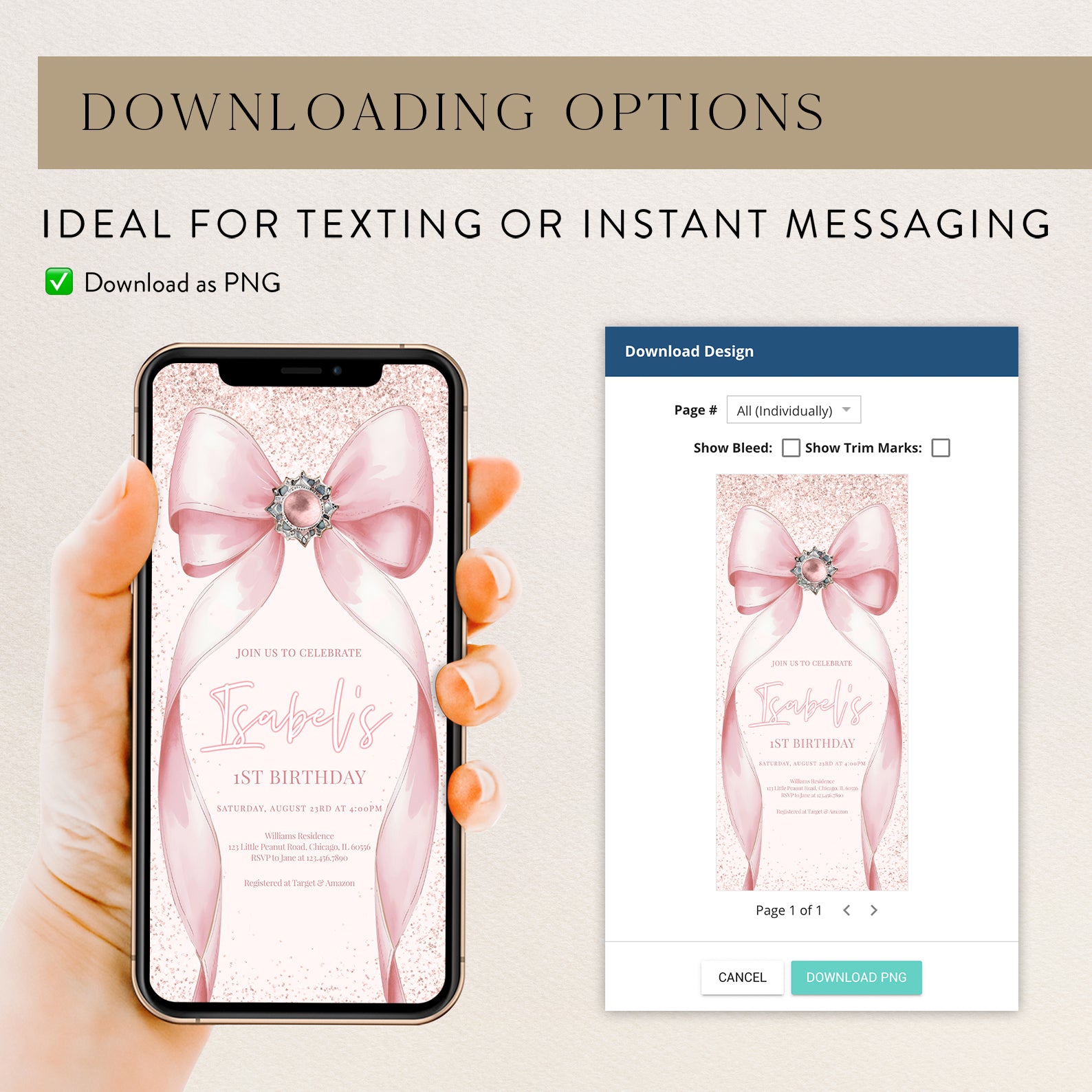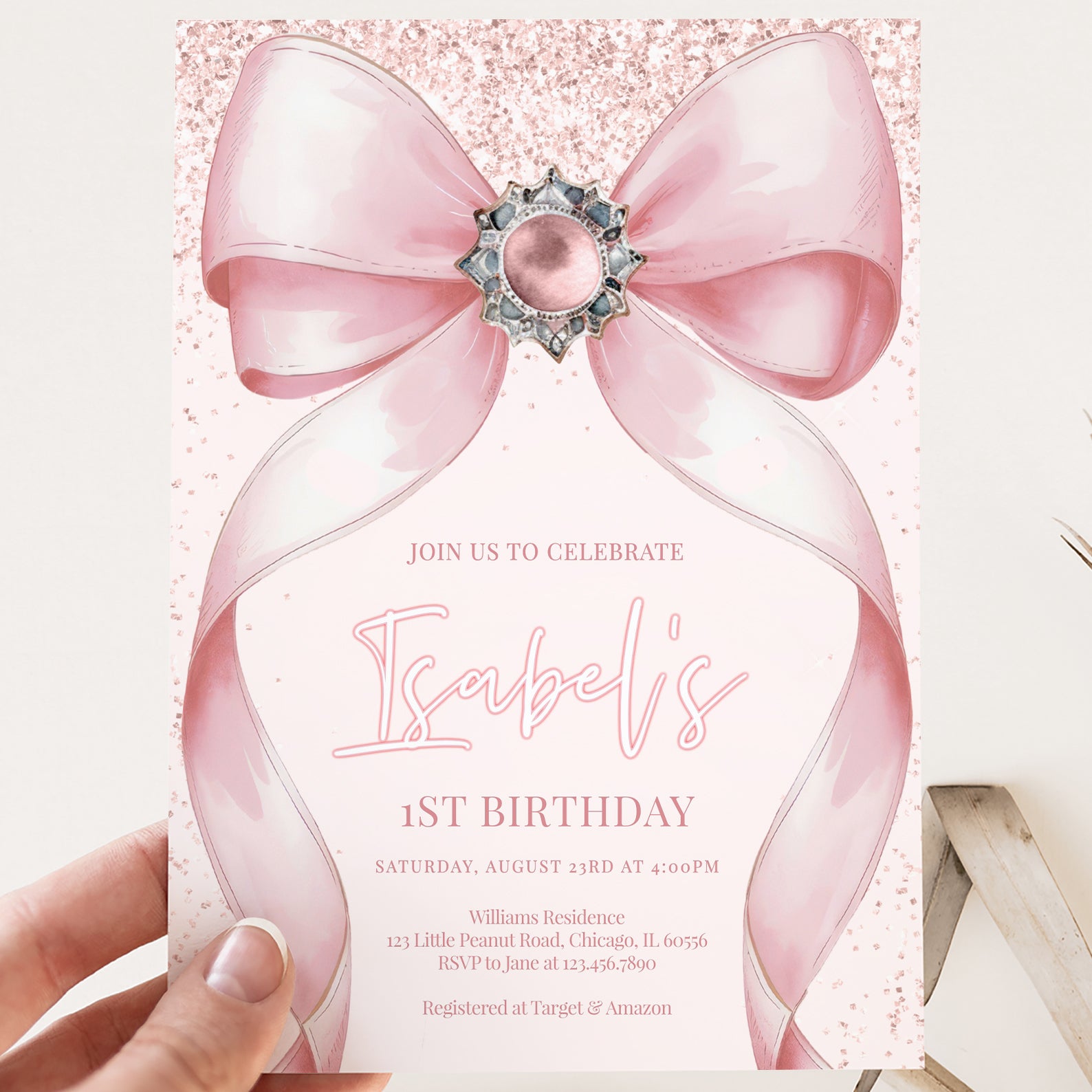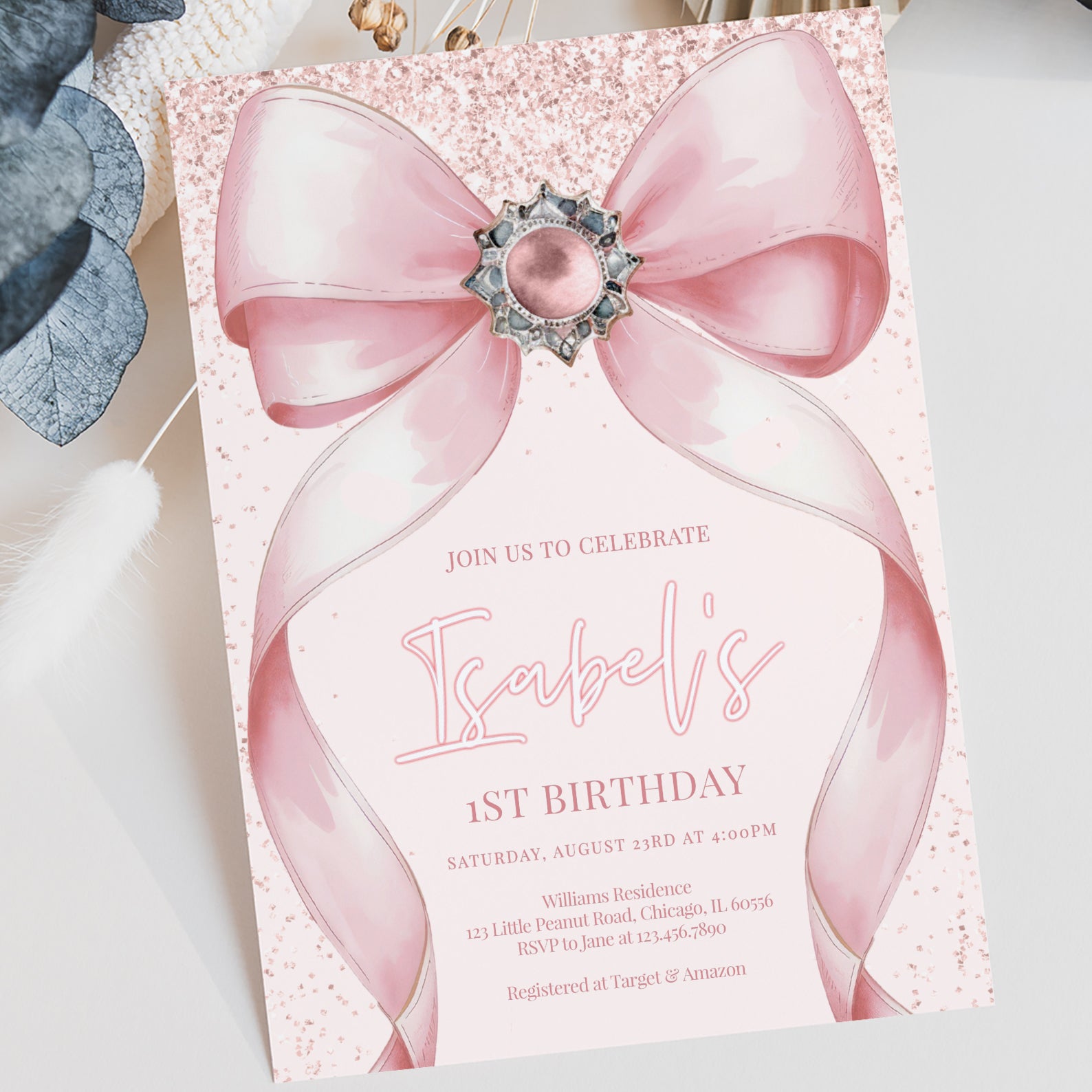 Celebrate your little one's milestone with our enchanting pink-themed digital invitation for their 1st birthday! Adorned with delightful pink accents and a charming big ribbon, this invitation sets the perfect tone for a joyful celebration. Effortlessly customizable, it allows you to add your personal touch while ensuring your guests feel the excitement of this special day. Make your child's first birthday unforgettable with this beautifully designed invitation that captures the essence of love and joy!