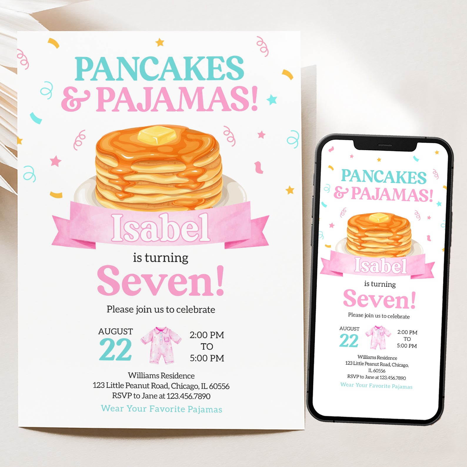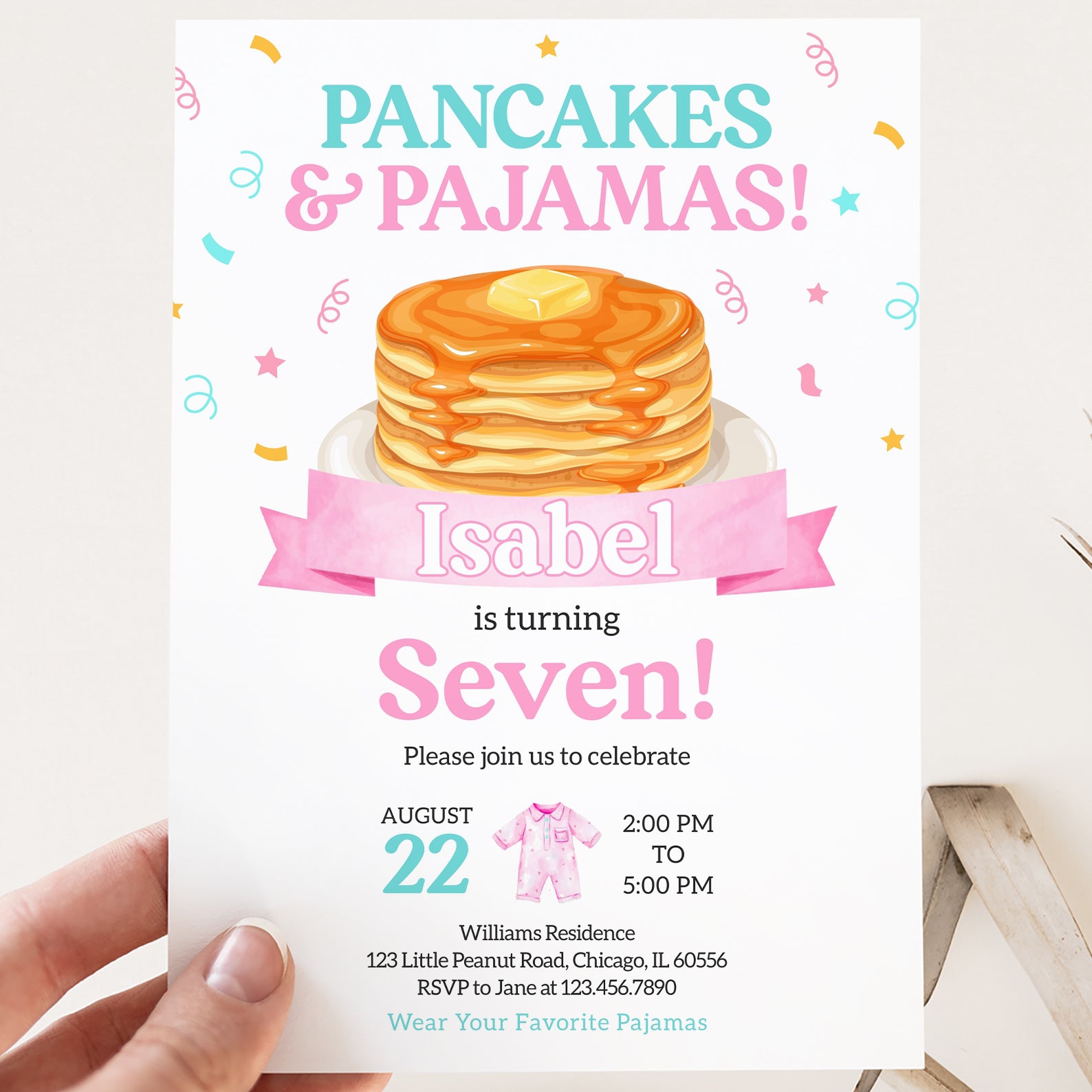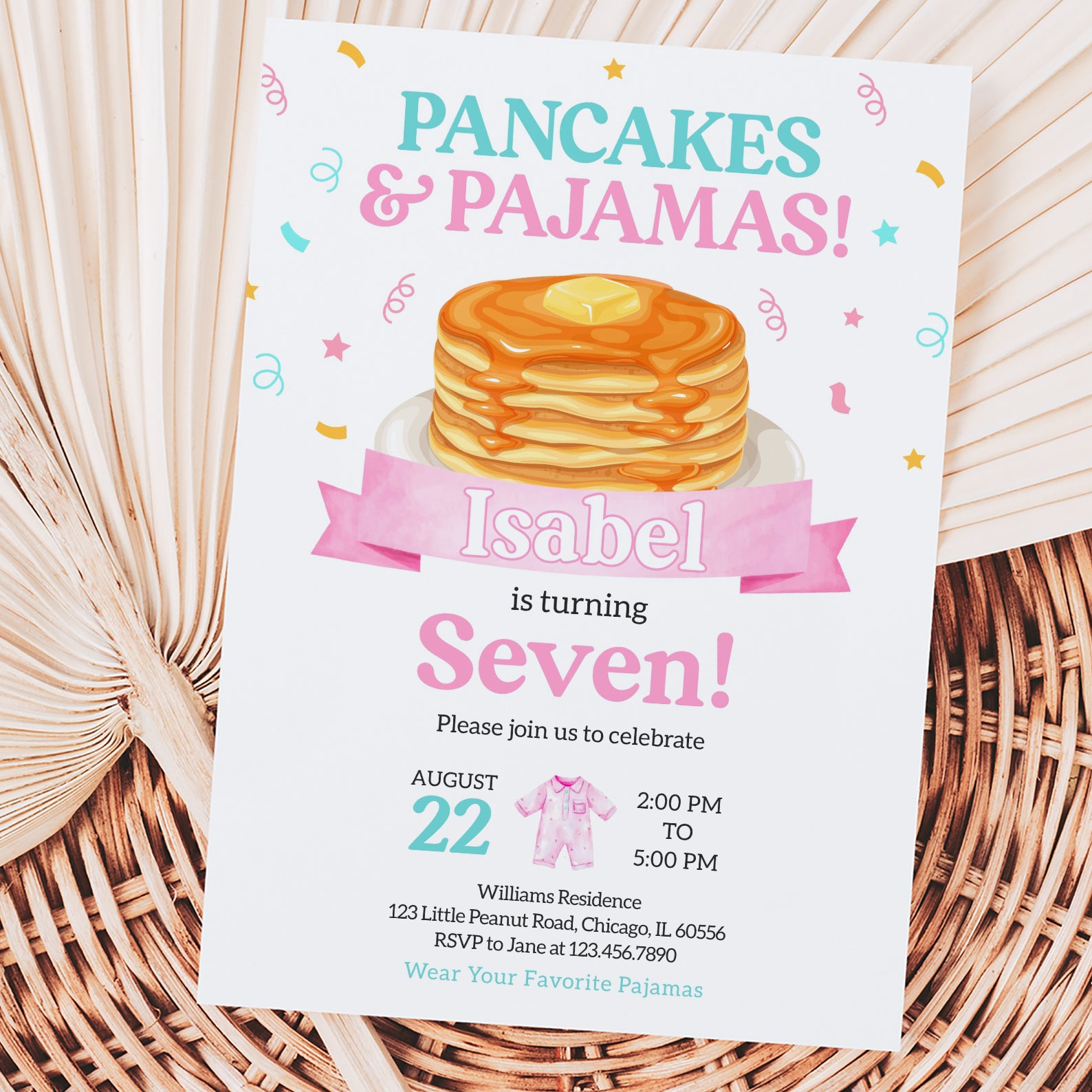 - Purchase this Pancakes & Pajamas 7th Birthday Invite: Confetti Fun template