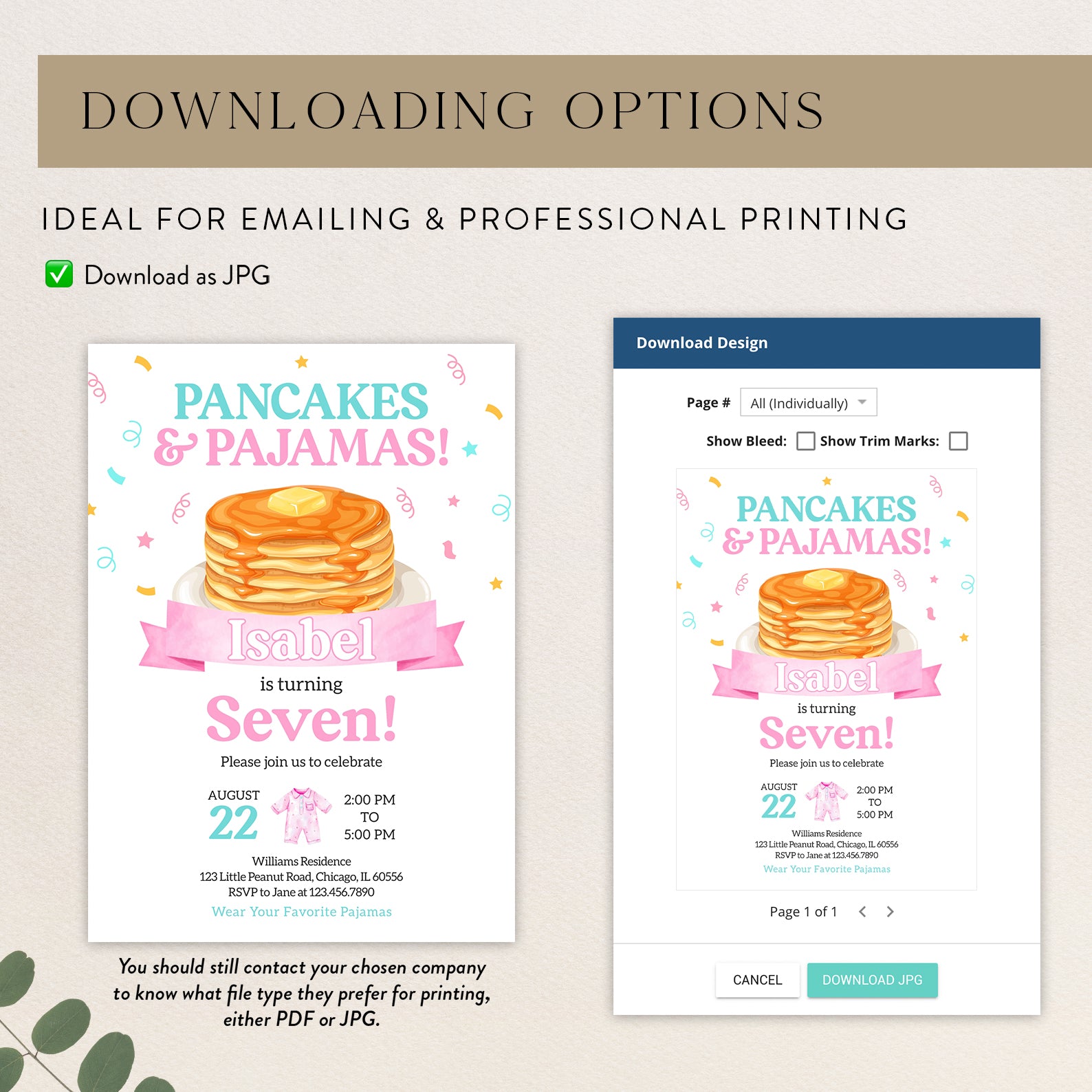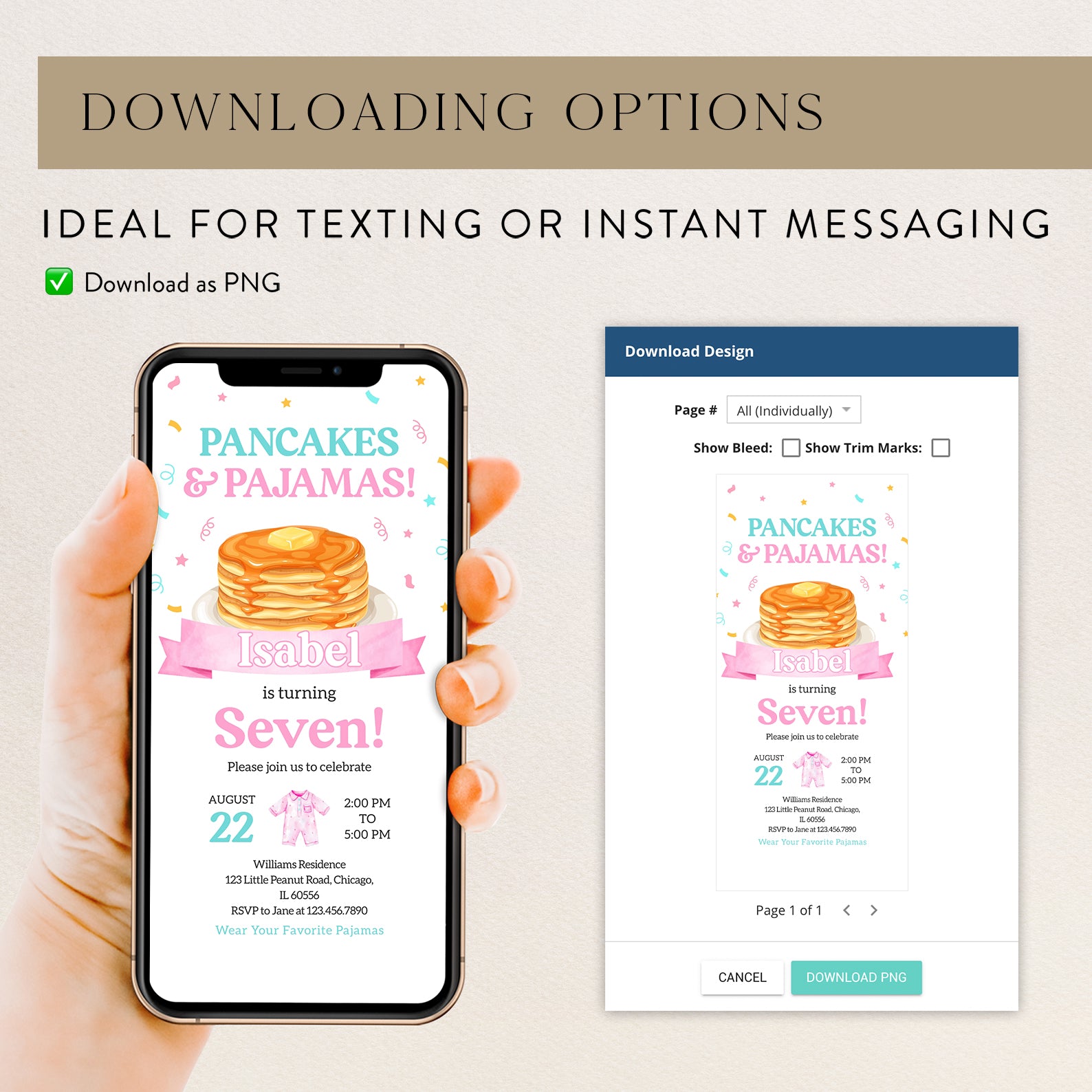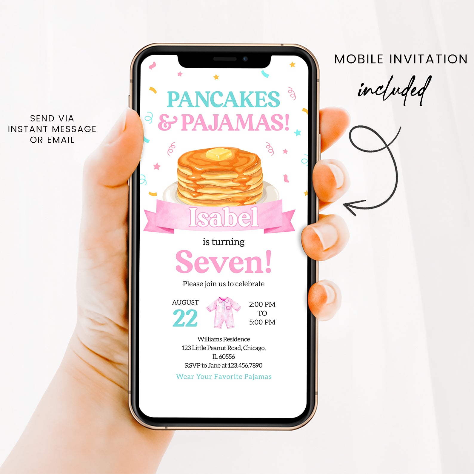 Celebrate your little one's 7th birthday in style with our delightful Pancakes & Pajamas digital invitation! Featuring a scrumptious pancake topped with syrup and butter, elegantly served on a plate, this invitation is adorned with playful falling confetti and a charming pink ribbon. Perfect for setting the tone for a cozy and fun-filled birthday bash, this invitation will have your guests excited to join in the festivities. Make their special day unforgettable with this whimsical design that captures the joy of pancakes and pajamas!