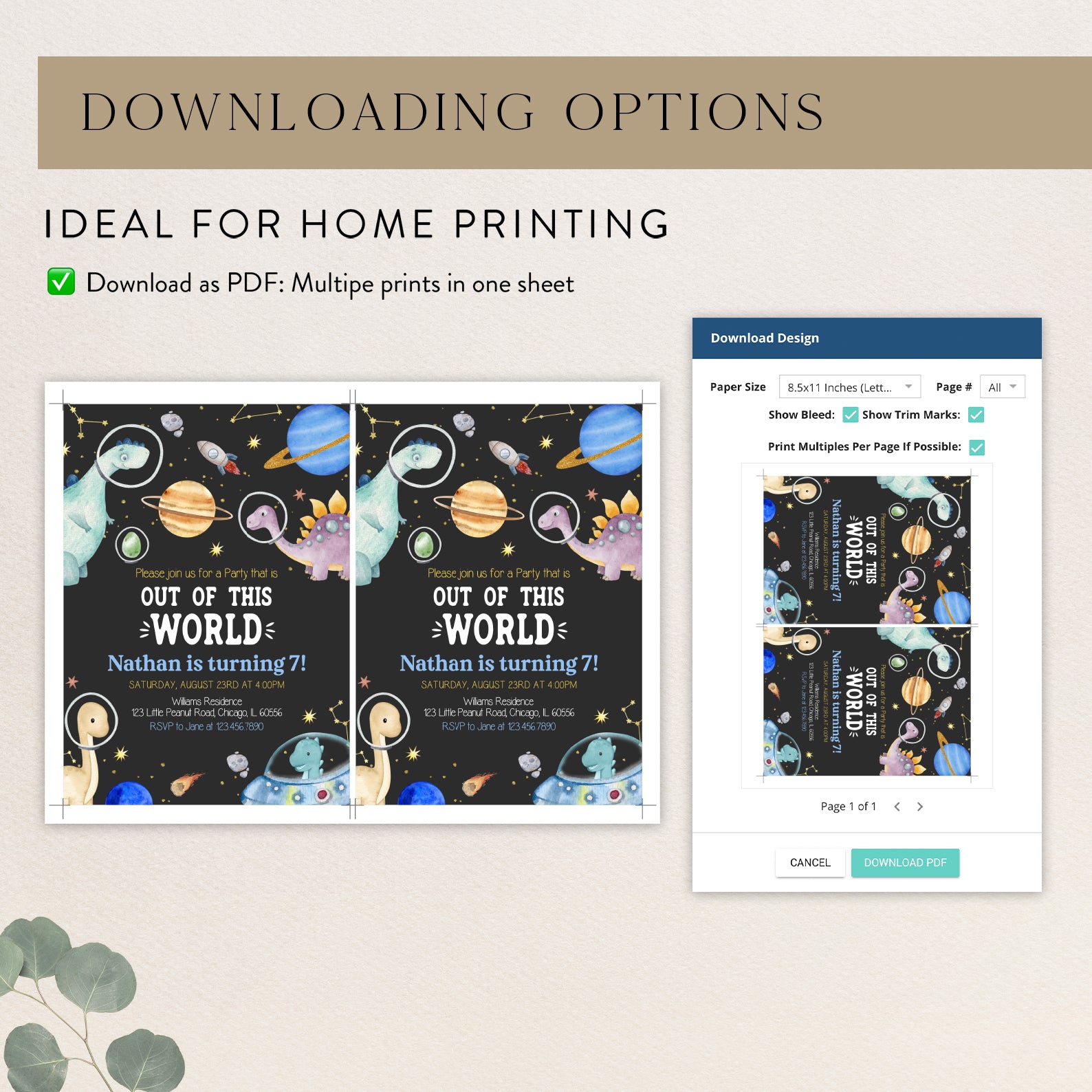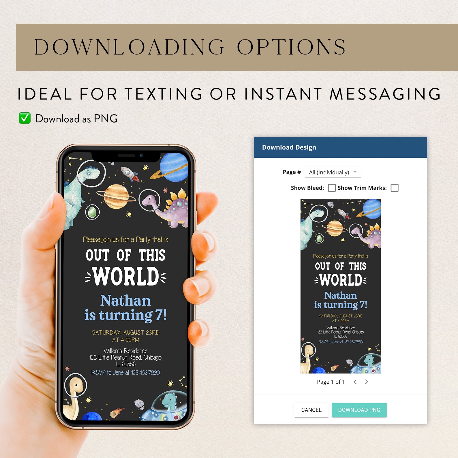 Blast off into an unforgettable celebration with our Out of This World Space-Themed Birthday Digital Invitation! Perfectly designed for your little astronaut's 7th birthday, this vibrant invitation features adorable dinosaurs in astronaut helmets, floating among asteroids, spaceships, planets, stars, and constellations—all set against a striking black background. Make your child's special day truly cosmic and set the tone for an adventure that’s sure to be a hit with friends and family. Get ready to launch the party into orbit!