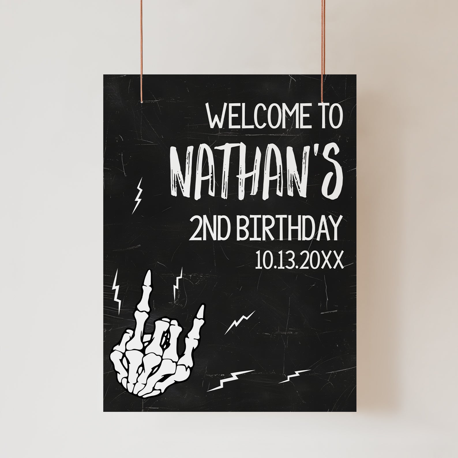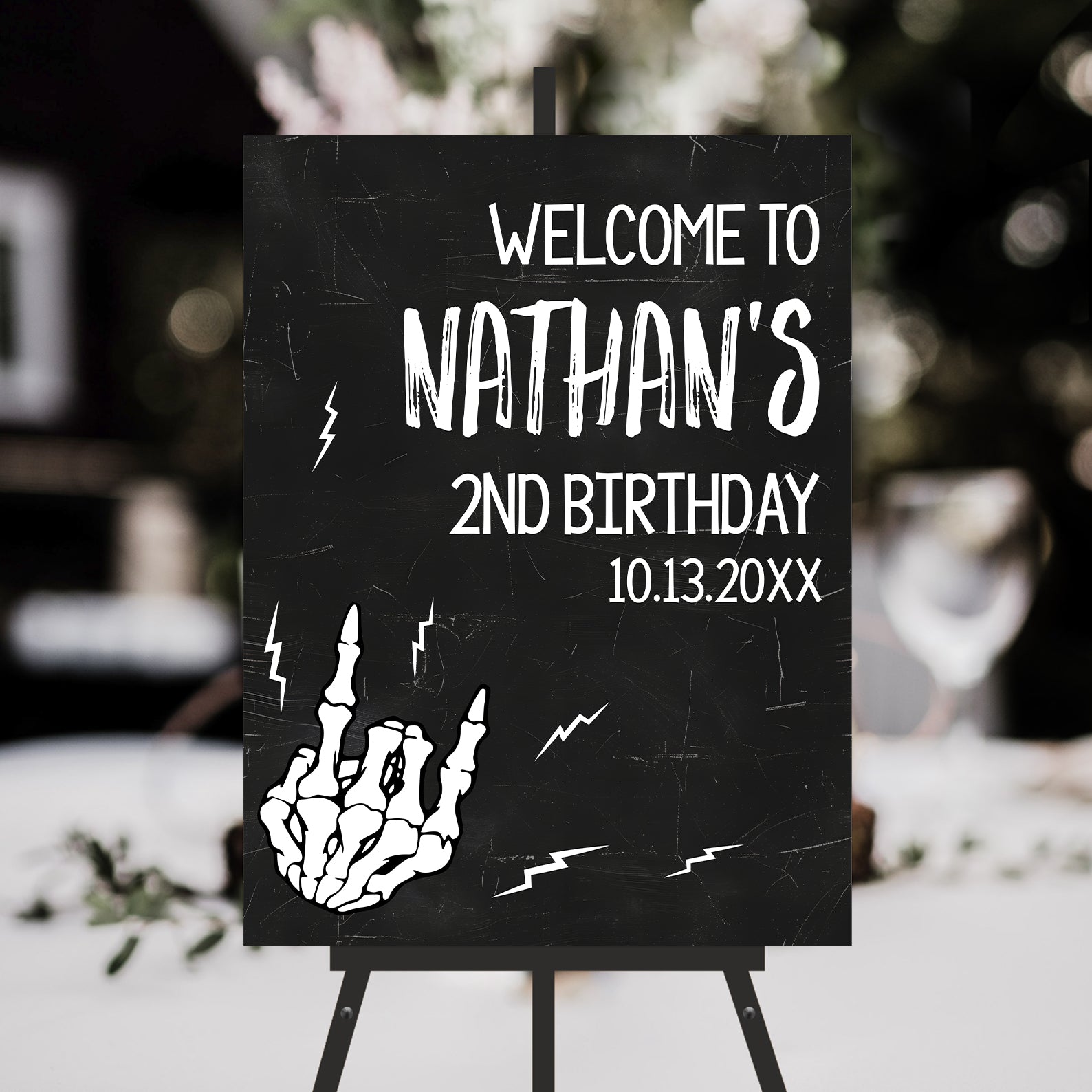 Kick off the spooky fun with our Bad to the Bone 2nd Birthday Welcome Sign! Designed with a bold black background and edgy Halloween vibes, this sign features a playful skeleton rock-and-roll hand gesture, accented with electrifying thunderbolts. Perfect for greeting guests at the entrance of your little one's Halloween-themed celebration, this welcome sign sets the tone for a party full of fun and fright. With its eye-catching design and festive flair, it’s the perfect statement piece for your rockin’ birthday bash!