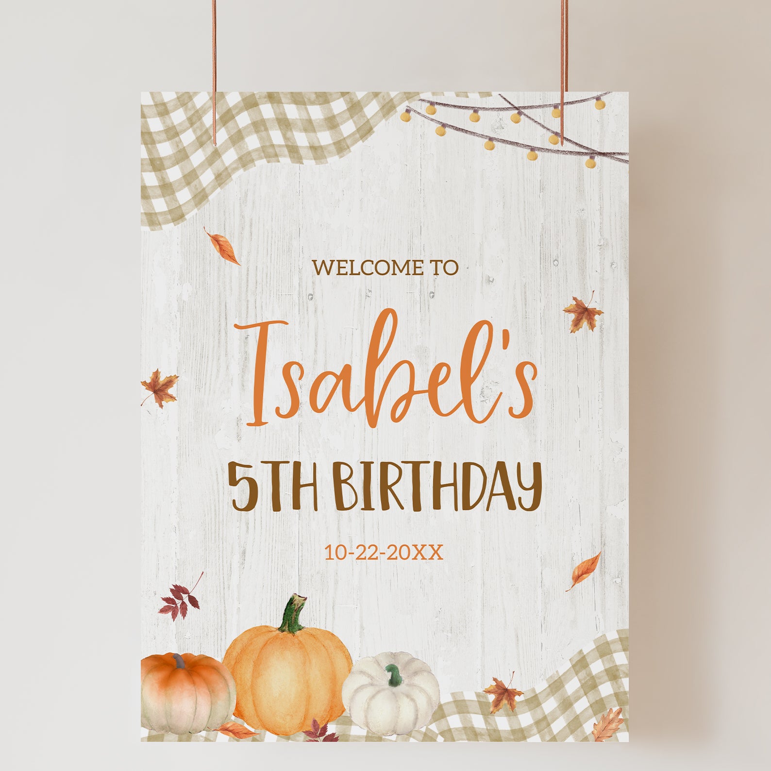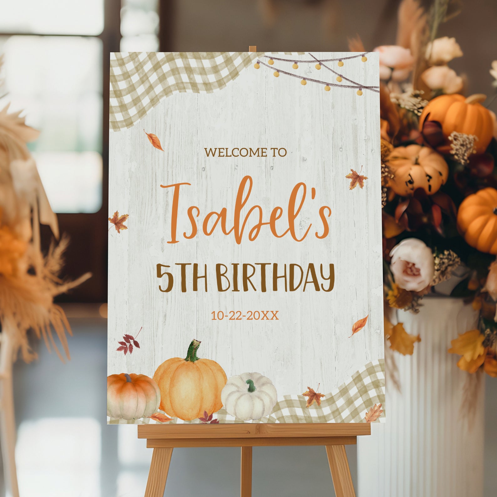 1. Purchase this Fall Harvest 5th Birthday Welcome Sign: Pumpkins, Plaid & Leaves template