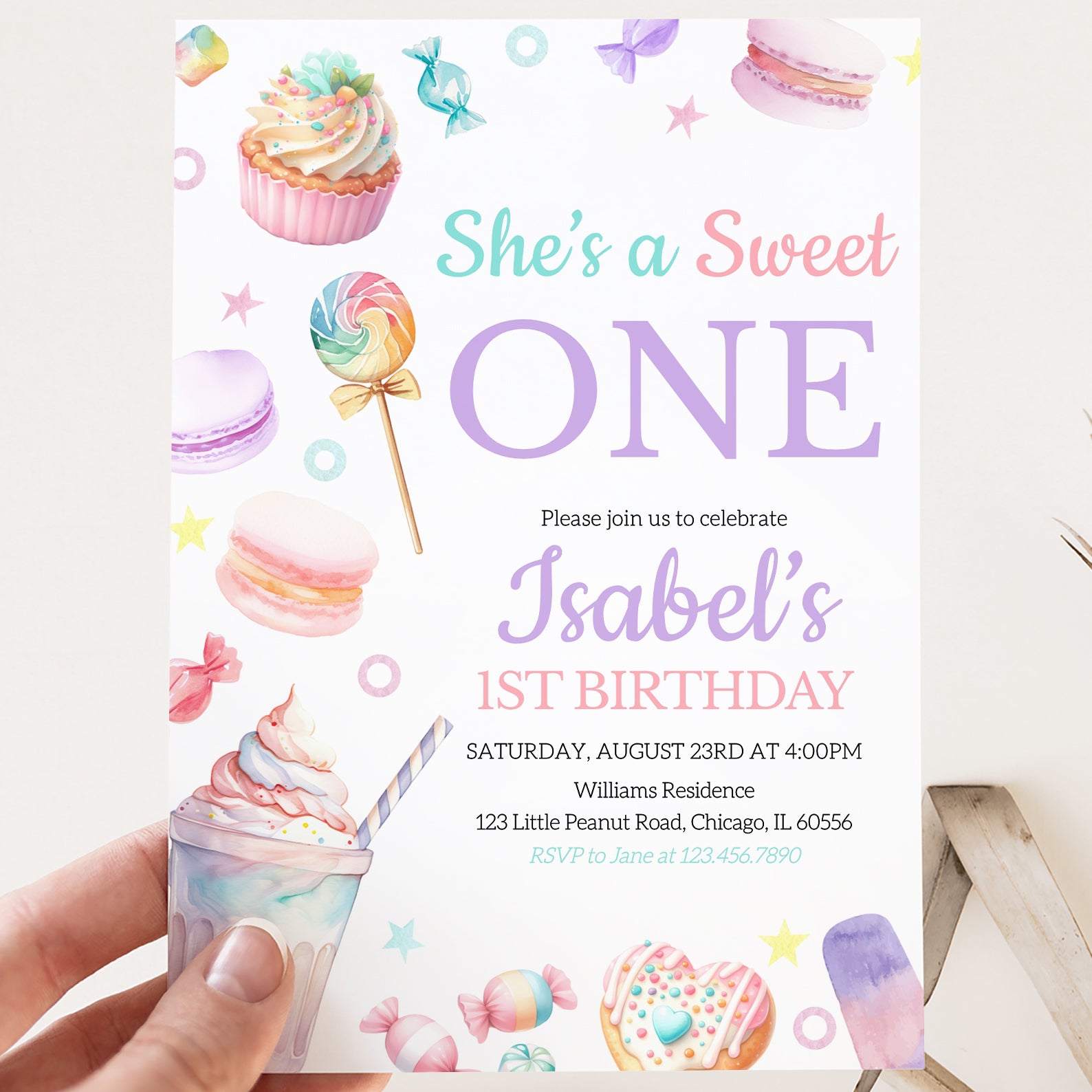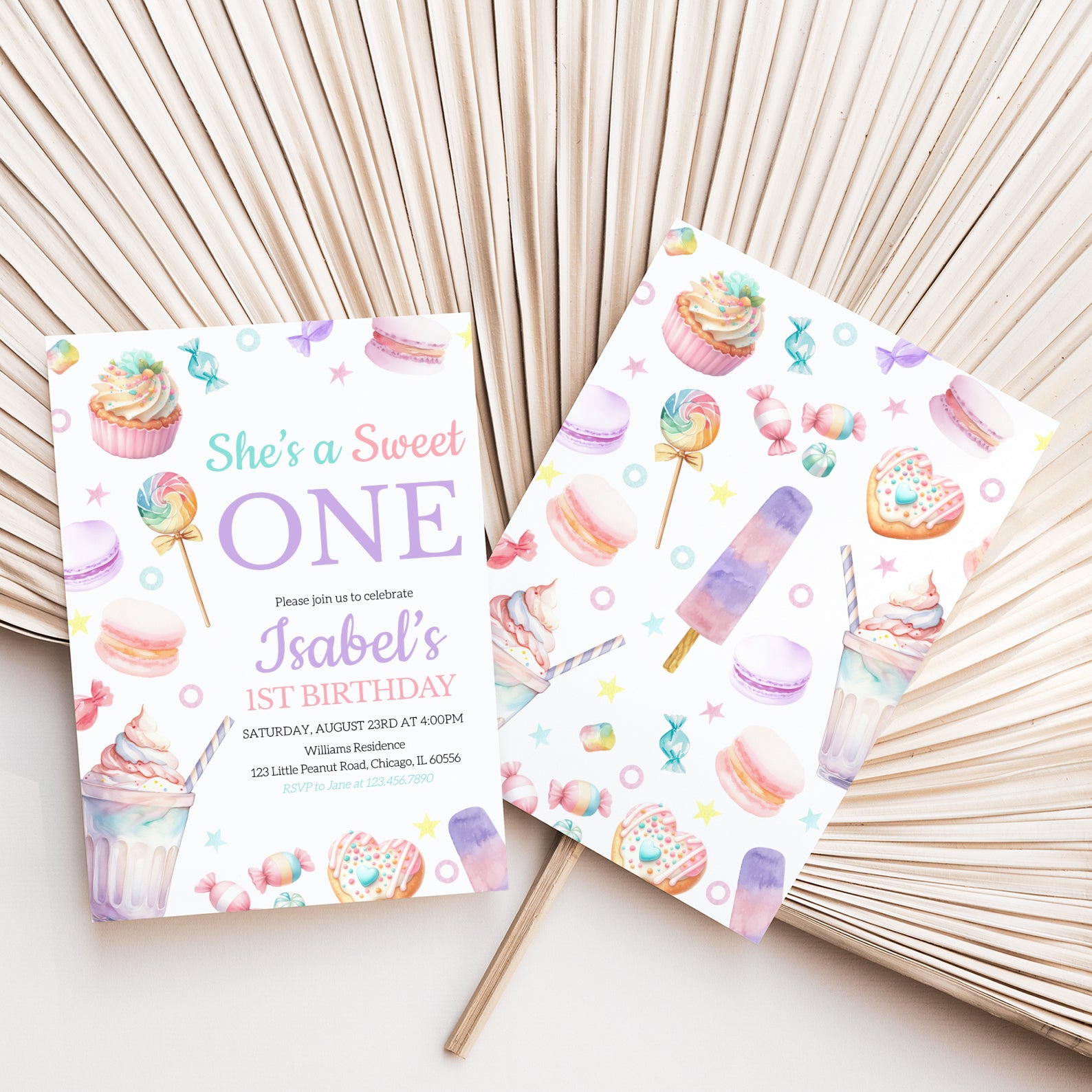 Celebrate your little one's special day with our delightful summer birthday digital invitation, designed for the sweetest of celebrations! Featuring an enchanting array of macarons, candies, cupcakes, milkshakes, and cookies, this vibrant invitation sets the perfect tone for a fun-filled party. Easy to customize and send, it’s the ideal way to invite friends and family to join in the festivities. Make her birthday unforgettable with this charming and whimsical design that captures the joy of childhood!