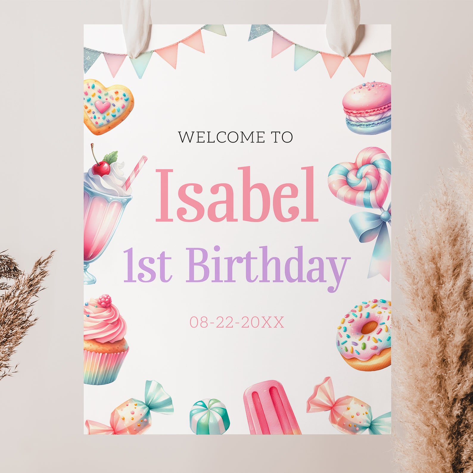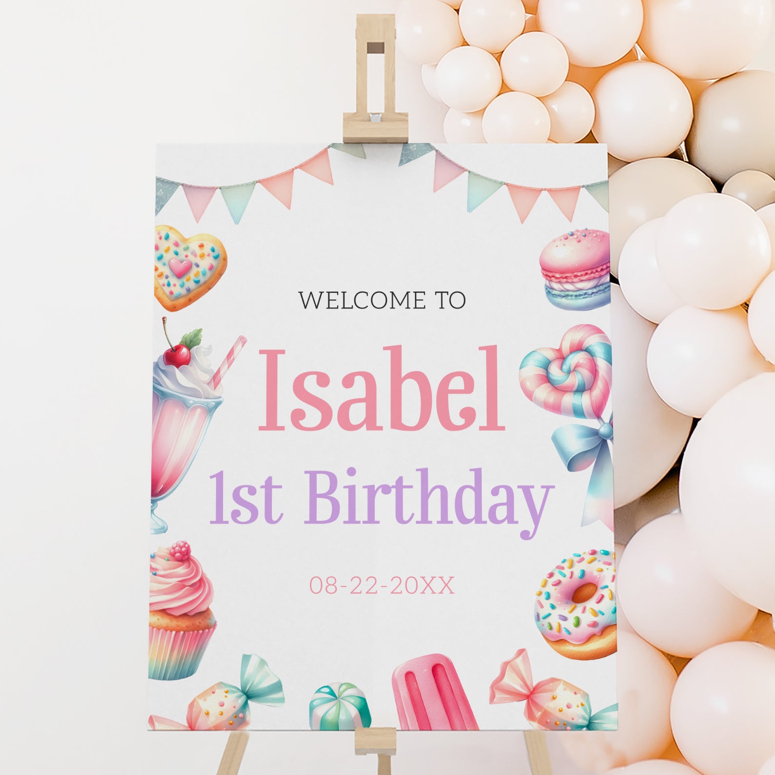 Set the tone for a sweet celebration with our summer birthday welcome sign! Featuring a cheerful watercolor banner at the top and surrounded by an irresistible array of goodies—like cookies, cupcakes, strawberry milkshakes, lollipops, and more—this vibrant sign is perfect for welcoming guests to your little one’s first birthday. The playful design captures the magic of childhood and adds a whimsical, candy-coated touch to your party entrance or dessert table. Editable and easy to display, it's a delightful way to kick off a day filled with fun and treats!
