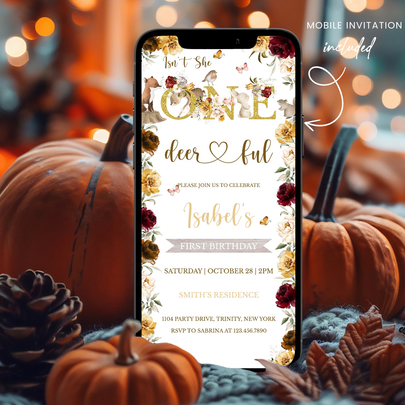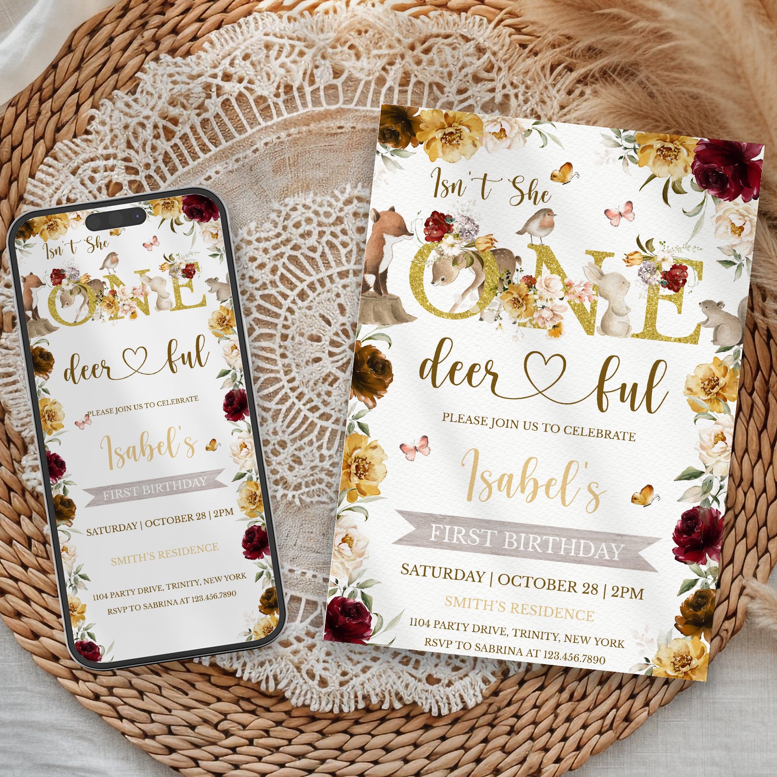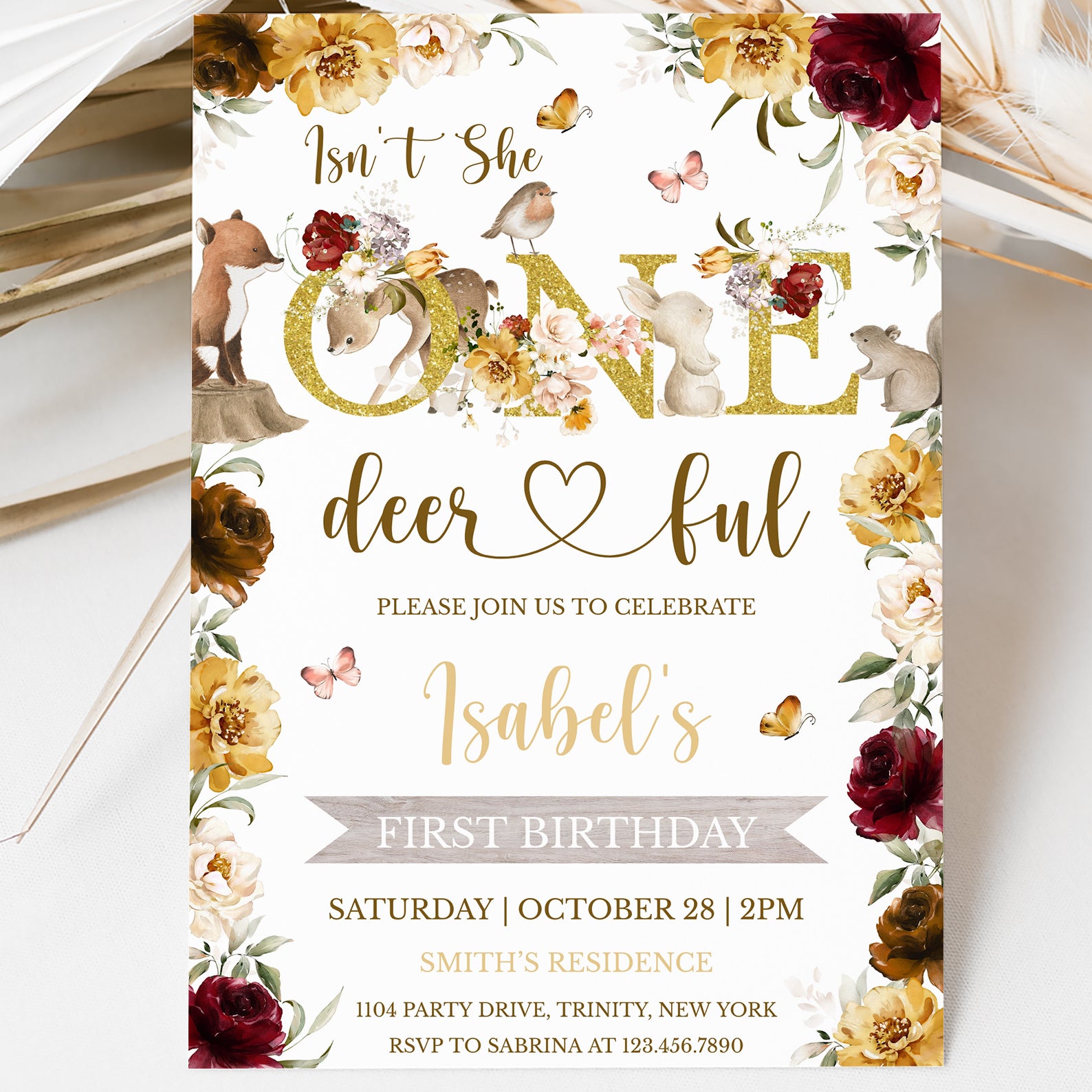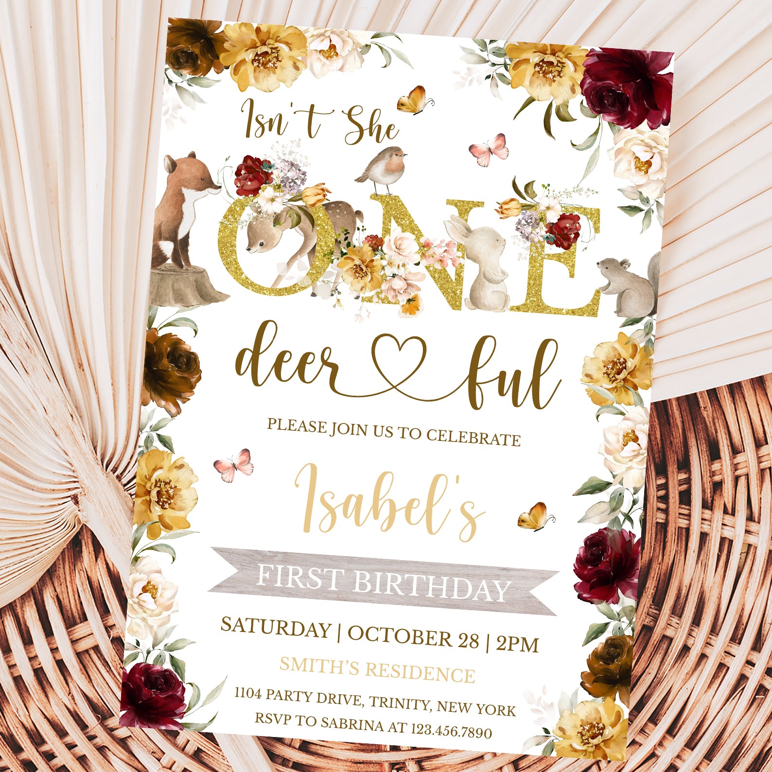 Celebrate your little one's first birthday with our enchanting "Isn't She One Deerful" digital invitation! This beautifully designed invite features a charming gold theme adorned with a delightful floral border and whimsical woodland animals, including a fox, deer, bird, rabbit, squirrel, and fluttering butterflies. Perfect for a fall birthday, this invitation sets the tone for a magical celebration, inviting friends and family to join in the fun as you commemorate this special milestone. Make your child's first birthday unforgettable with this captivating invitation that captures the essence of childhood wonder!