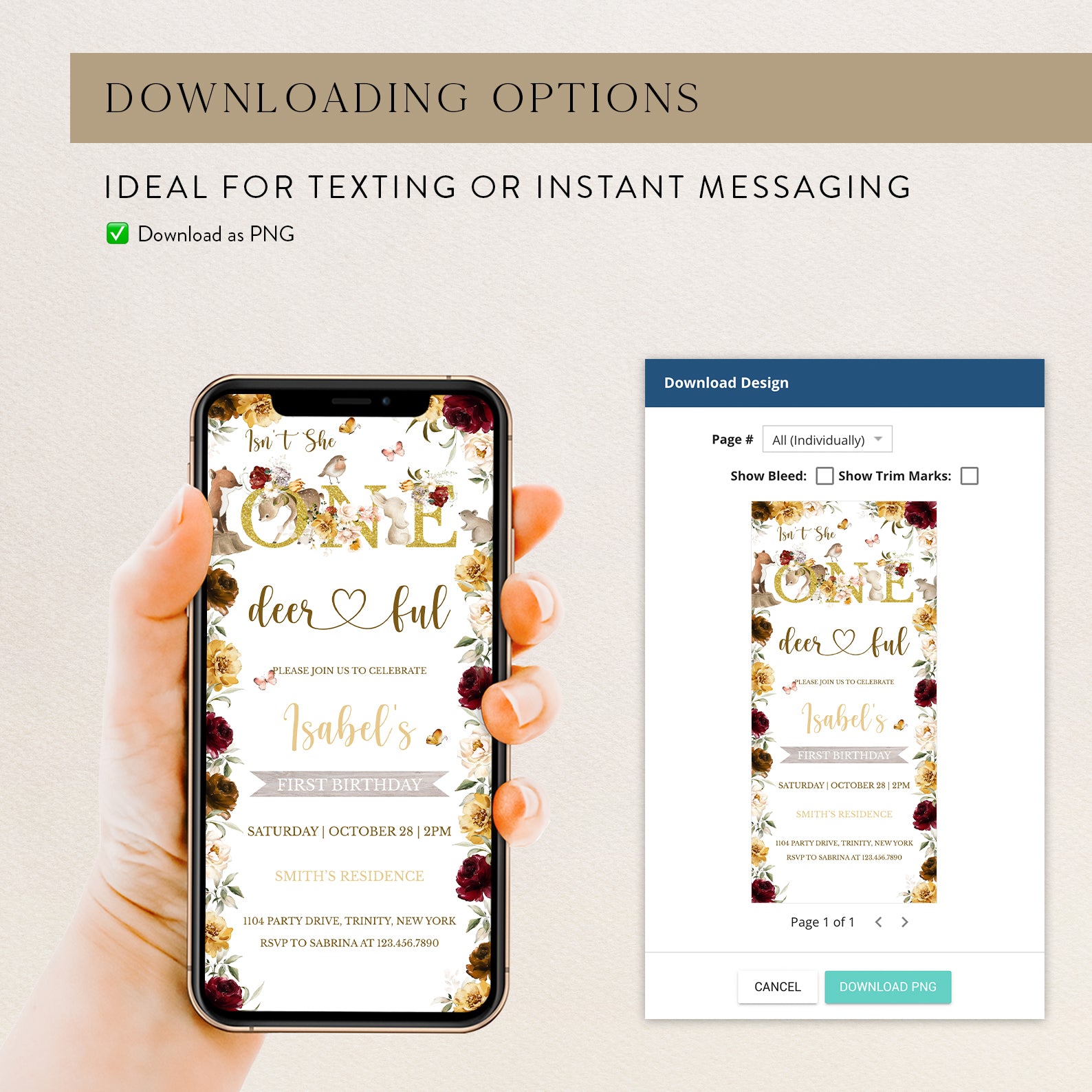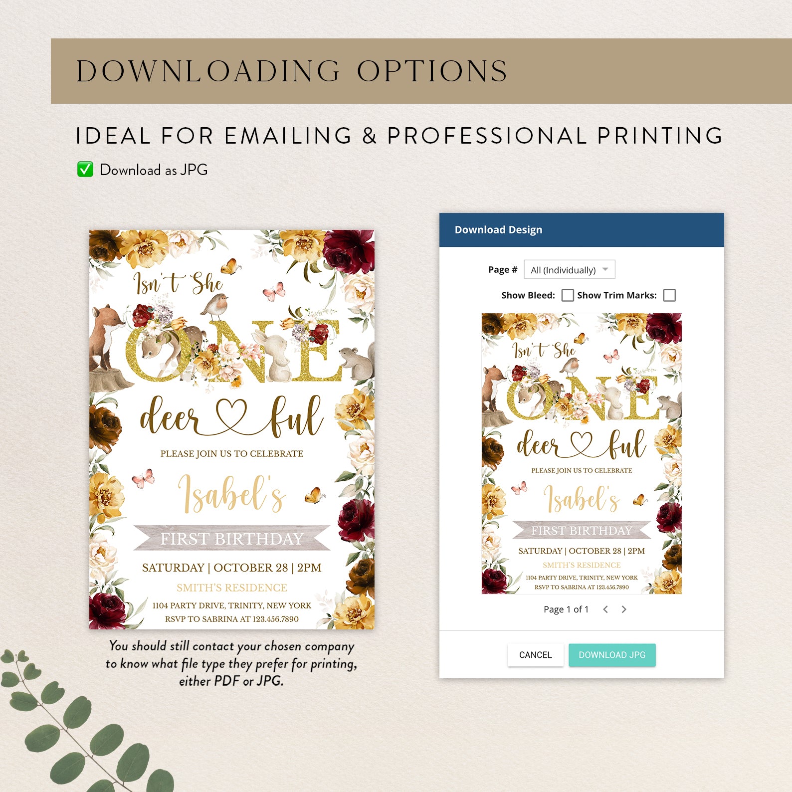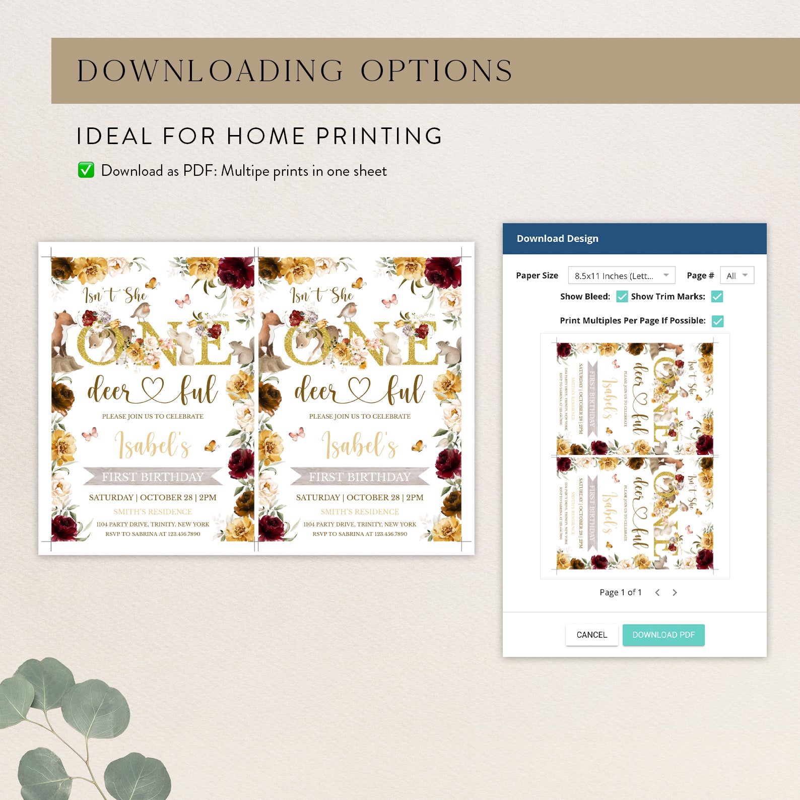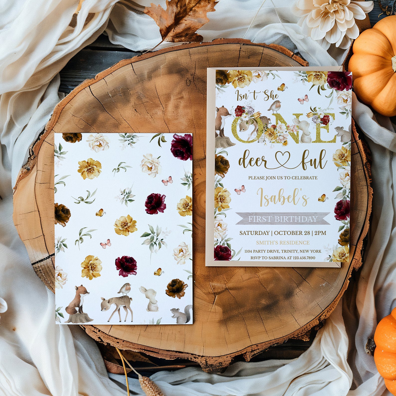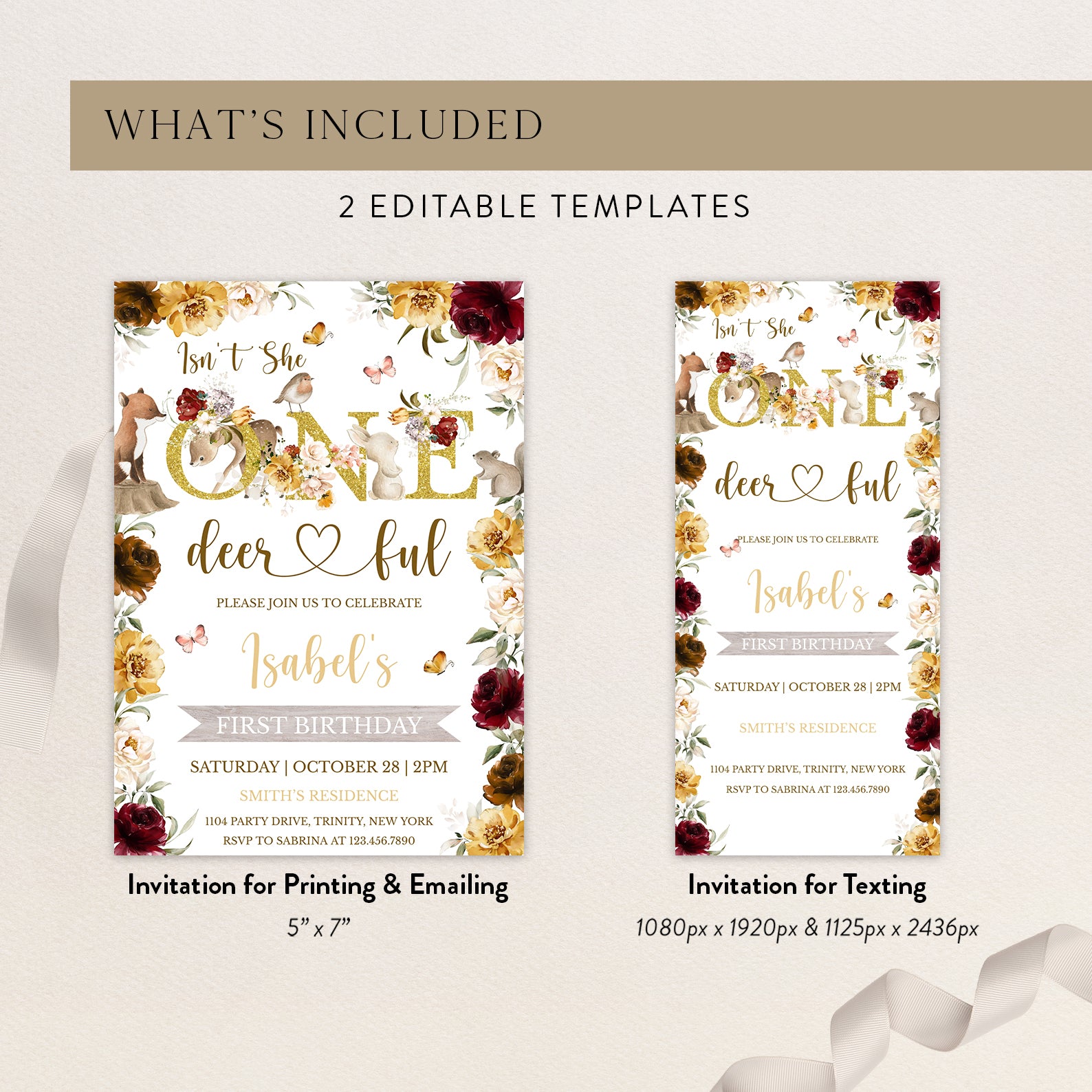 - Purchase this Isn’t She One Deerful: Woodland 1st Birthday Invite template