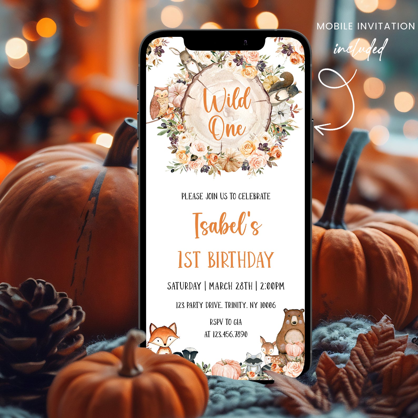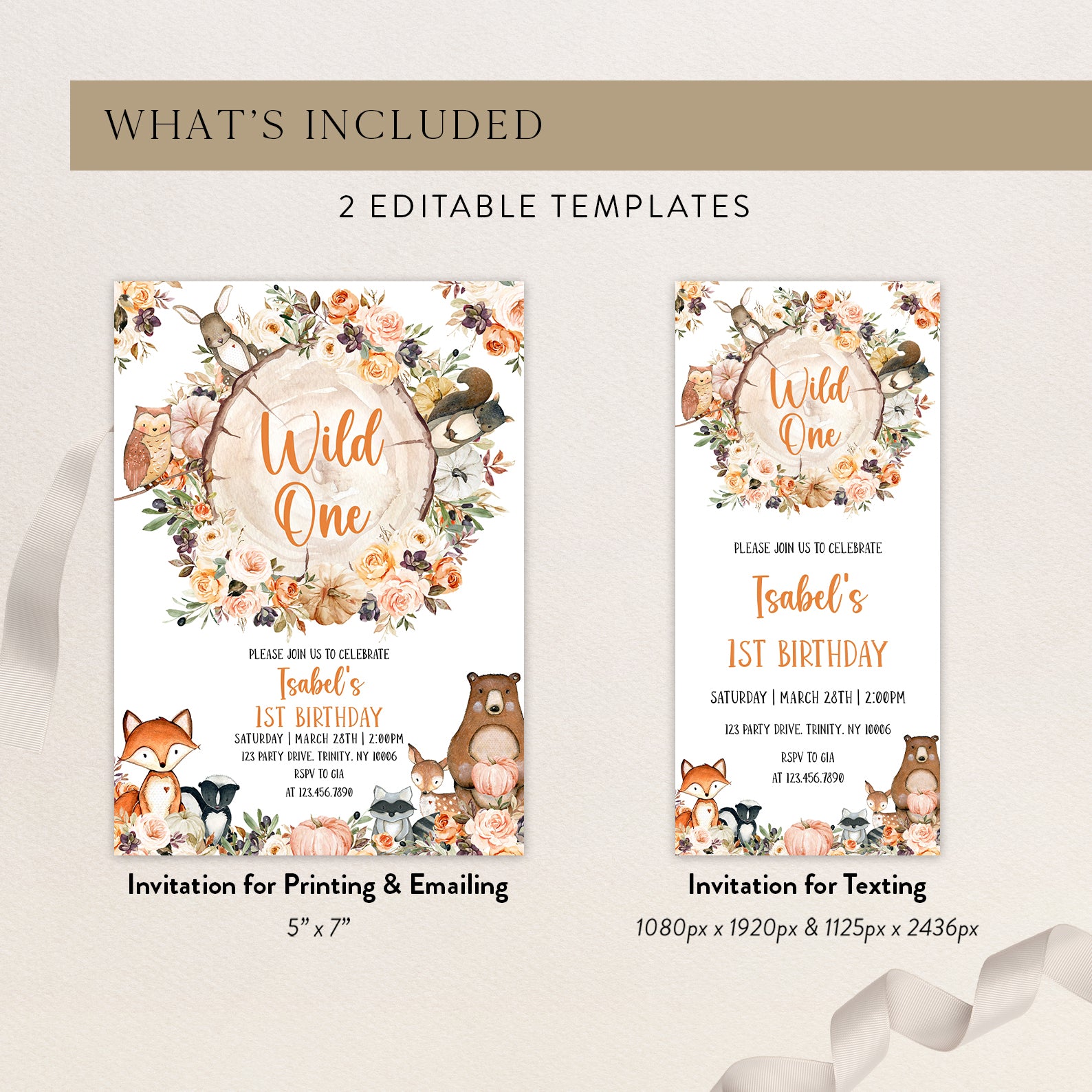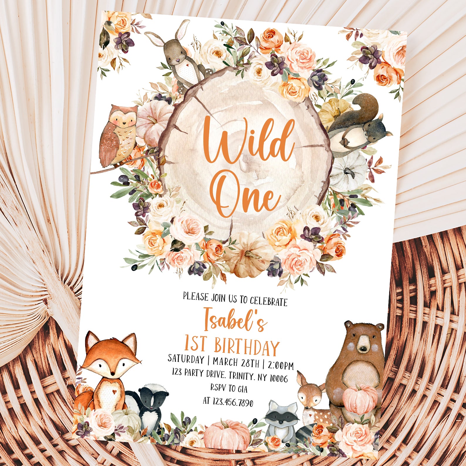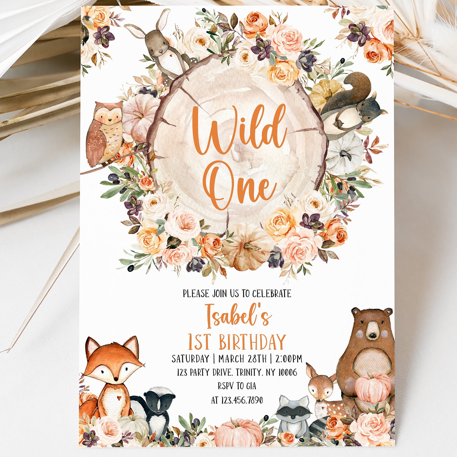- Purchase this Wild One Fall Birthday Invitation: Woodland Animals & Pumpkin template