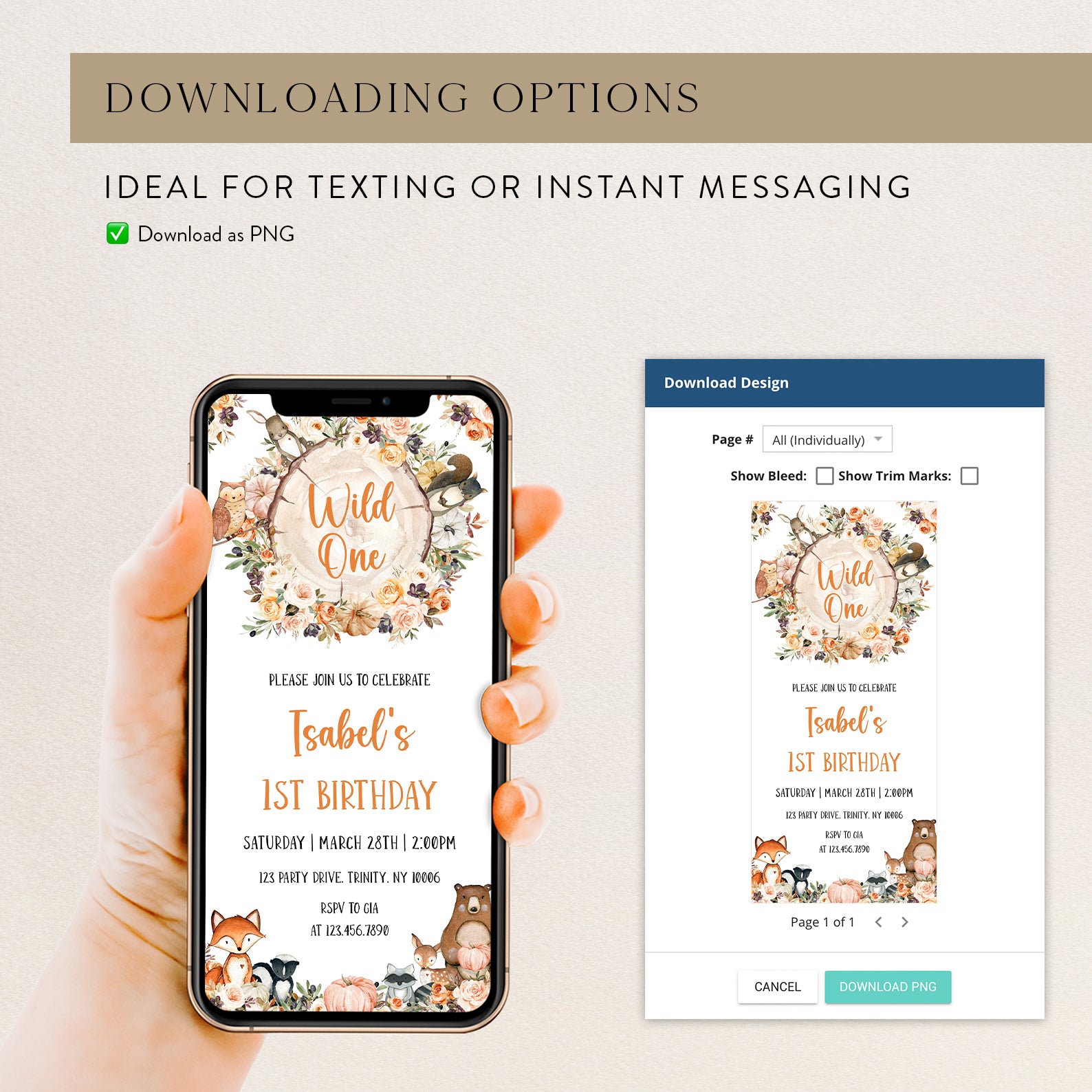 Celebrate your little one's first birthday with our enchanting Fall Birthday Digital Invitation, perfect for a "Wild One" theme! This charming design features a top view of a rustic log slice surrounded by vibrant roses, pumpkins, and adorable woodland creatures like an owl, squirrel, and rabbit. The invitation is beautifully framed with floral accents at the top corners and playful illustrations of a fox, skunk, raccoon, deer, and bear at the bottom, creating a whimsical atmosphere that captures the essence of autumn. Make your child's special day unforgettable with this delightful invitation that sets the tone for a fun-filled celebration!