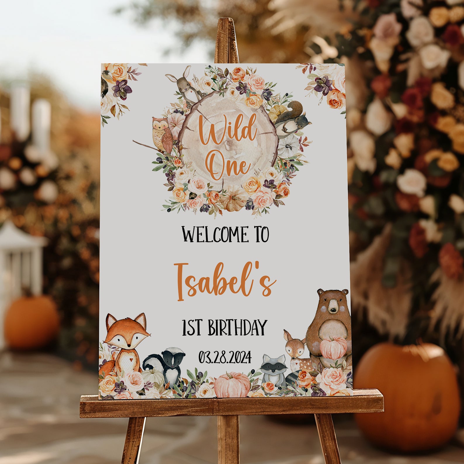- Purchase this Wild One Fall Birthday Welcome Sign: Woodland Animals & Pumpkin template