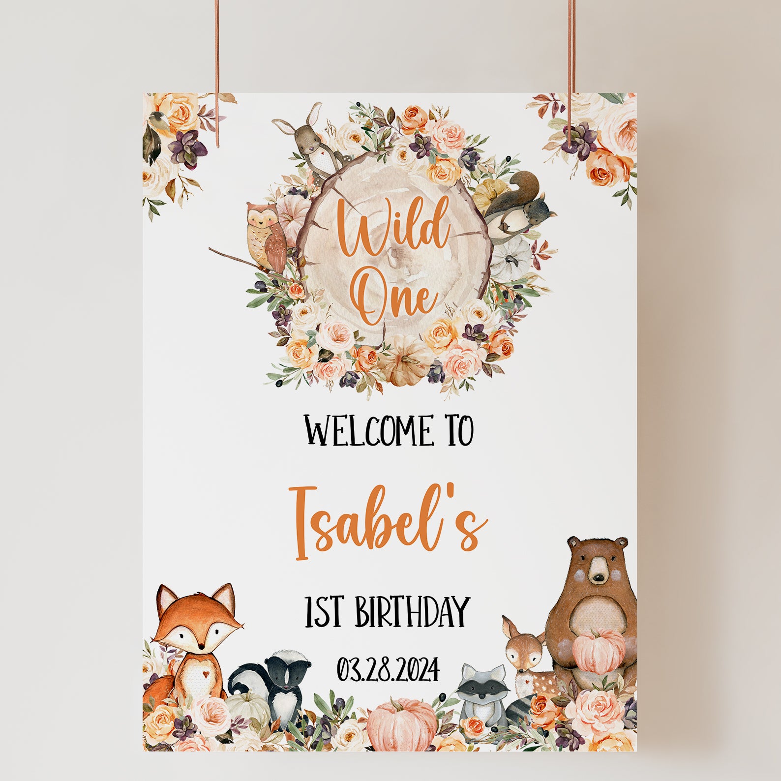 Welcome guests to a cozy woodland celebration with our charming 'Wild One' Fall Birthday Welcome Sign! Designed in a warm orange theme, this delightful sign features a rustic top-view log slice at the center, beautifully surrounded by fall roses, pumpkins, and sweet woodland animals like an owl, squirrel, and rabbit. The top corners are accented with seasonal florals, while the bottom showcases a playful gathering of a fox, skunk, raccoon, deer, and bear. With its whimsical autumn touches and inviting color palette, this sign sets the perfect tone for a first birthday party full of wonder and woodland magic!