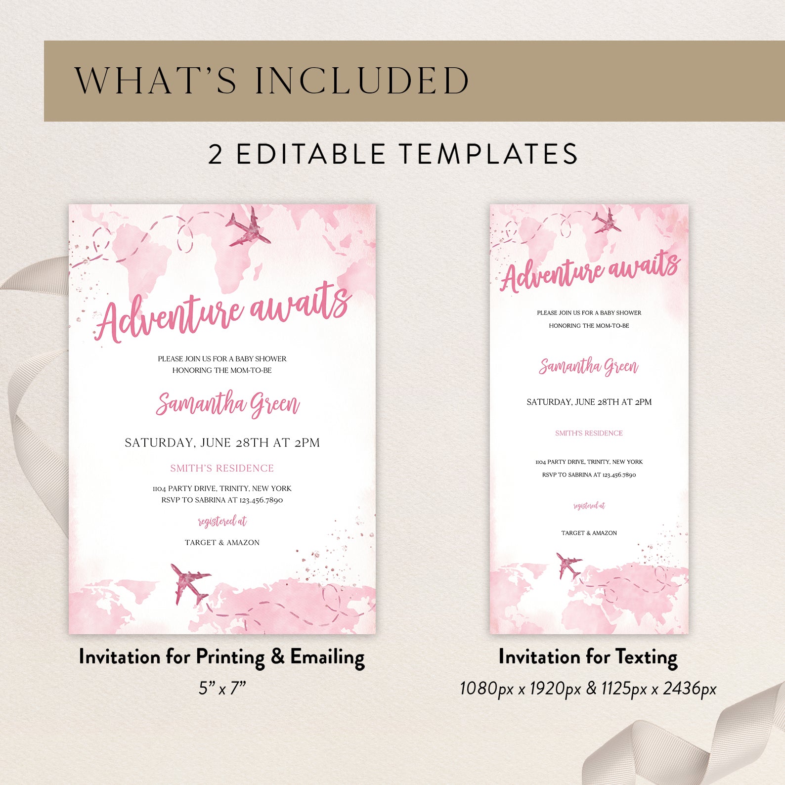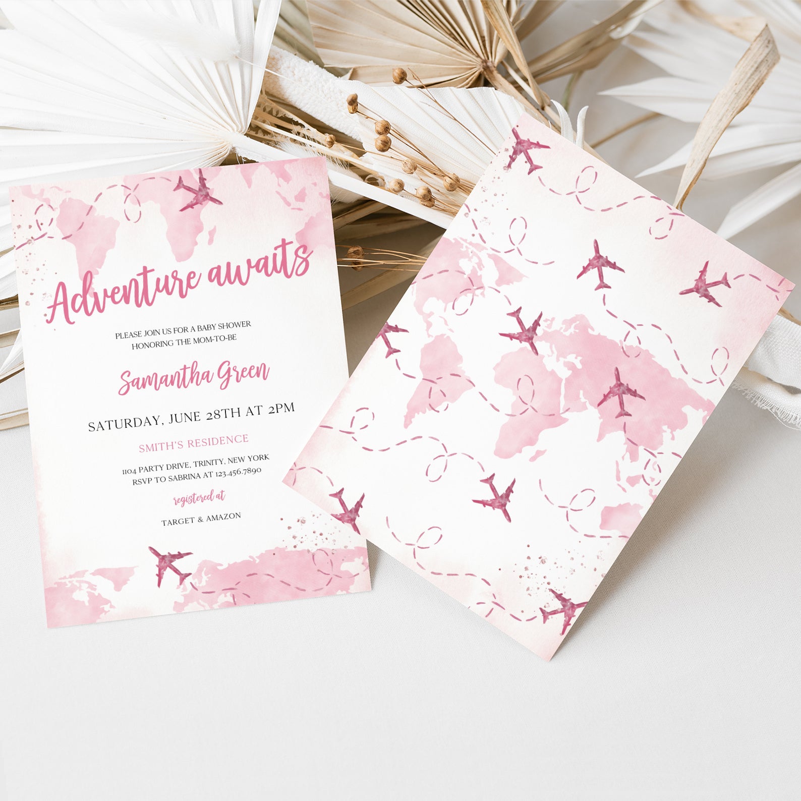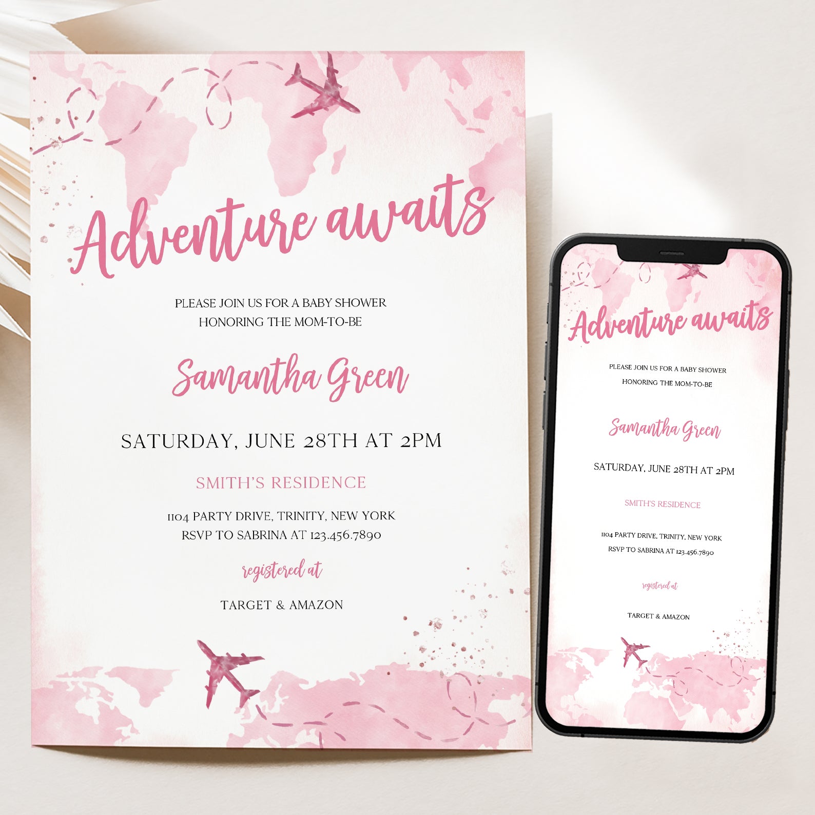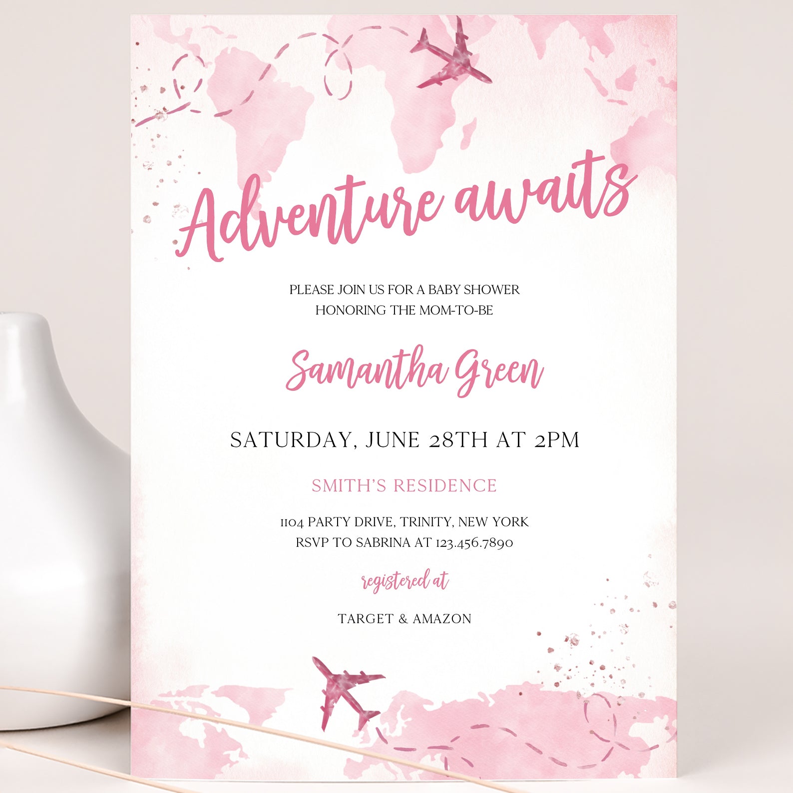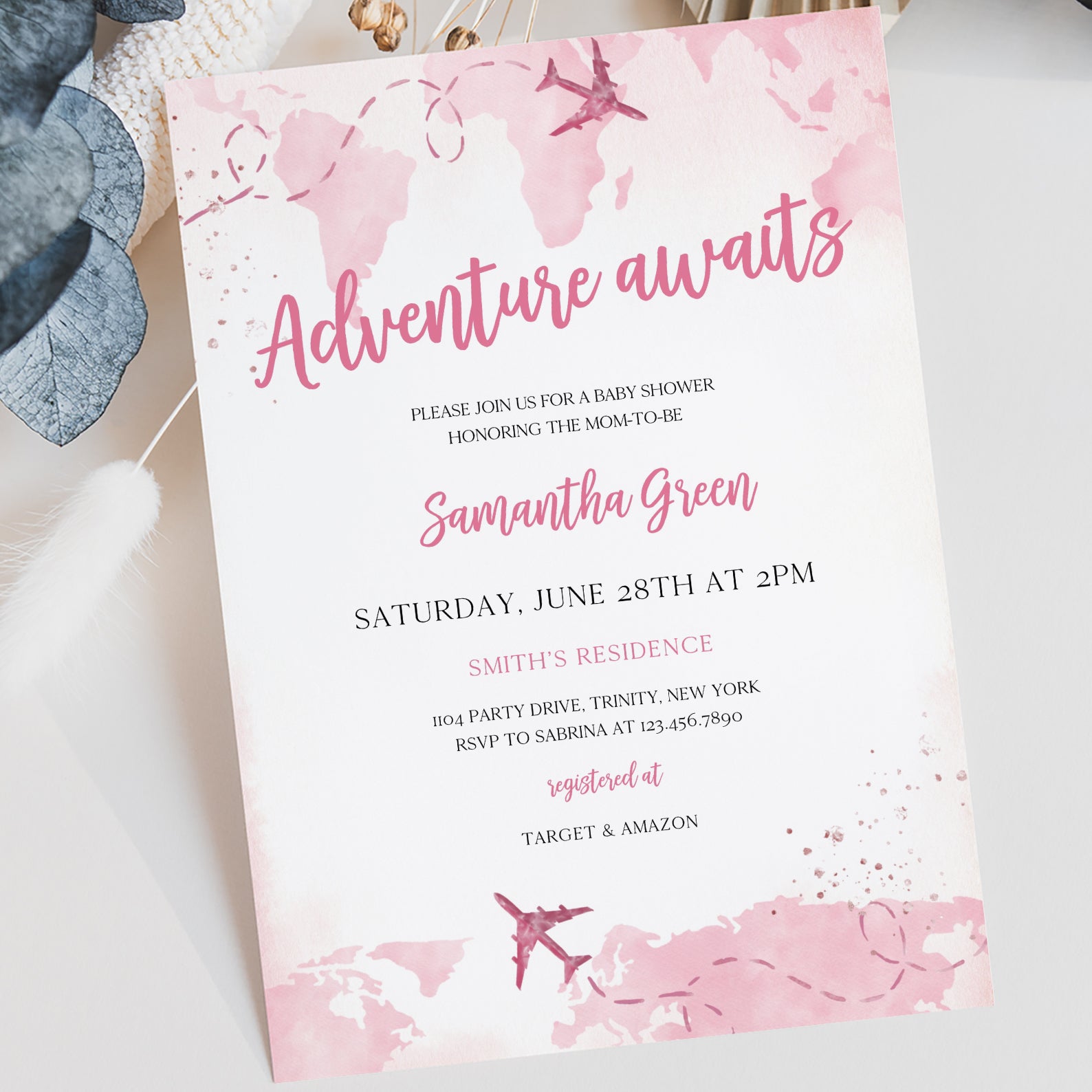 - Purchase this Adventure Awaits Baby Shower Digital Invite: Pink Travel Theme template