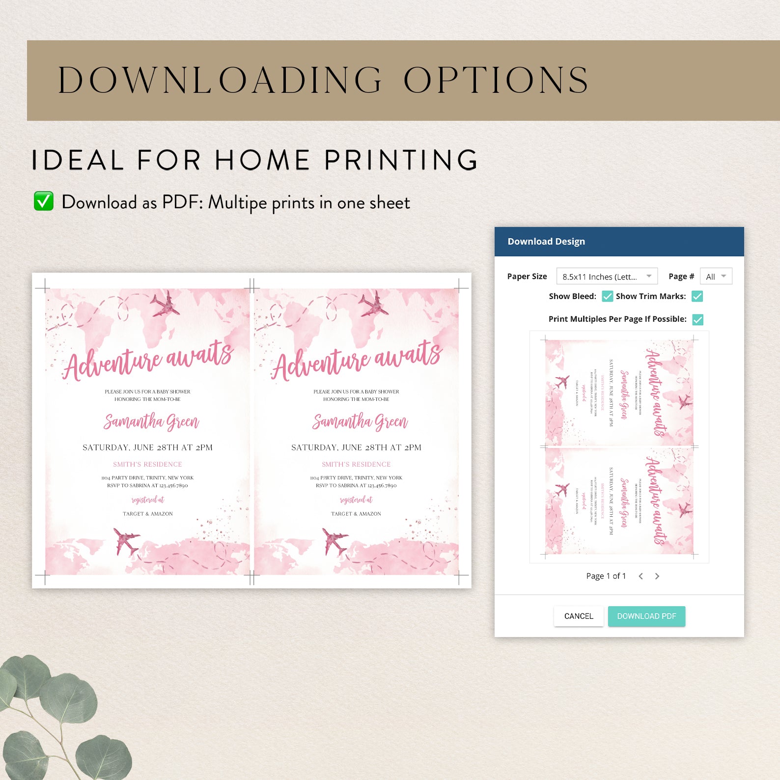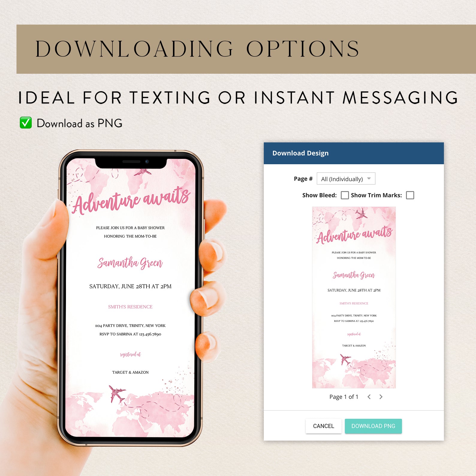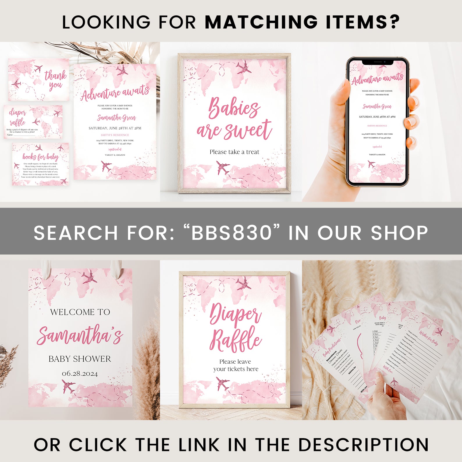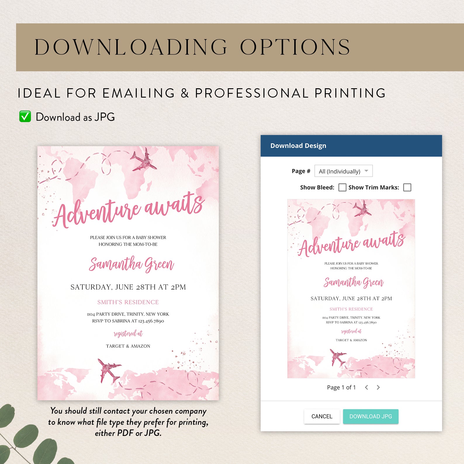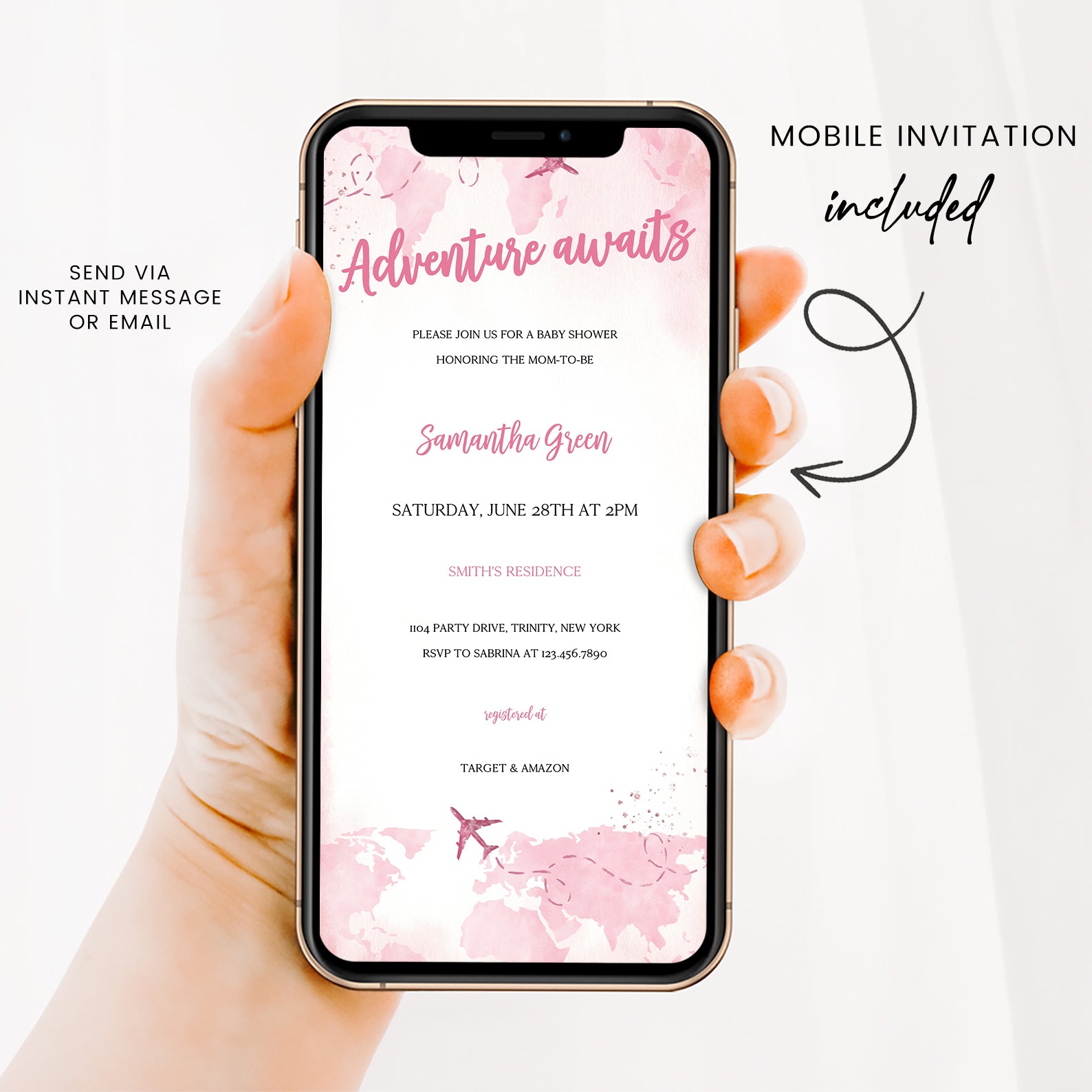 - Purchase this Adventure Awaits Baby Shower Digital Invite: Pink Travel Theme template