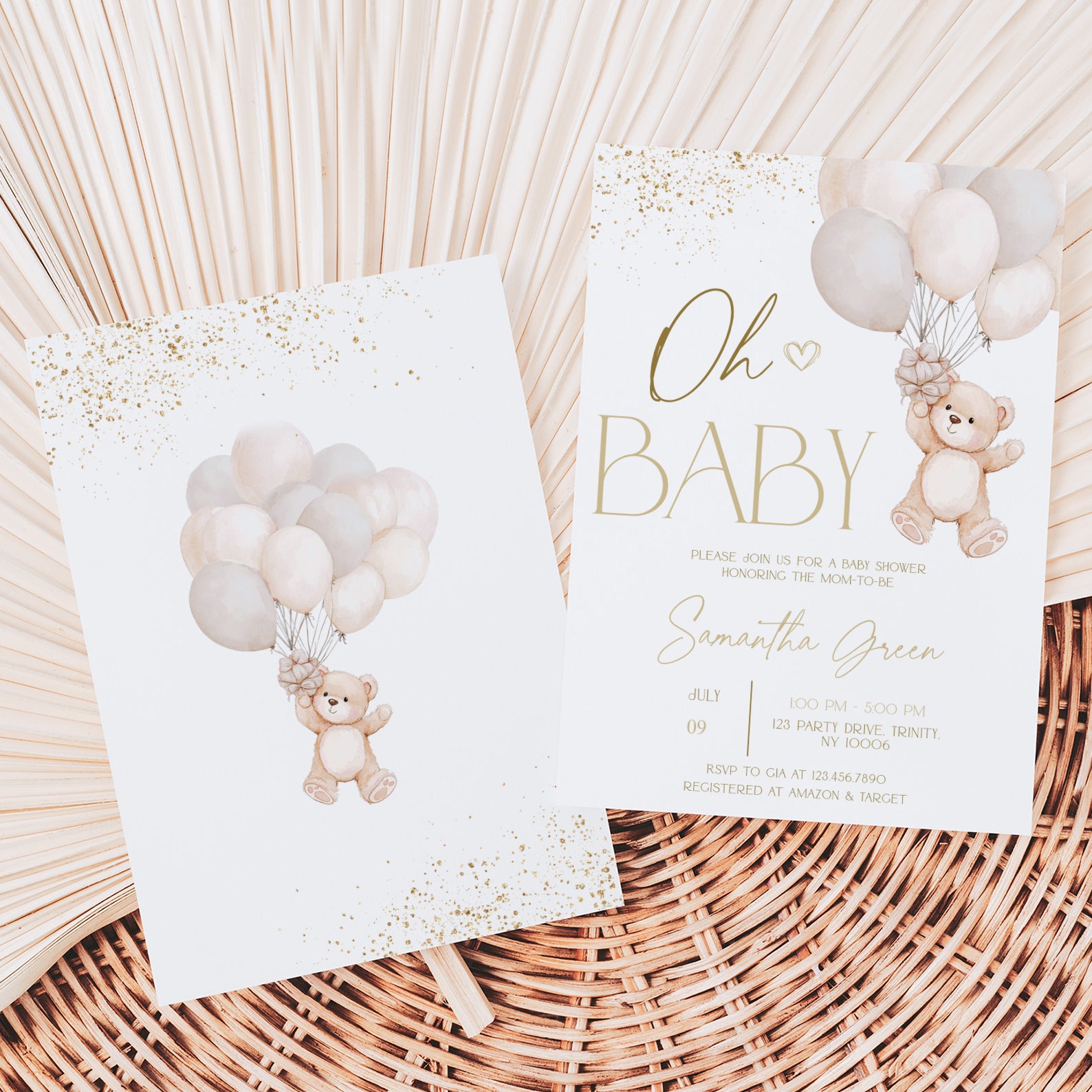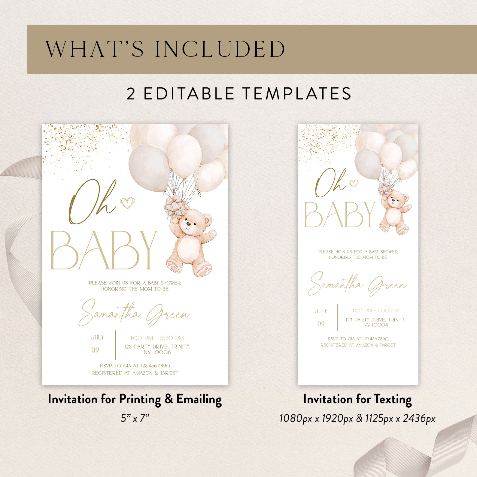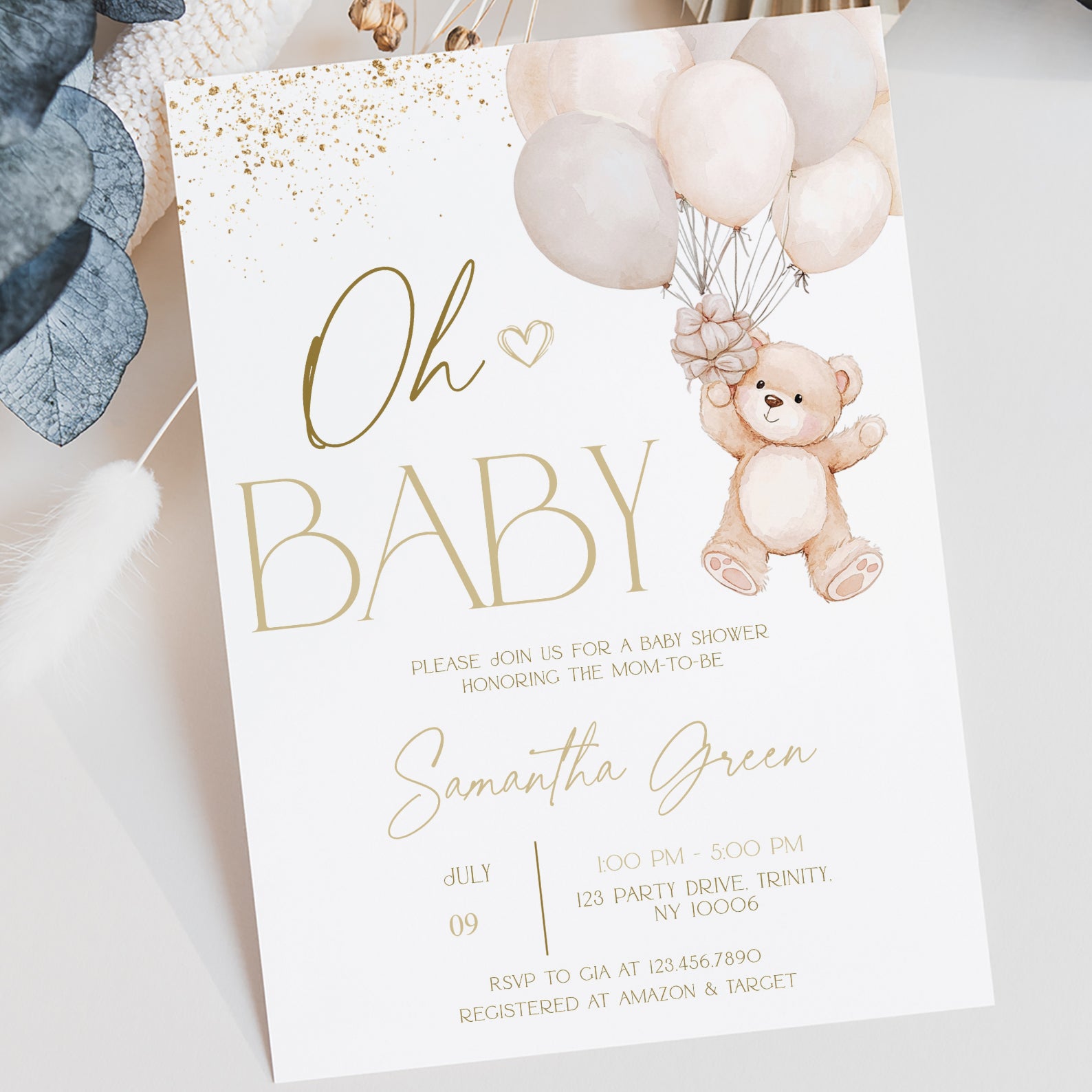 - Purchase this Baby Shower Digital Invite with Bear, Balloons & Gold Accents template