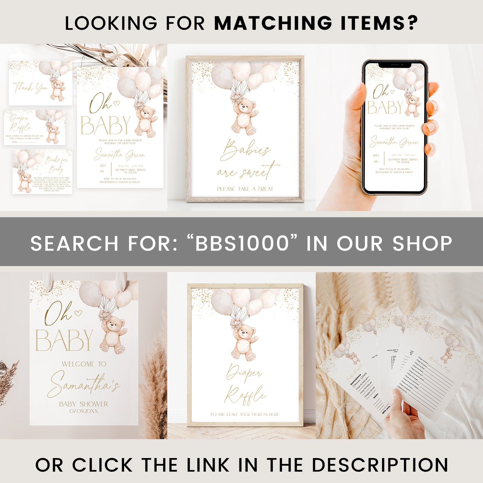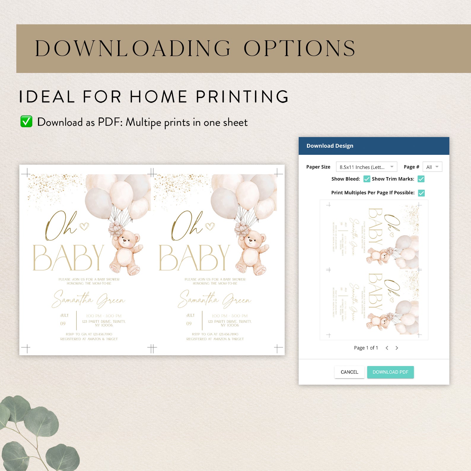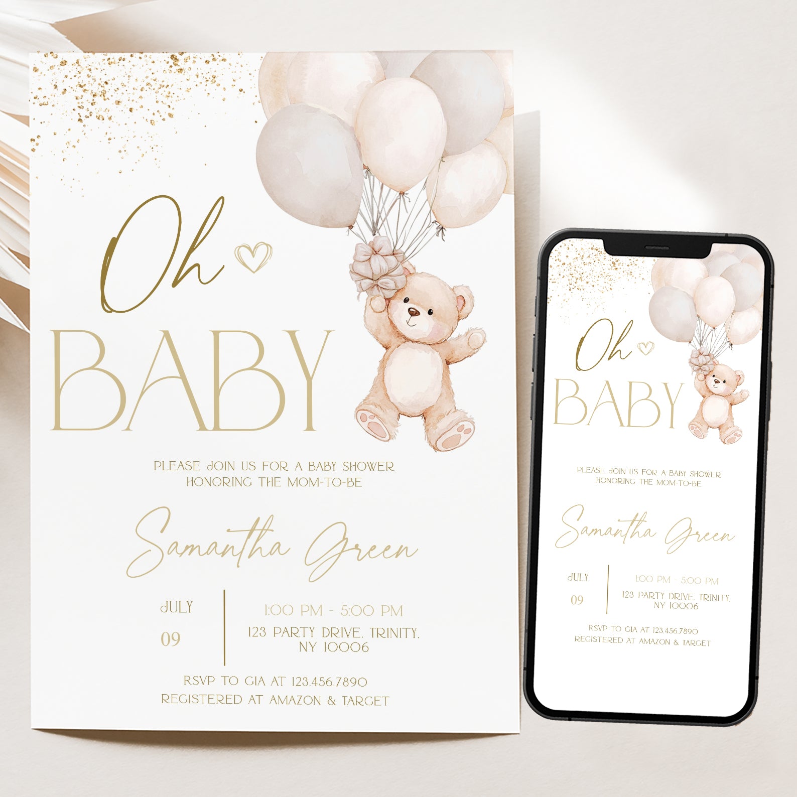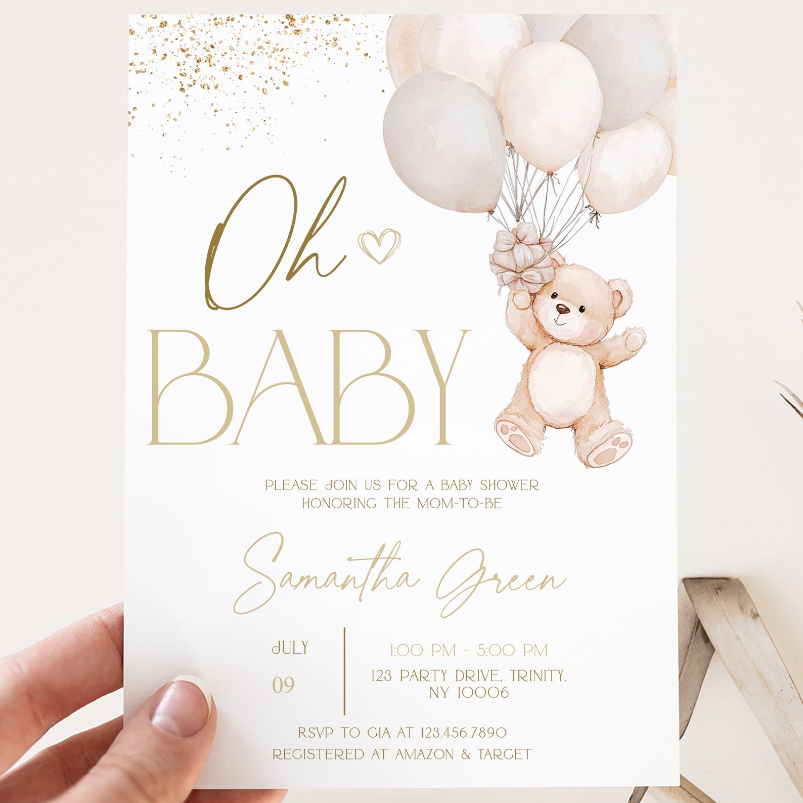 - Purchase this Baby Shower Digital Invite with Bear, Balloons & Gold Accents template