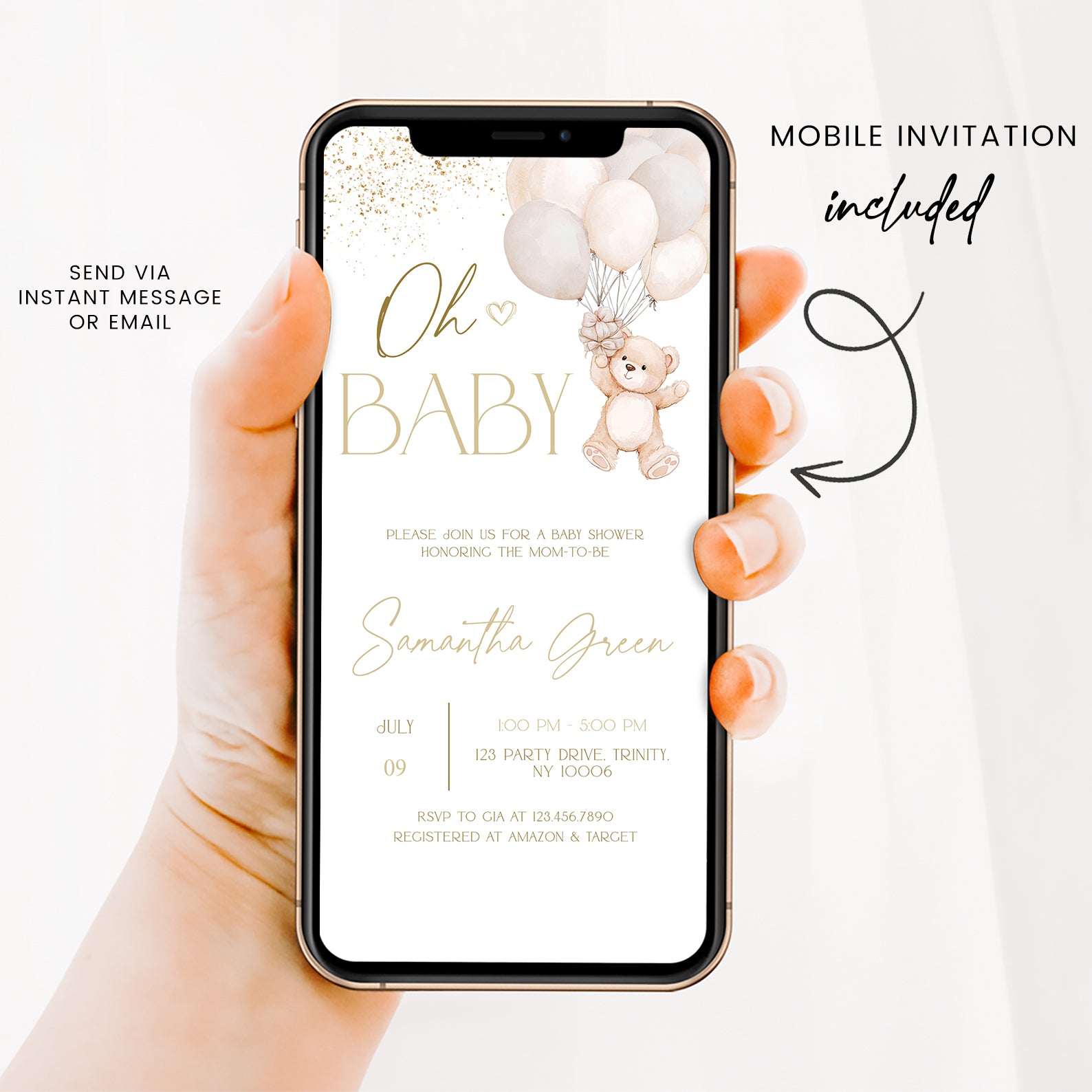 Baby Shower Digital Invite with Bear, Balloons & Gold Accents