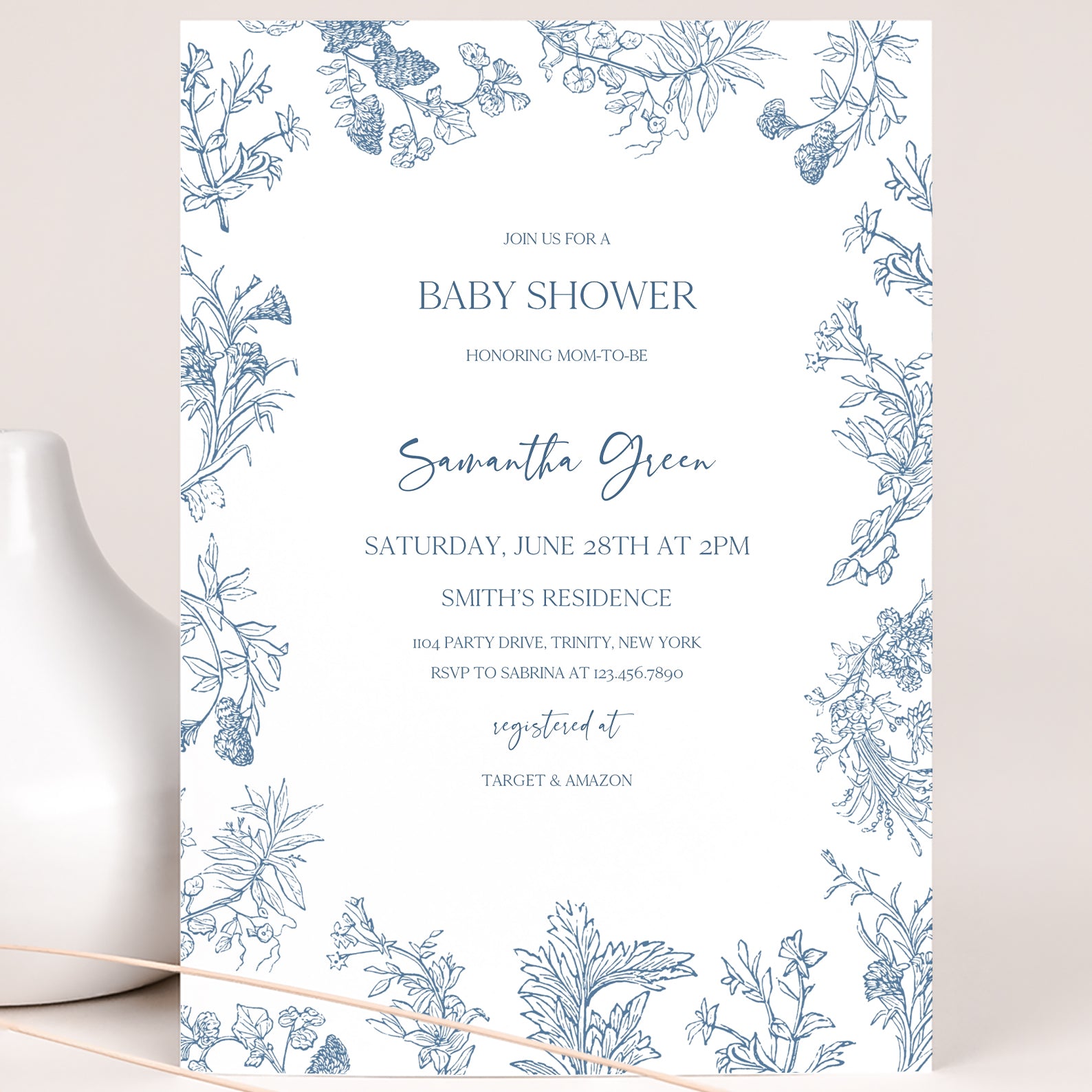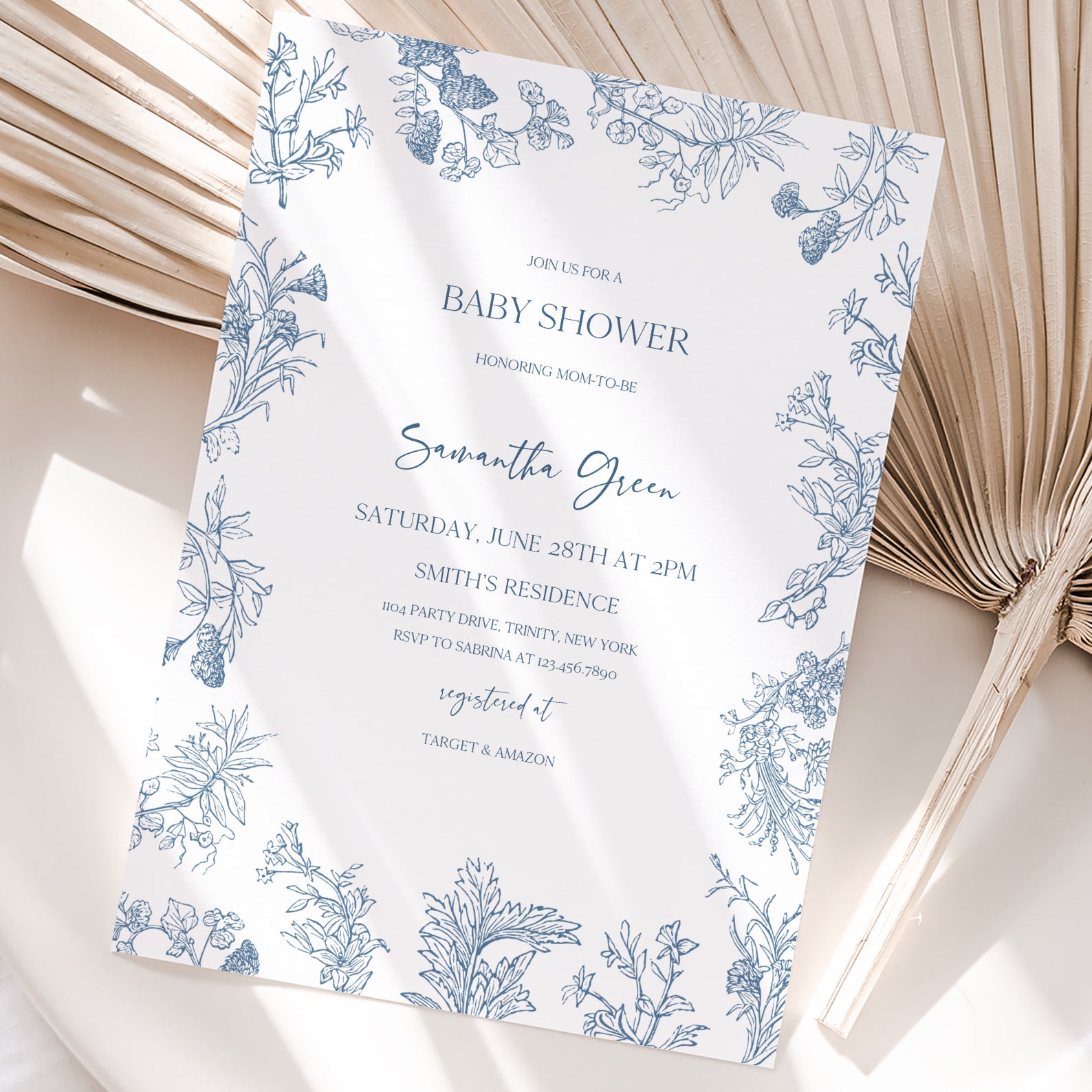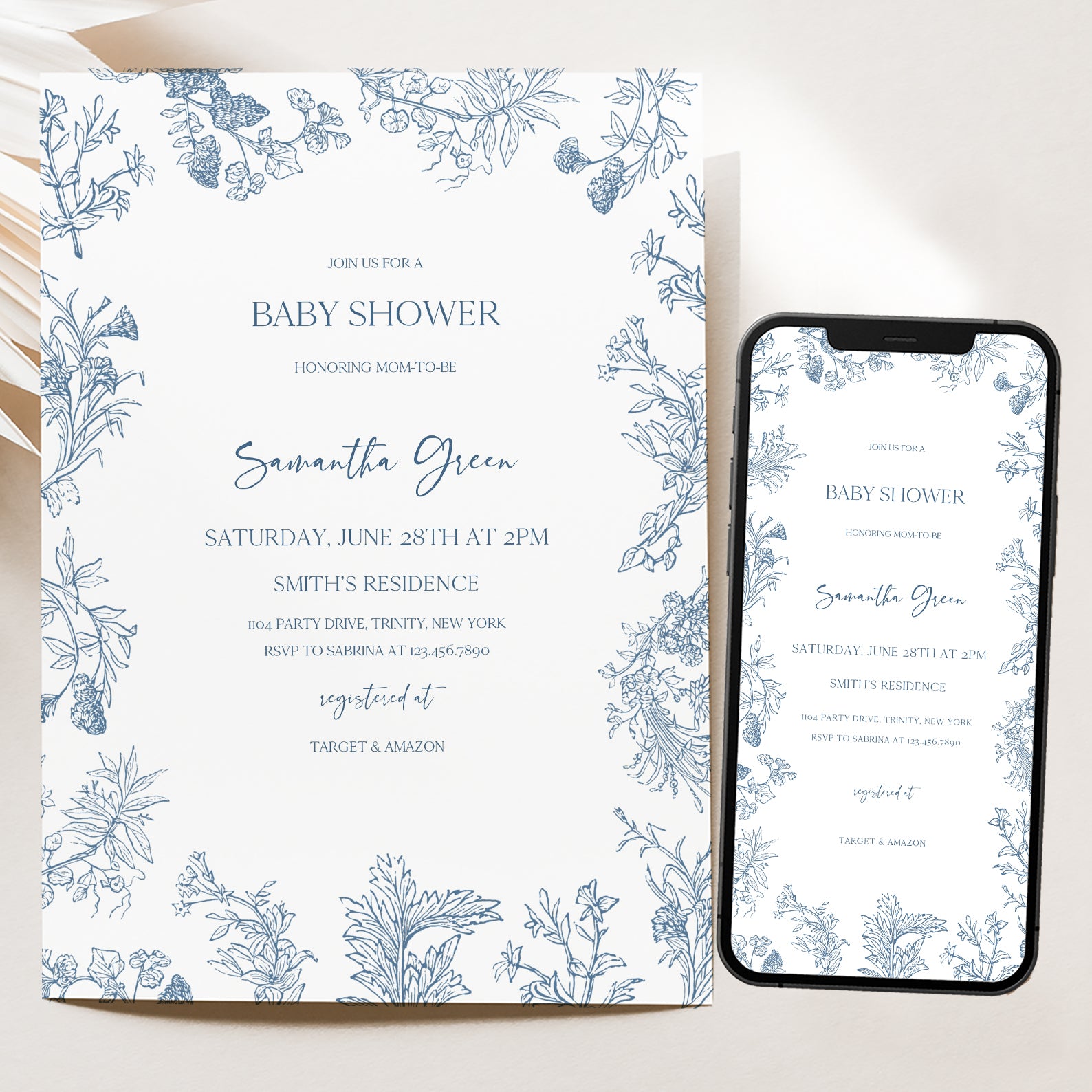 Elevate your baby shower with our stunning minimalist digital invitation, beautifully designed with an elegant blue floral pattern border. This charming blue-themed invitation sets the perfect tone for your celebration, combining simplicity with sophistication. Effortlessly customizable, it allows you to add your event details in a stylish format, making it easy to share with friends and family. Make your special day memorable with this exquisite invitation that captures the joy of welcoming your little one!