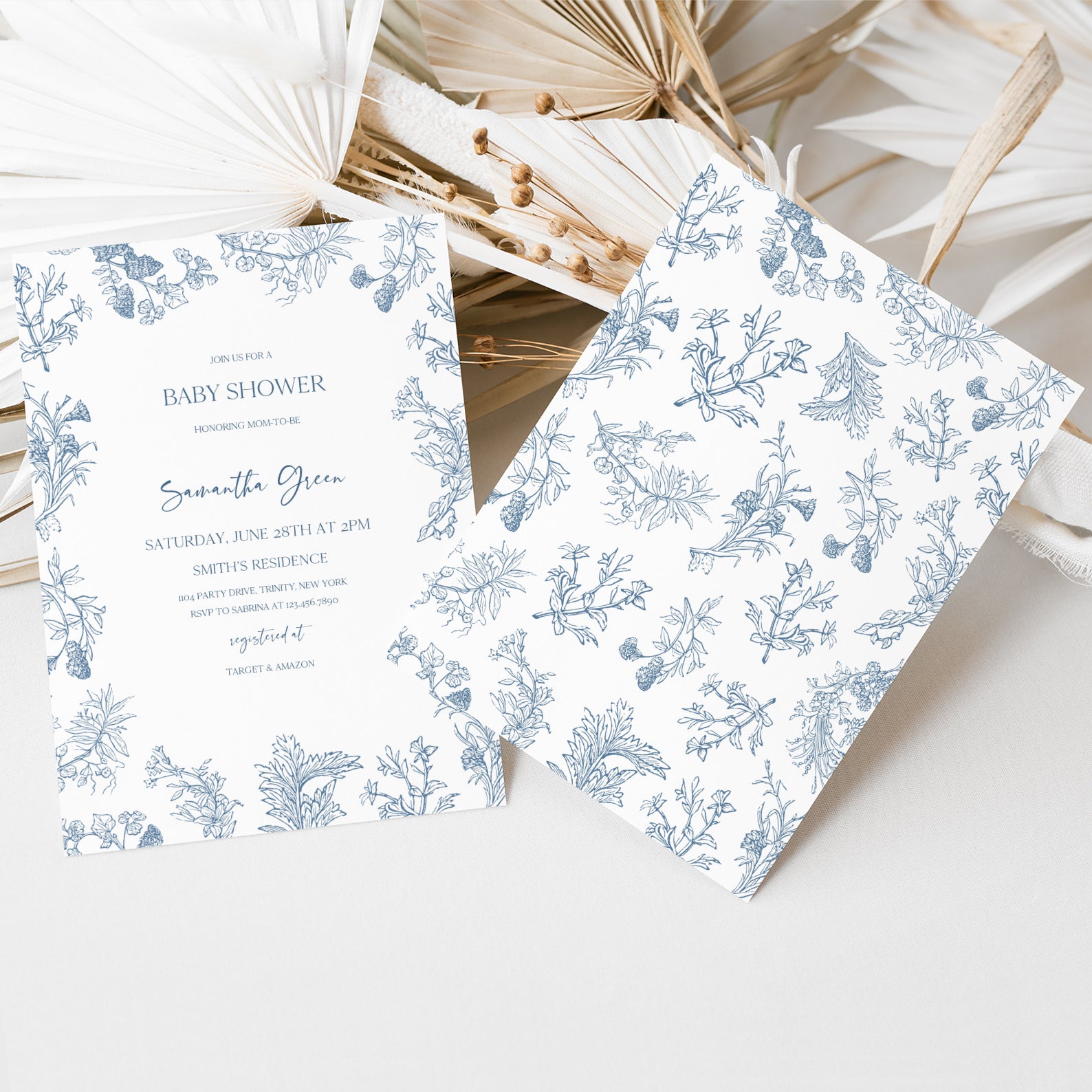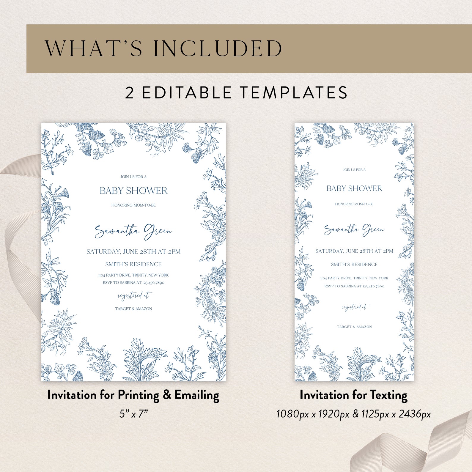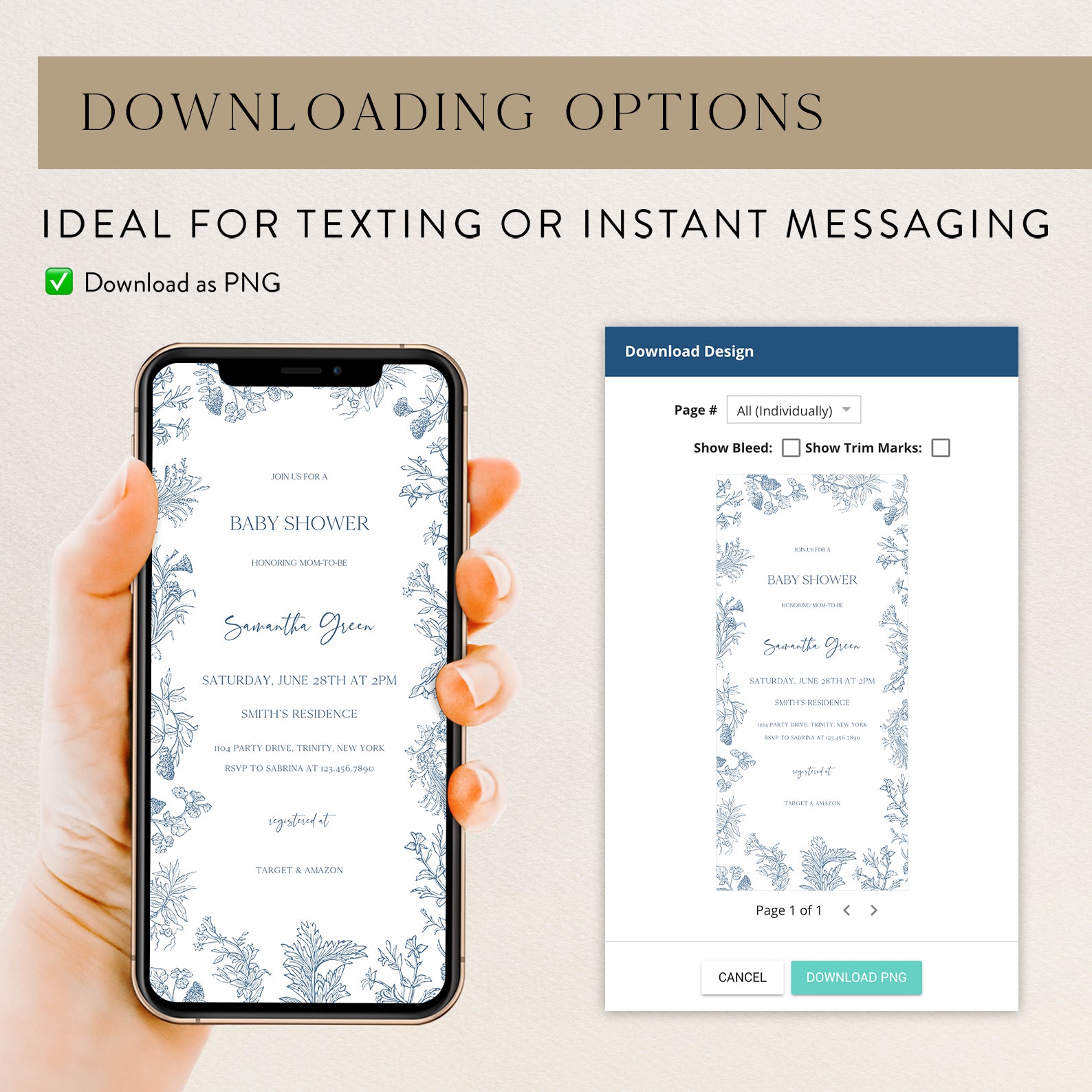 Elevate your baby shower with our stunning minimalist digital invitation, beautifully designed with an elegant blue floral pattern border. This charming blue-themed invitation sets the perfect tone for your celebration, combining simplicity with sophistication. Effortlessly customizable, it allows you to add your event details in a stylish format, making it easy to share with friends and family. Make your special day memorable with this exquisite invitation that captures the joy of welcoming your little one!