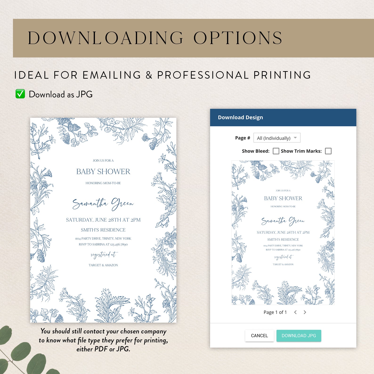 - Purchase this Blue Baby Shower Digital Invitation with Elegant Floral Border template