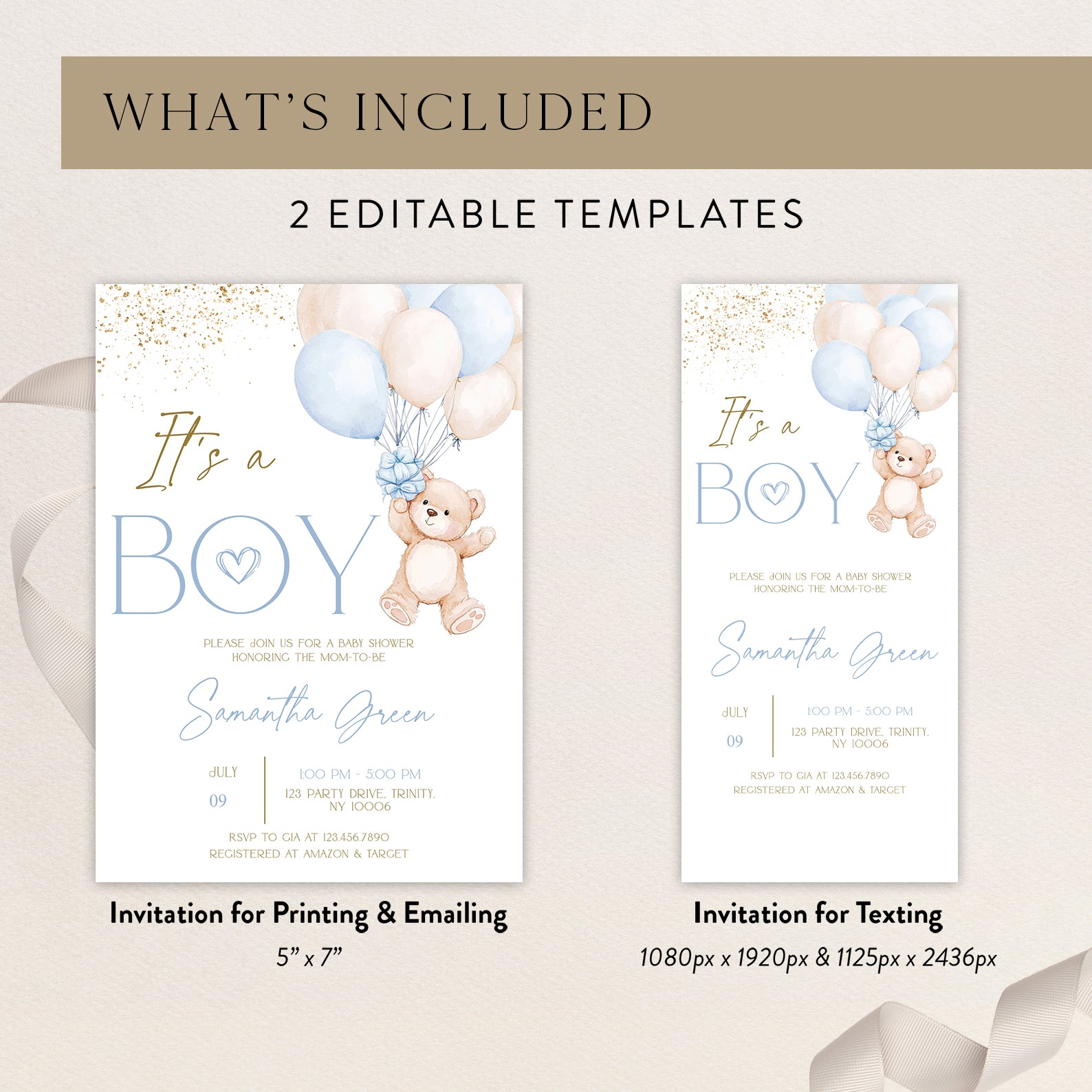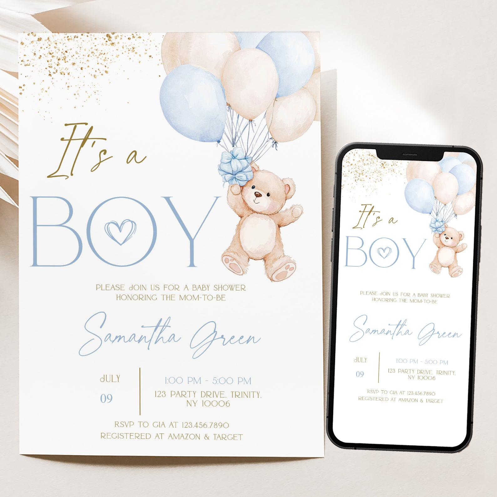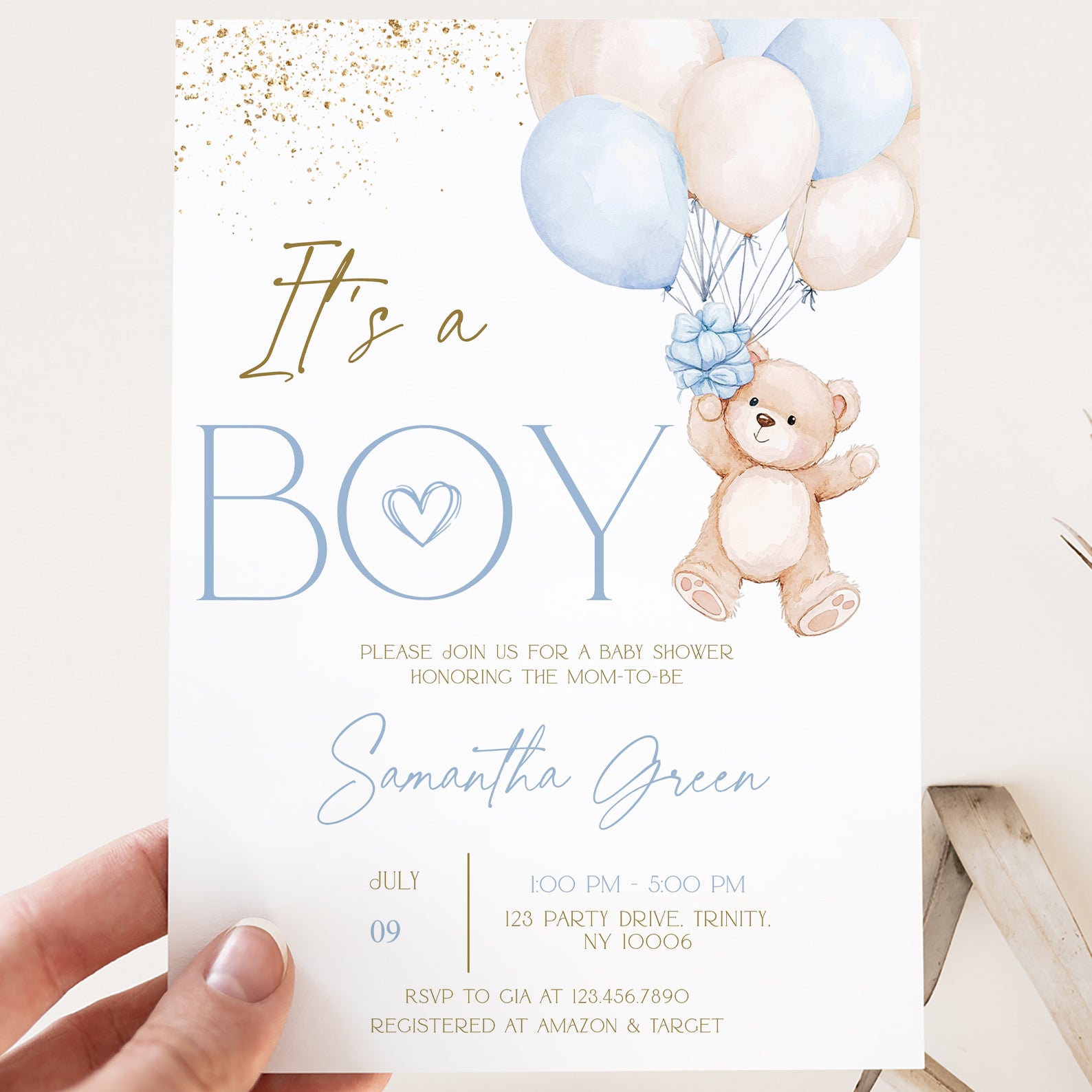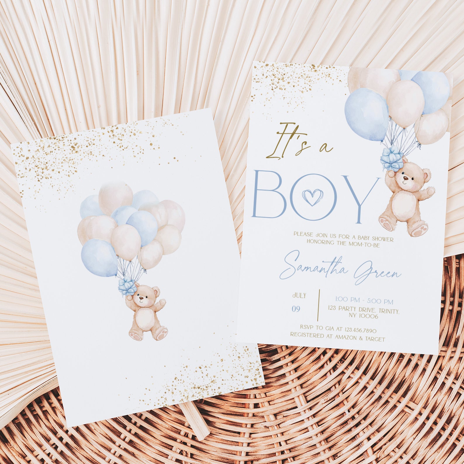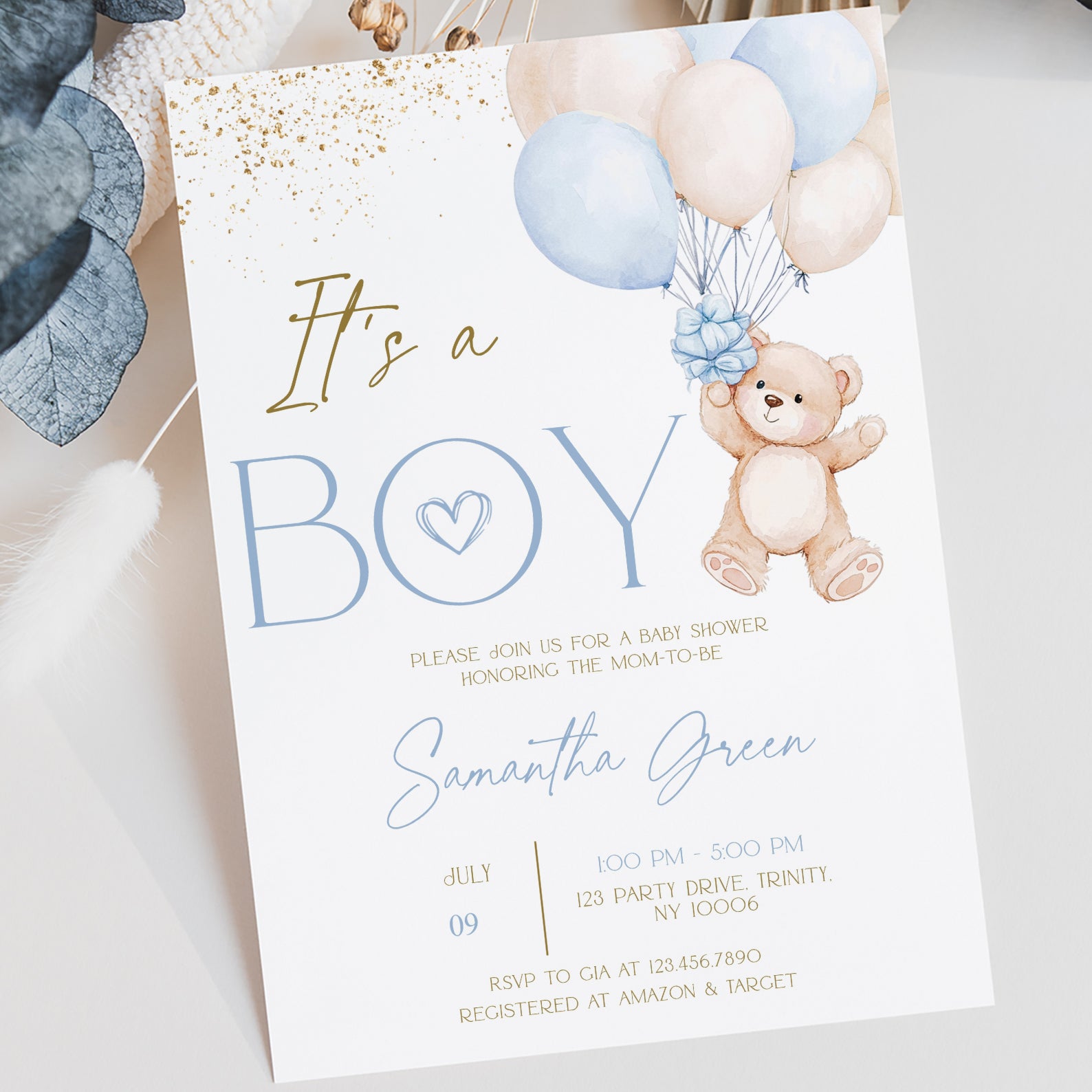 - Purchase this Blue Baby Shower Digital Invite with Bear, Balloons & Gold Accents template