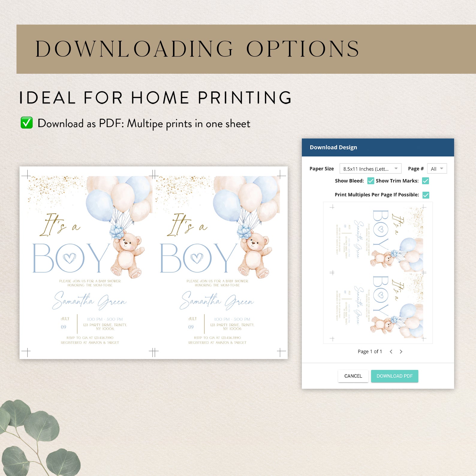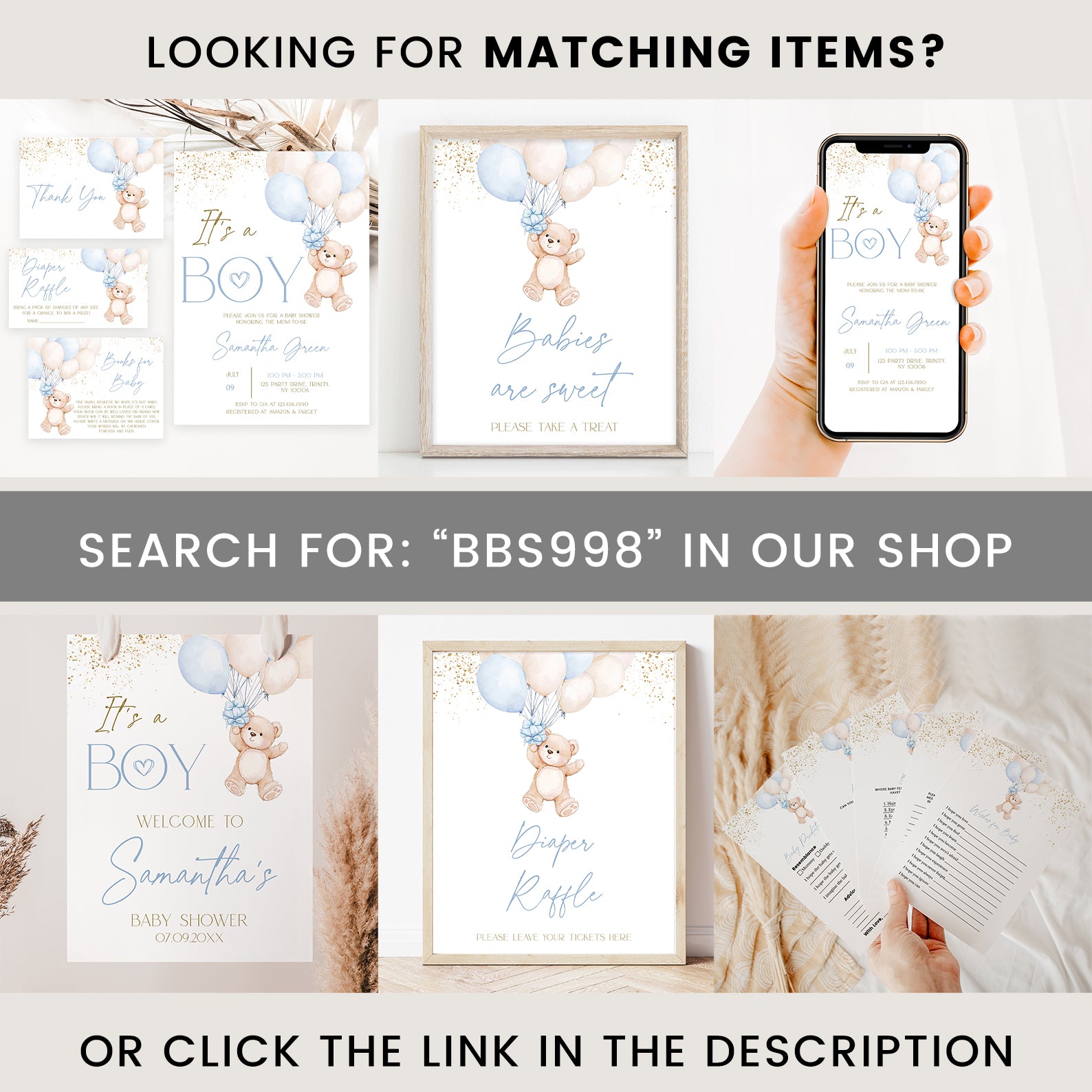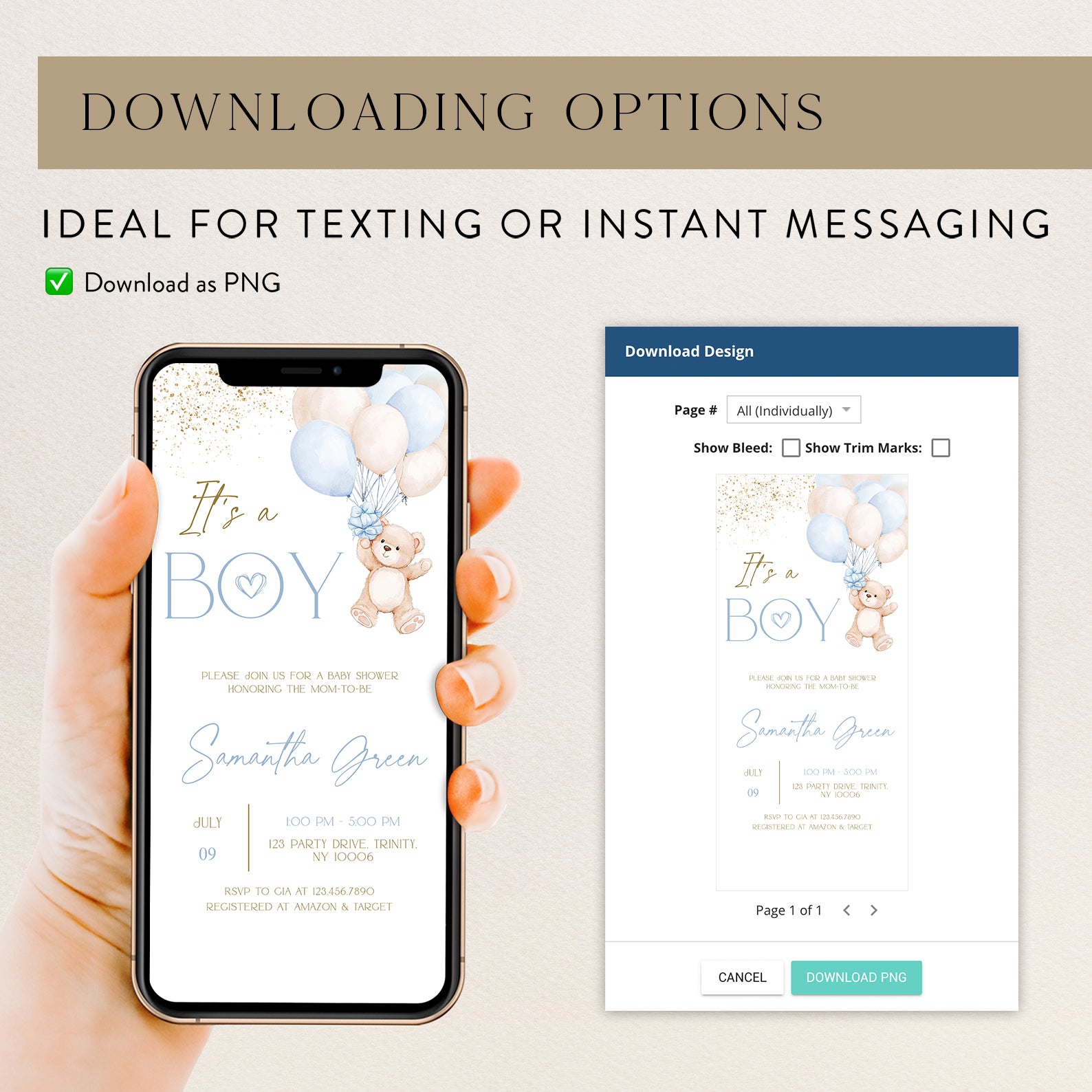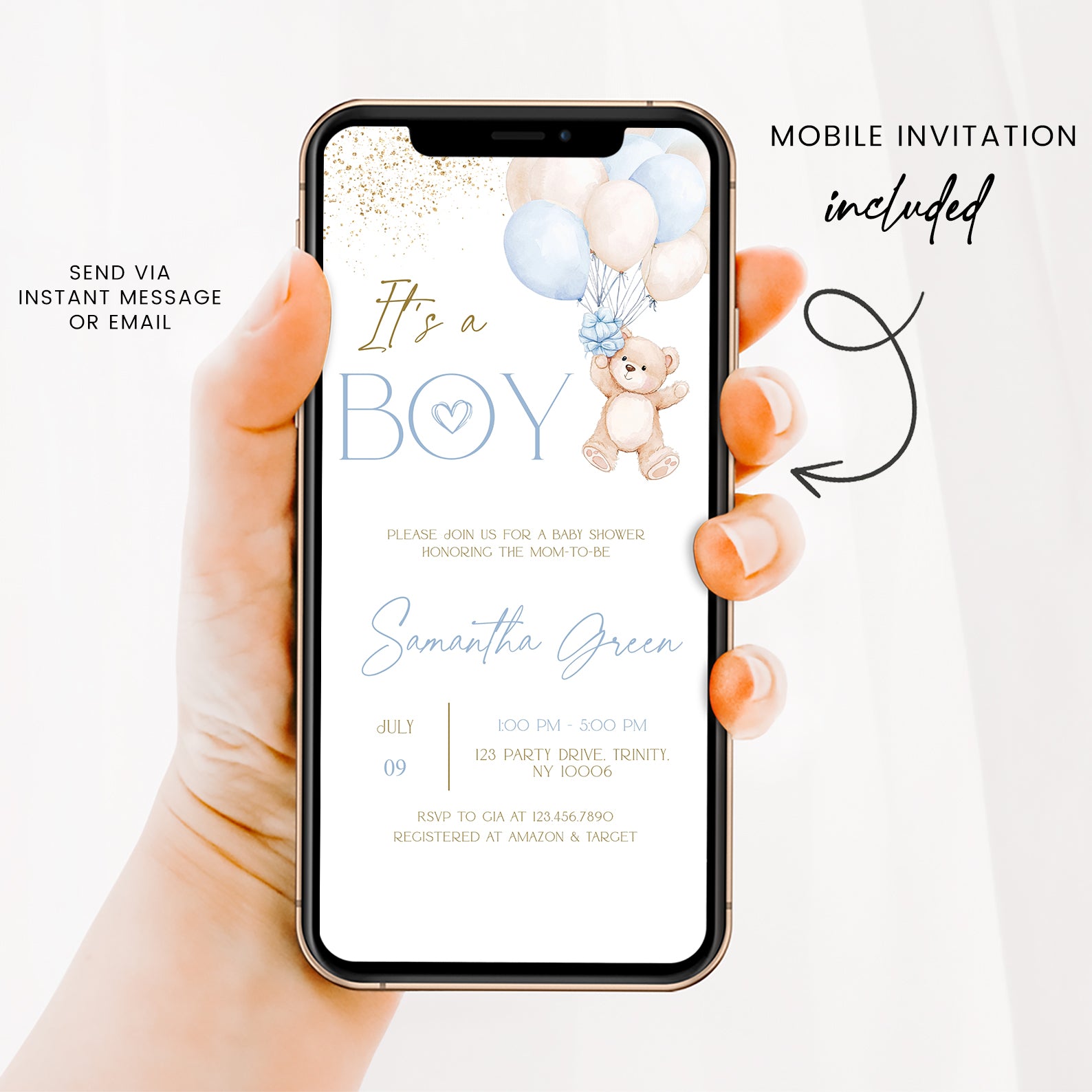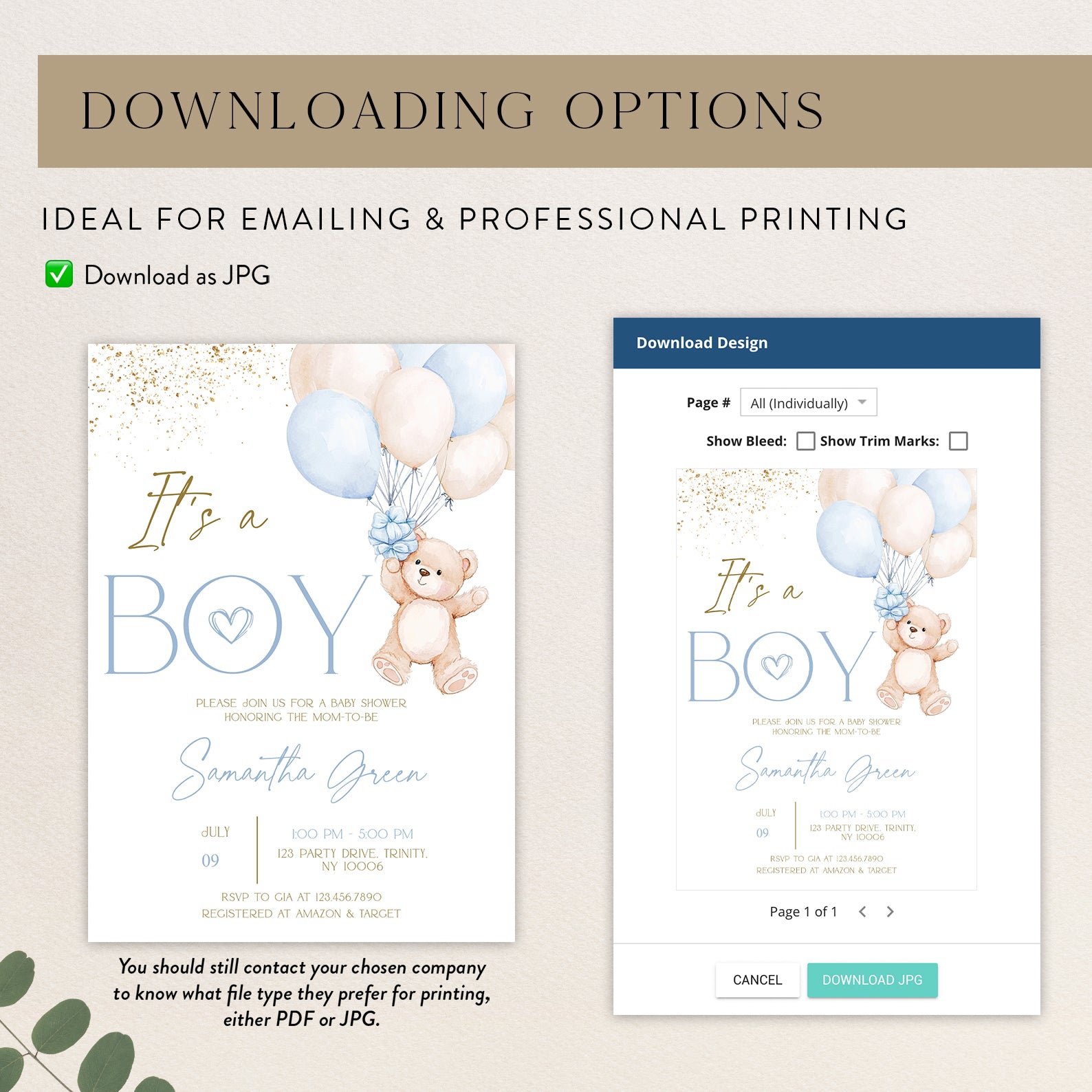 - Purchase this Blue Baby Shower Digital Invite with Bear, Balloons & Gold Accents template