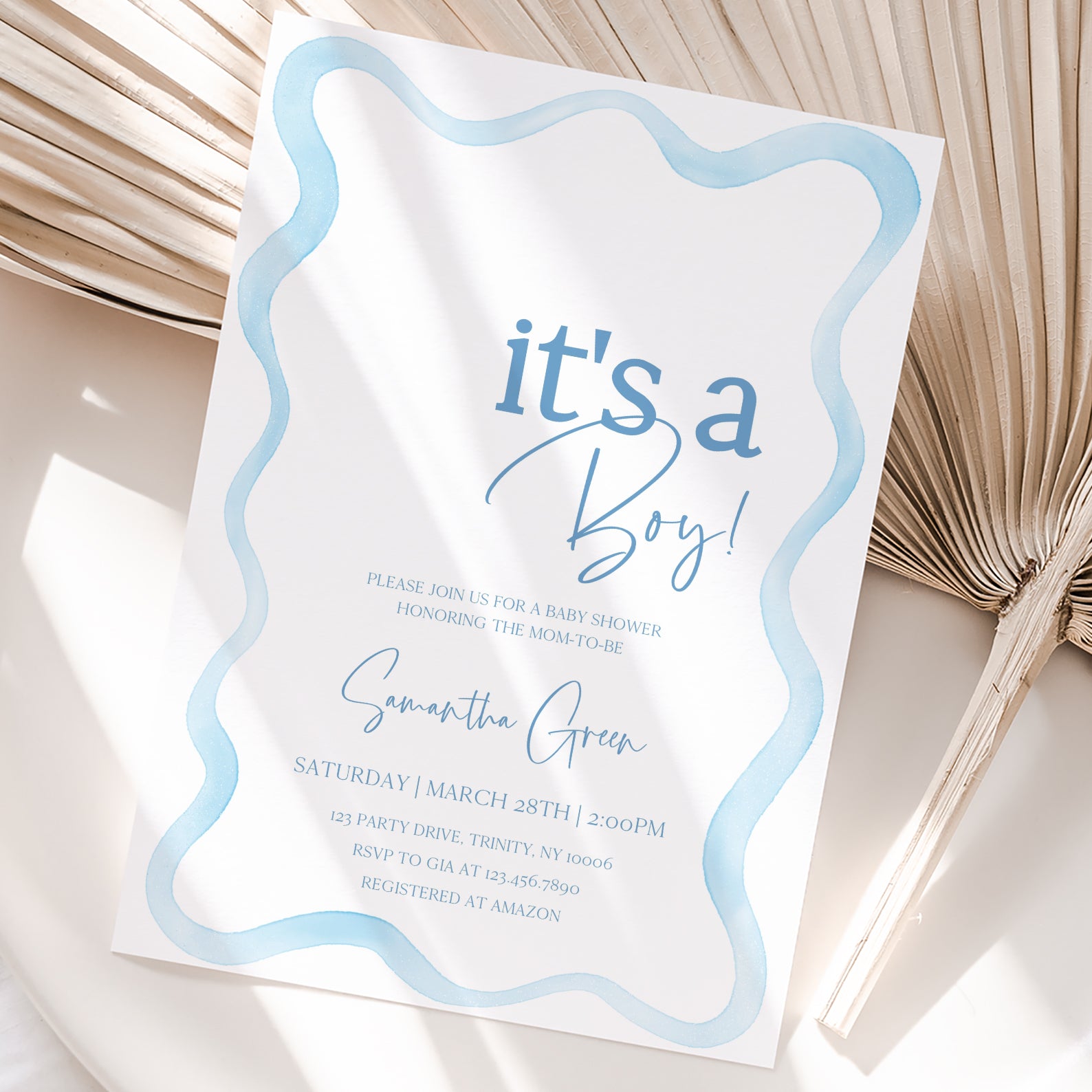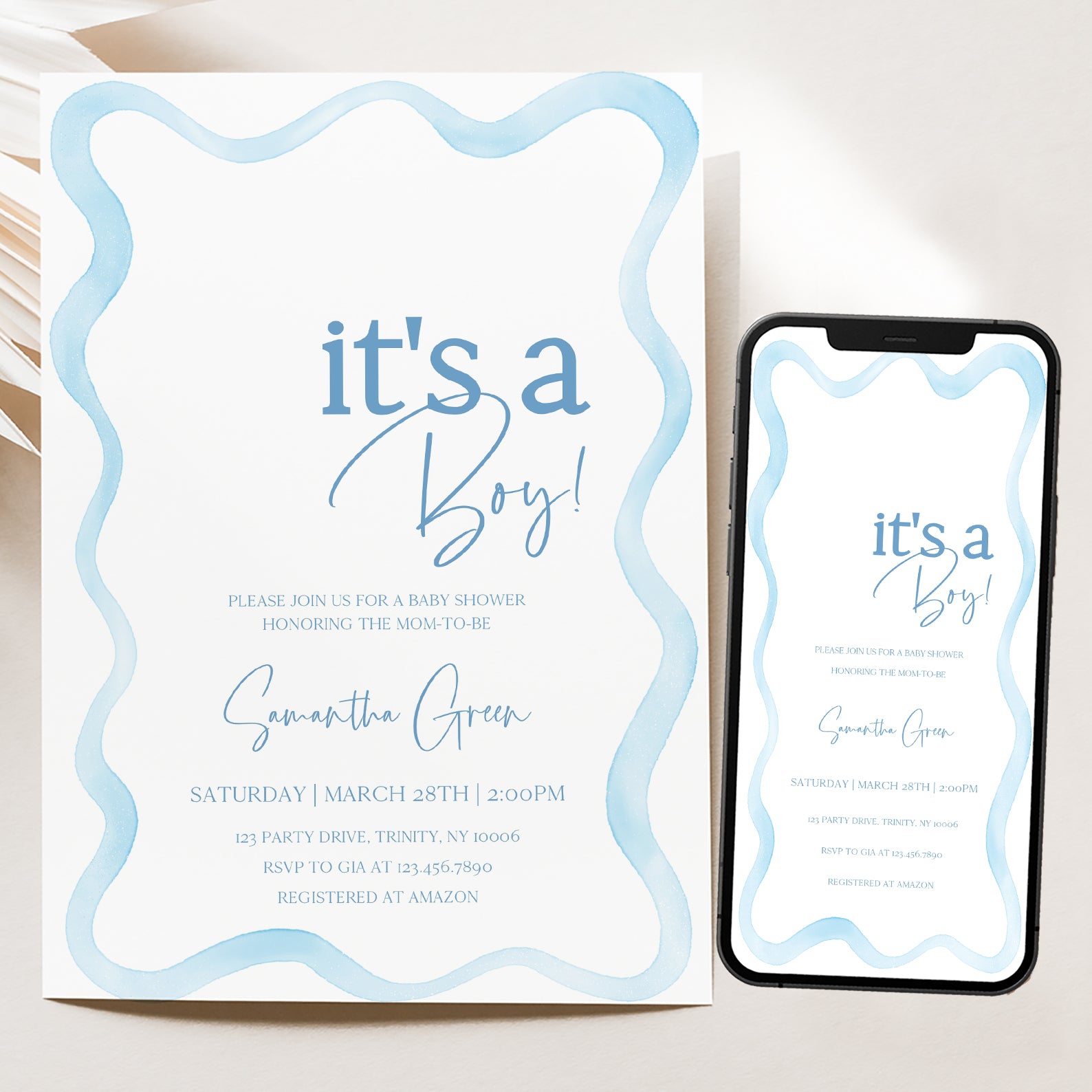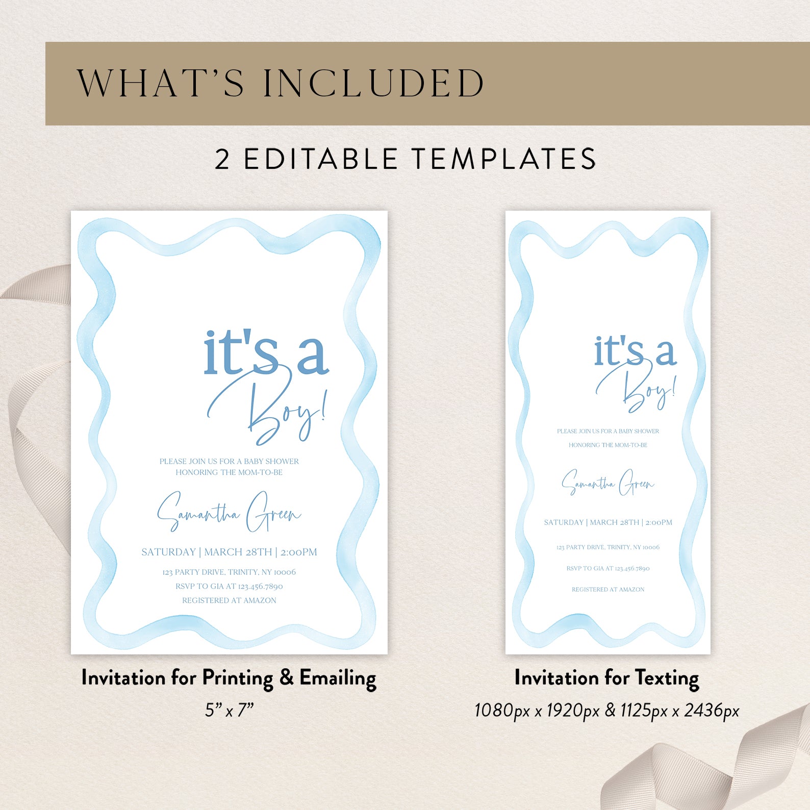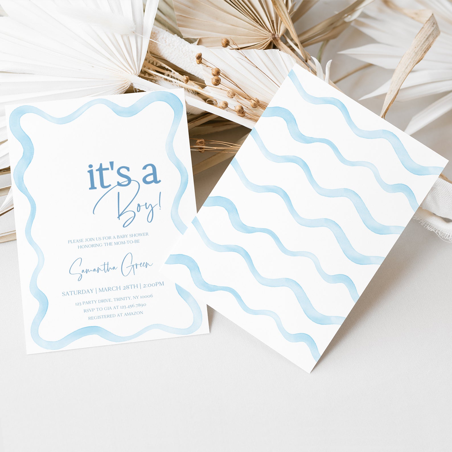 - Purchase this Blue Minimalist Wavy Border Baby Shower Digital Invitation template