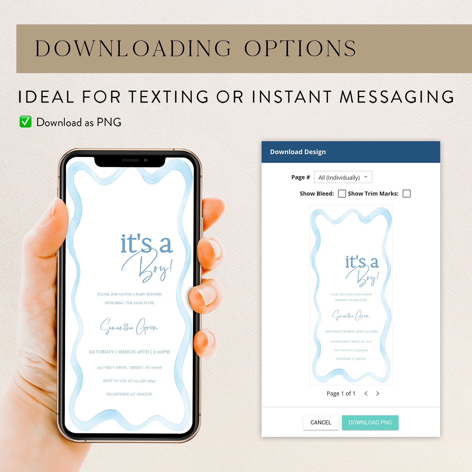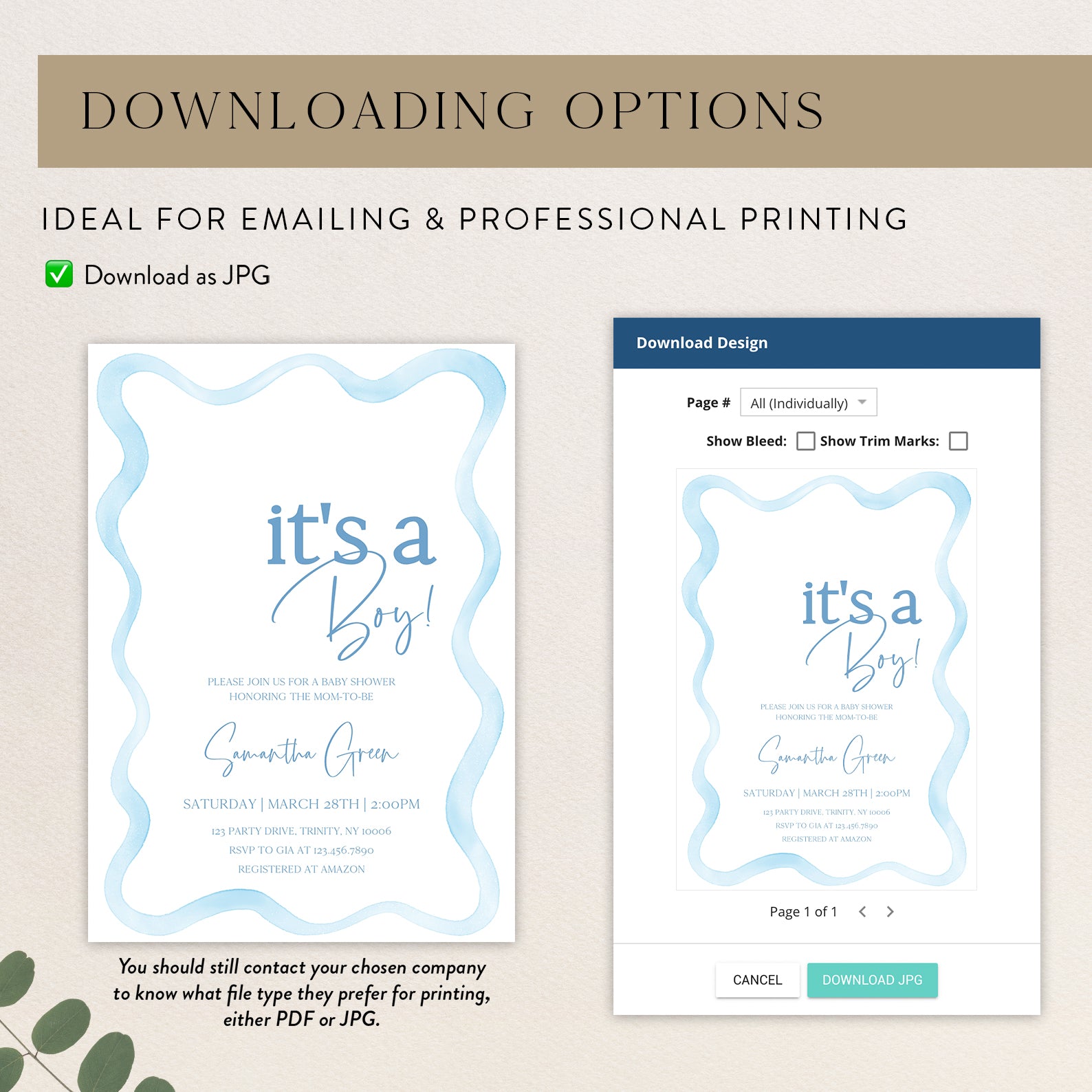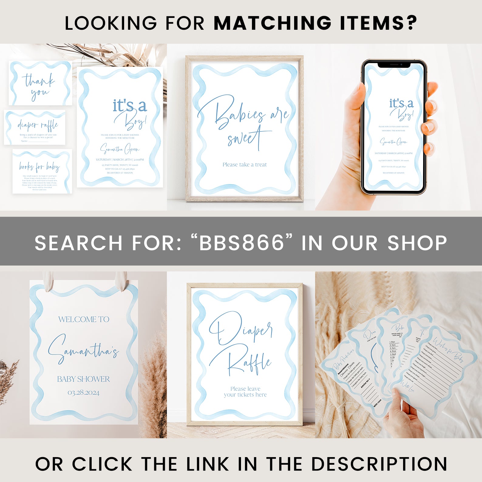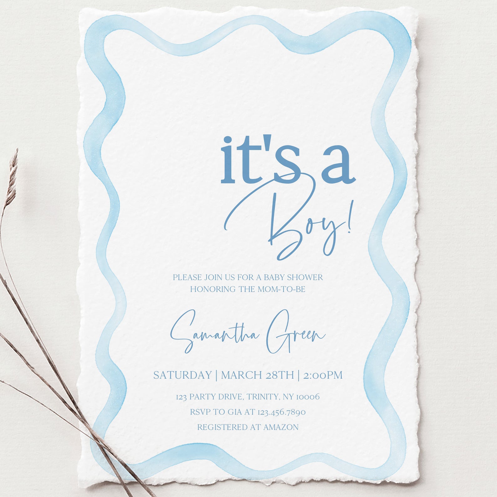 - Purchase this Blue Minimalist Wavy Border Baby Shower Digital Invitation template