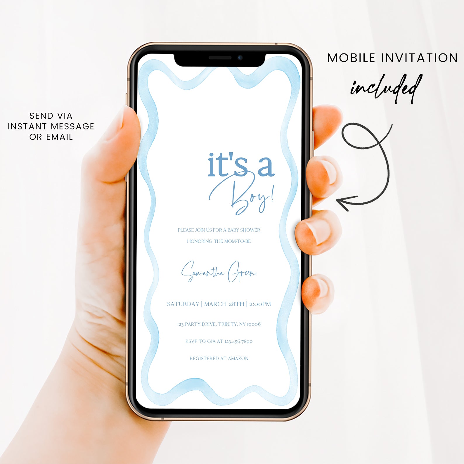 Blue Minimalist Wavy Border Baby Shower Digital Invitation