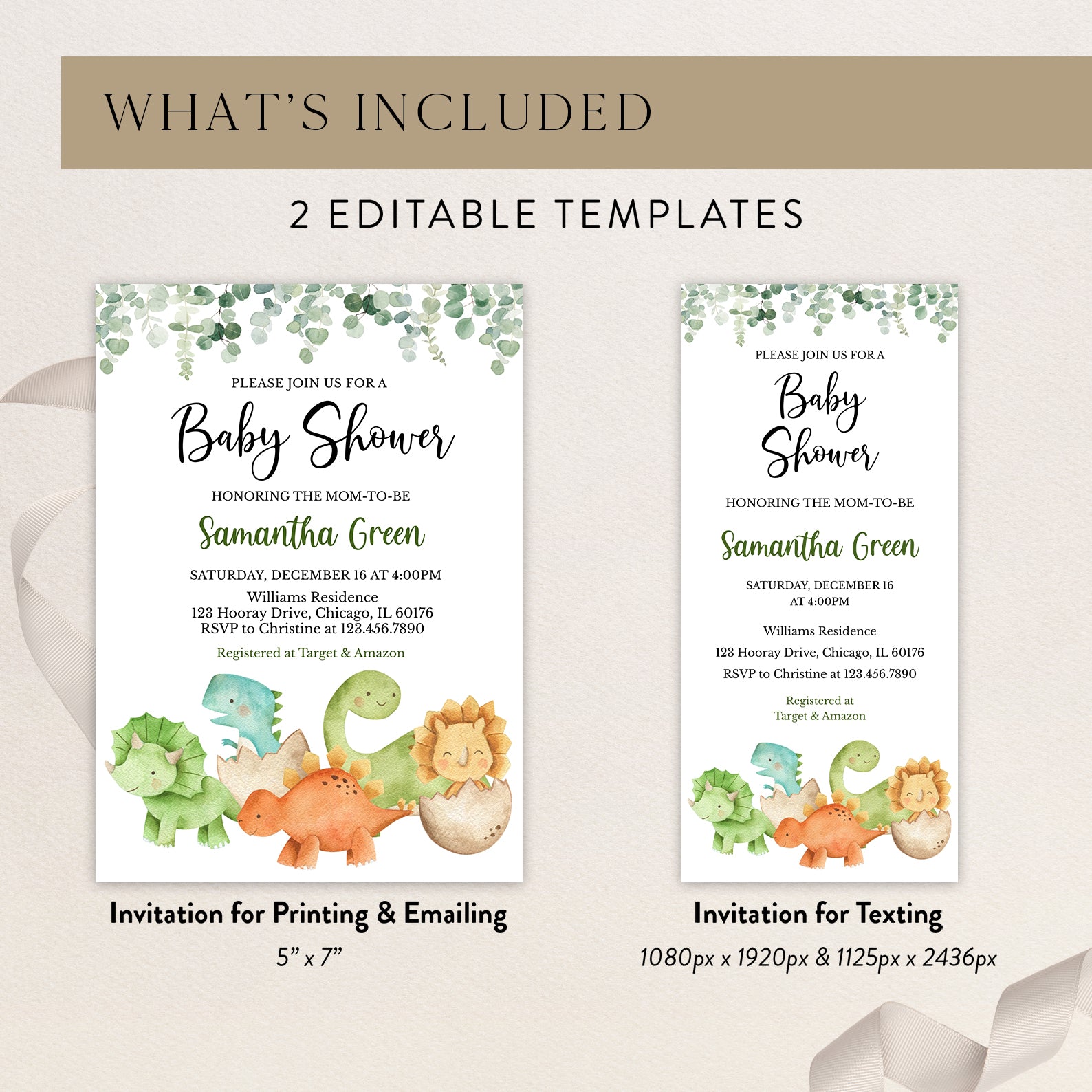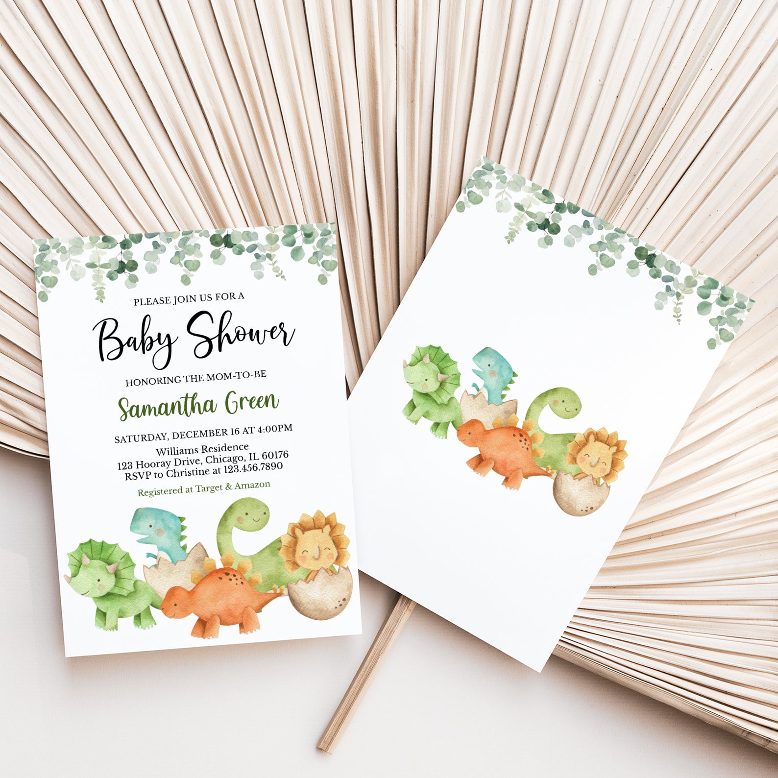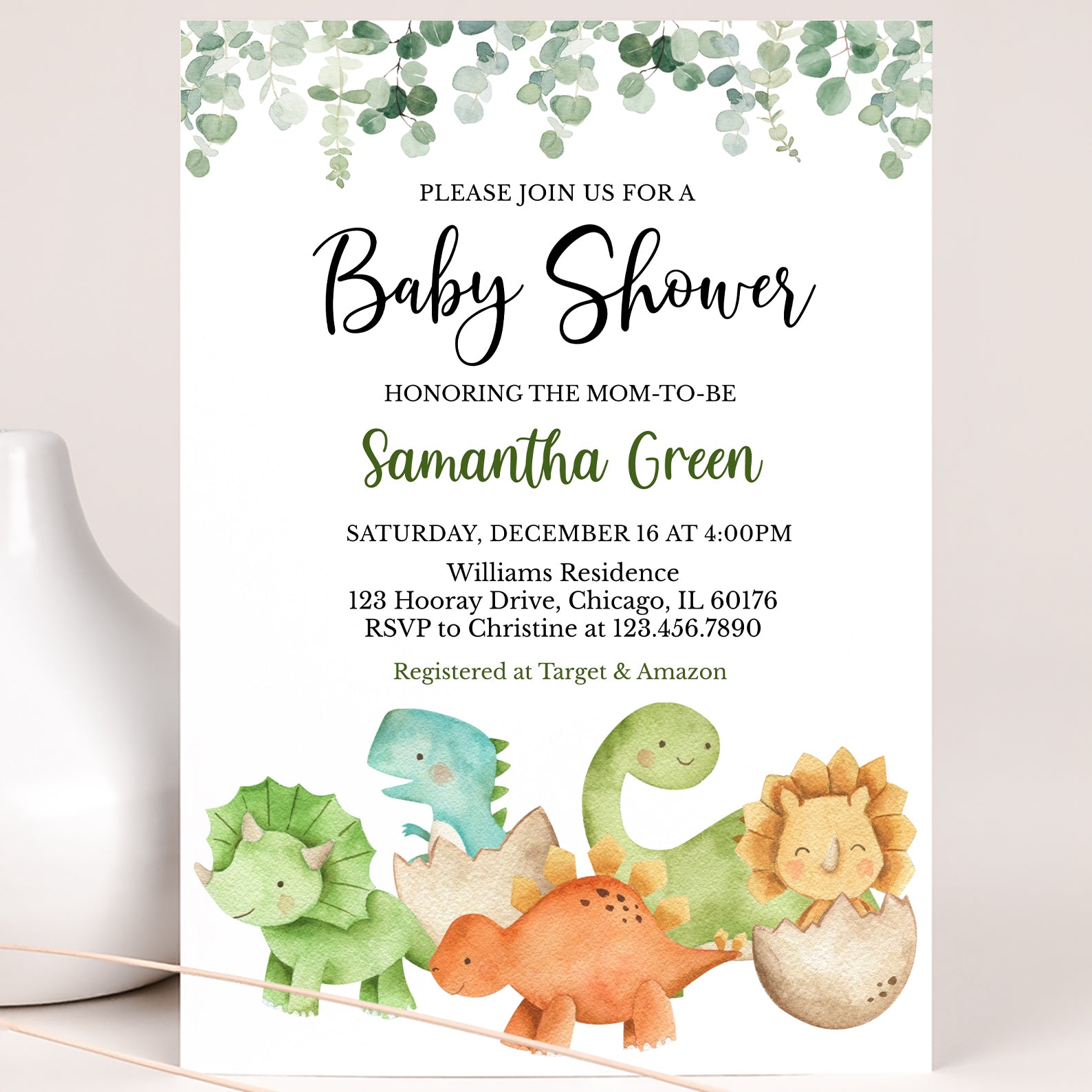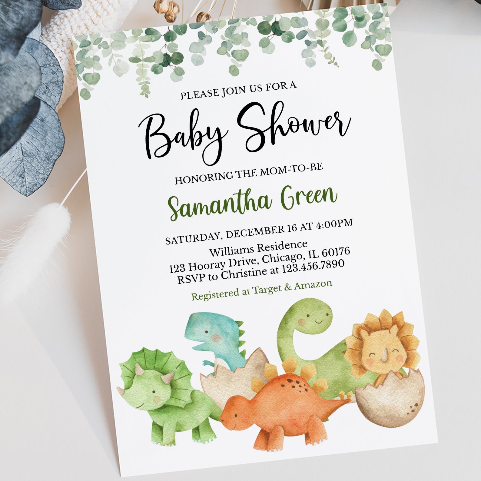 - Purchase this Dinosaur Baby Shower Invitation with Greenery & Cute Dinos template