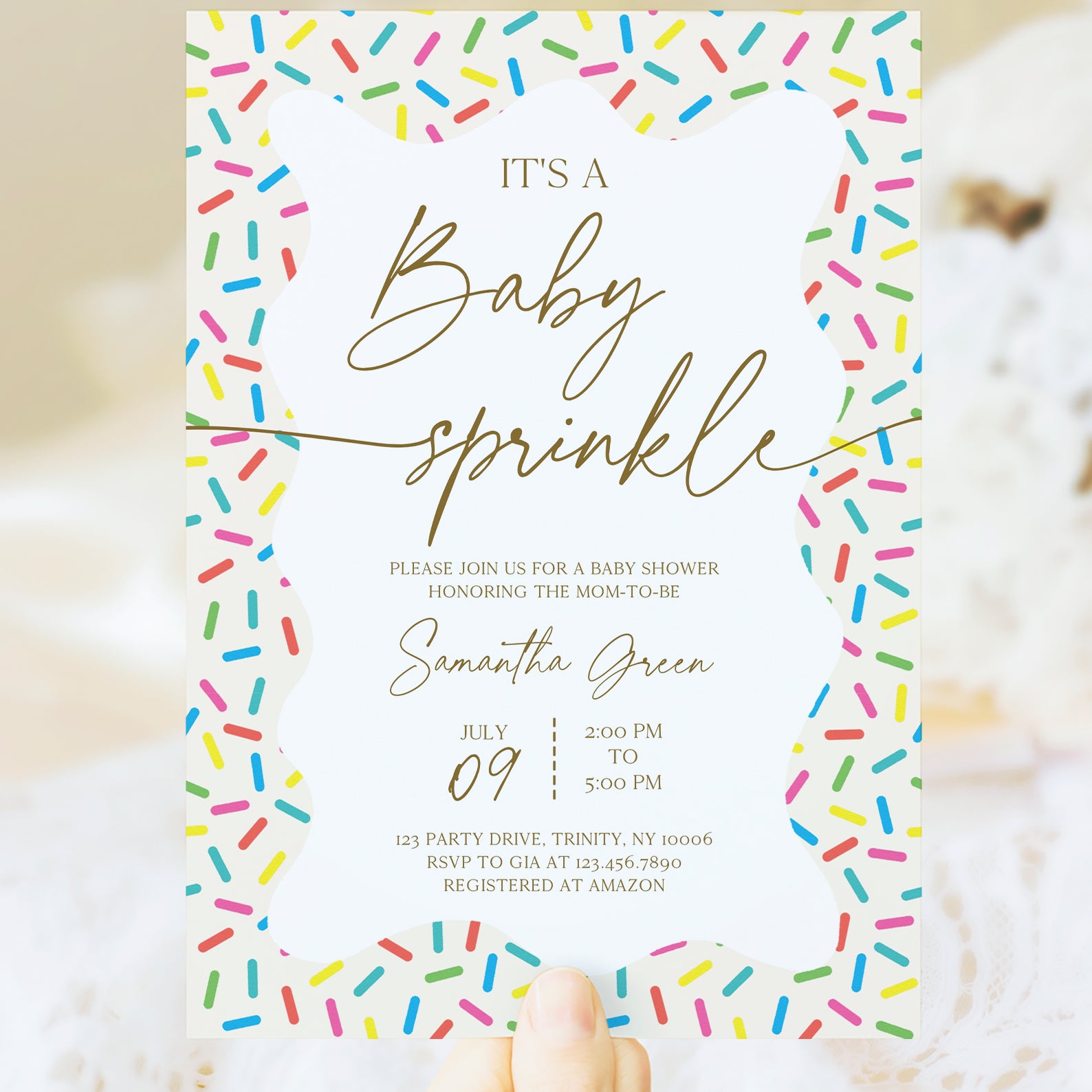 - Purchase this Evergreen Baby Sprinkle Digital Invite: Vanilla & Sprinkles template