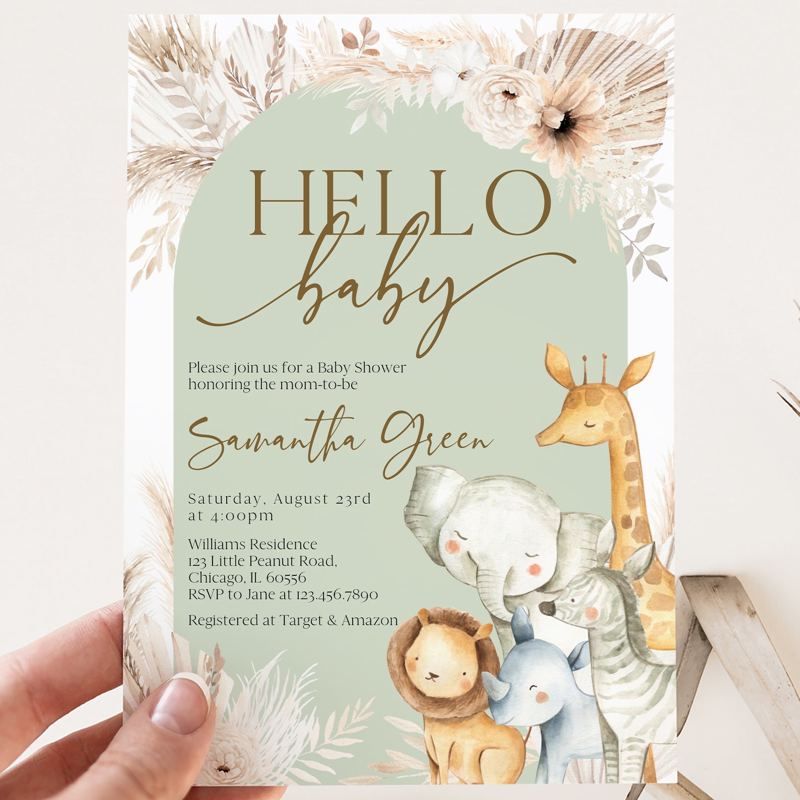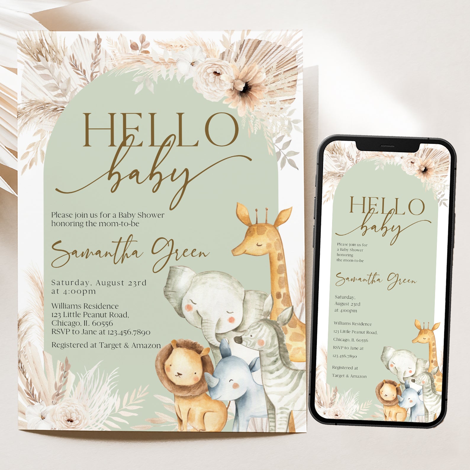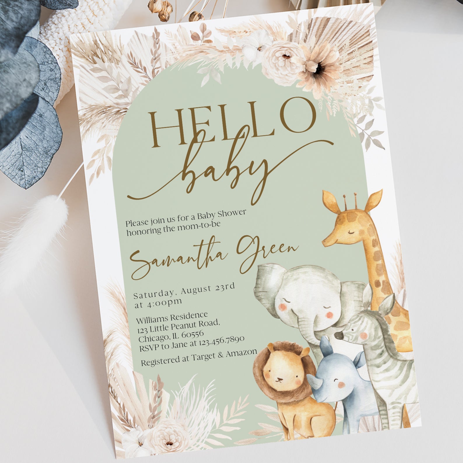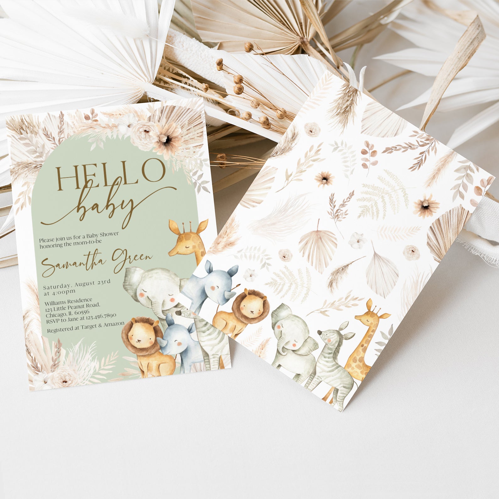 - Purchase this Hello Baby Shower Invitation with Safari Animals & Florals template