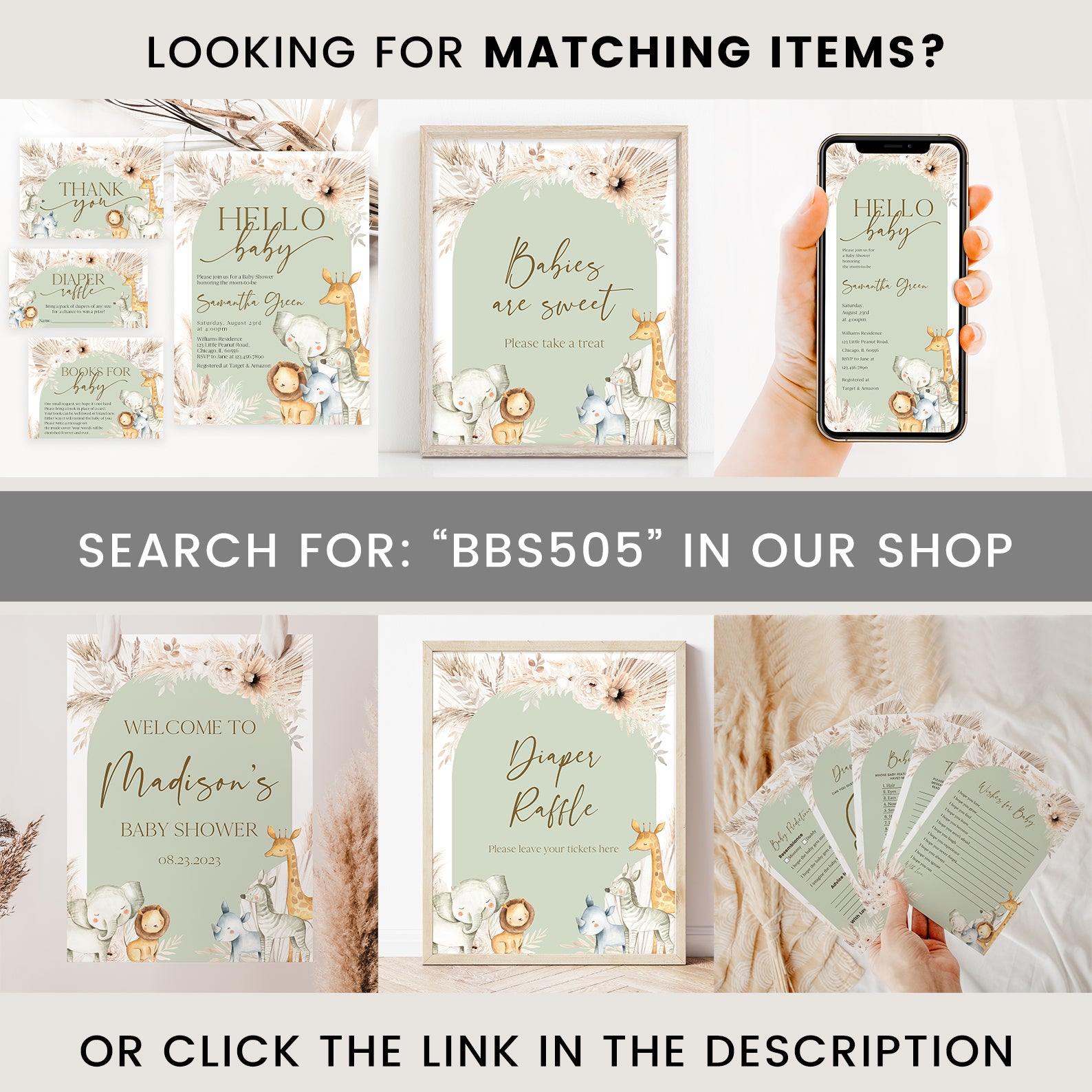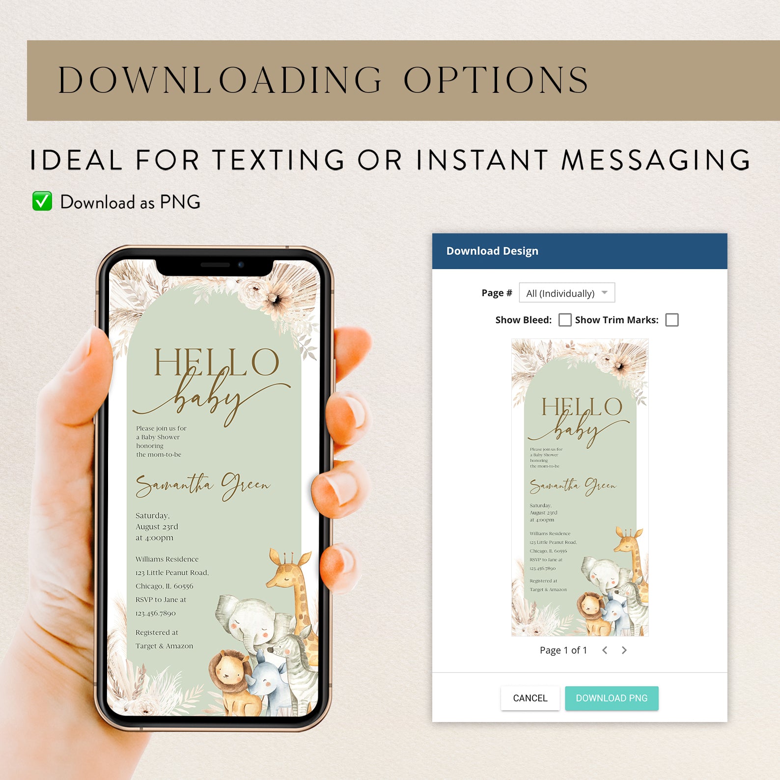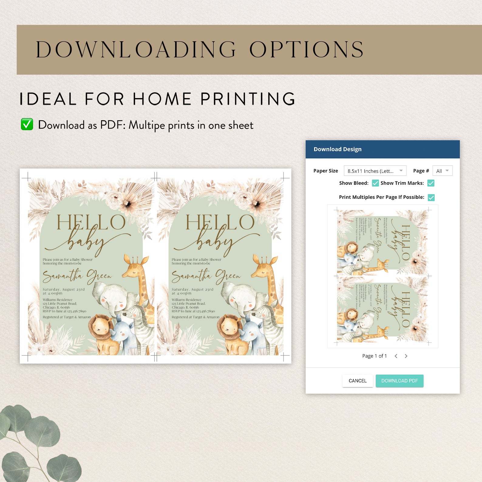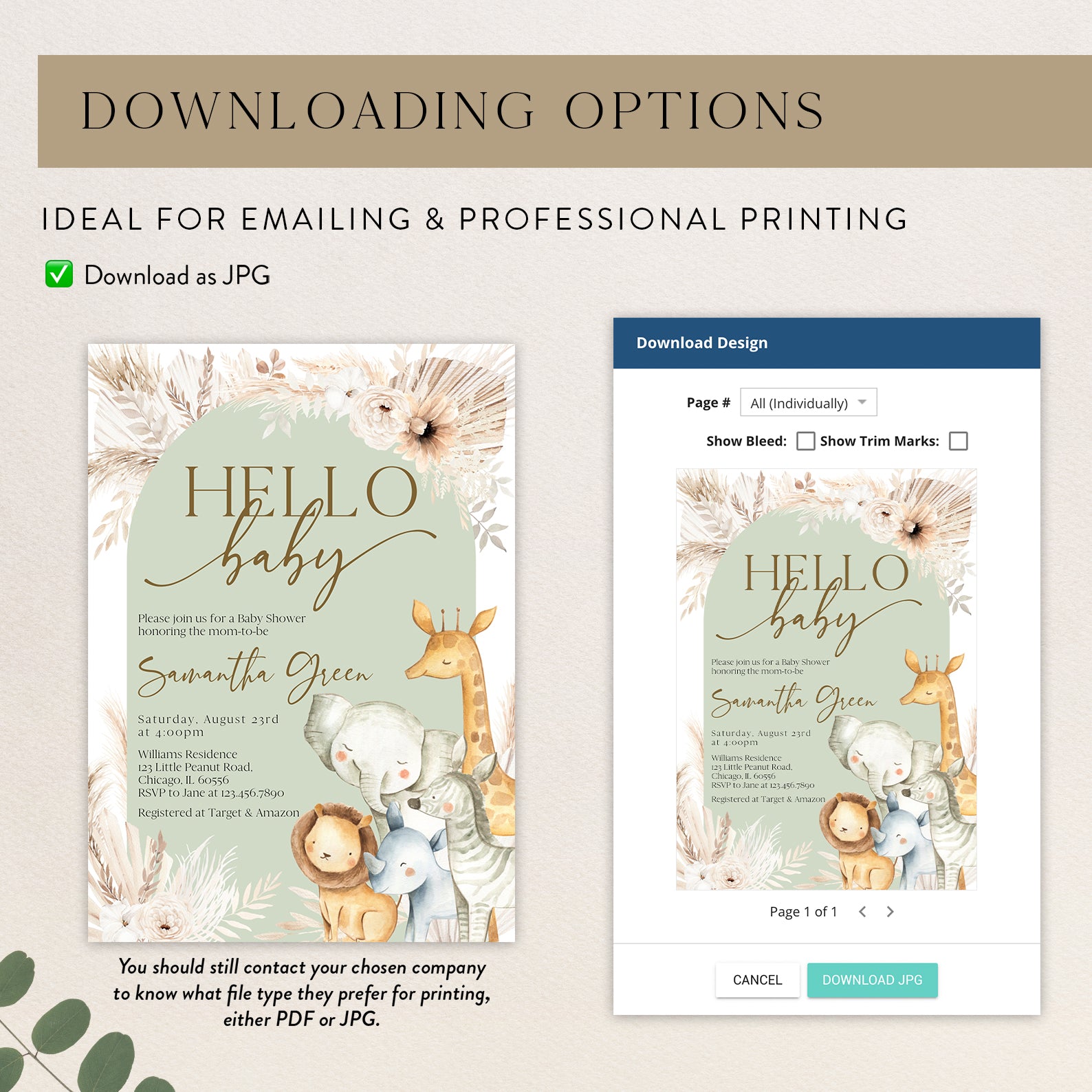 - Purchase this Hello Baby Shower Invitation with Safari Animals & Florals template