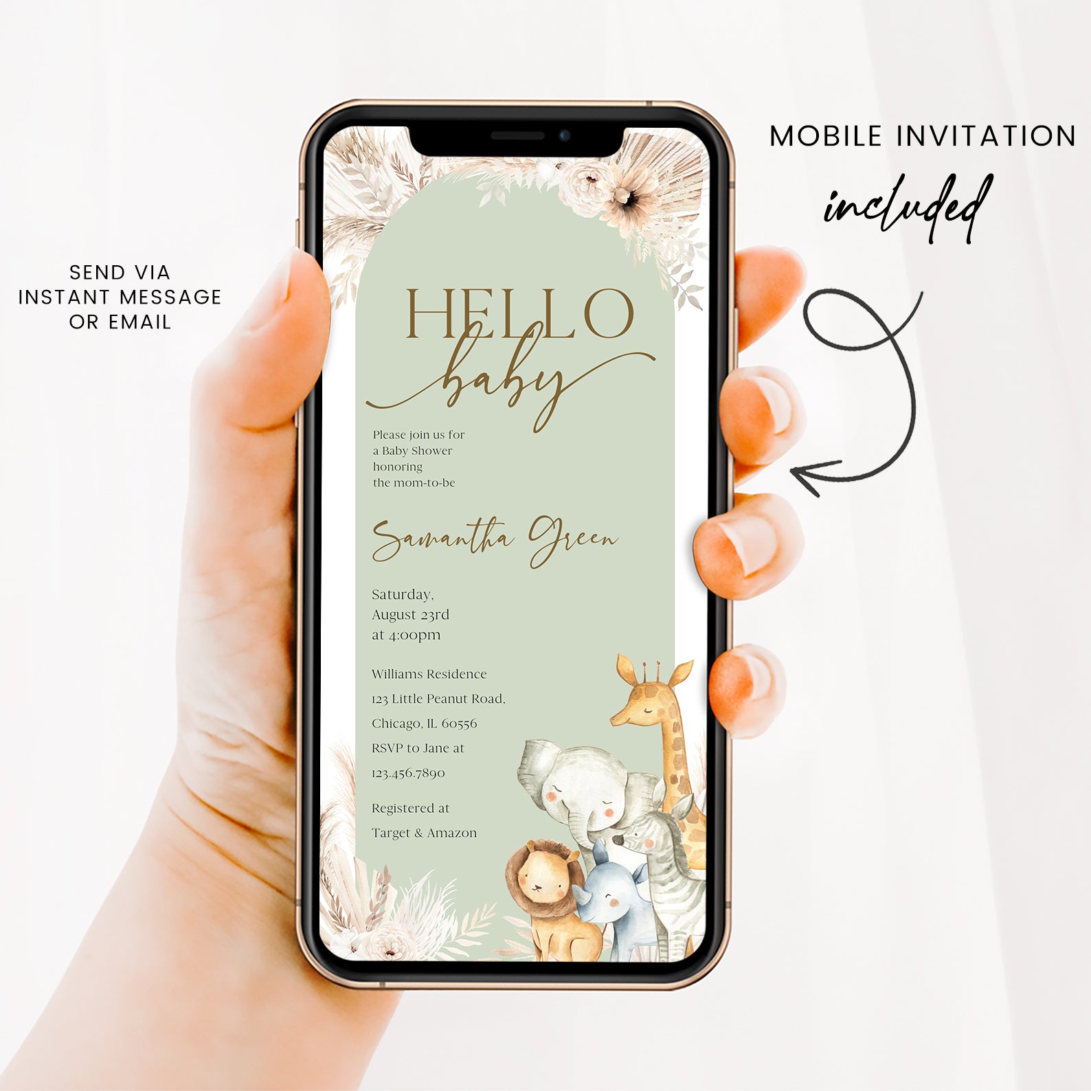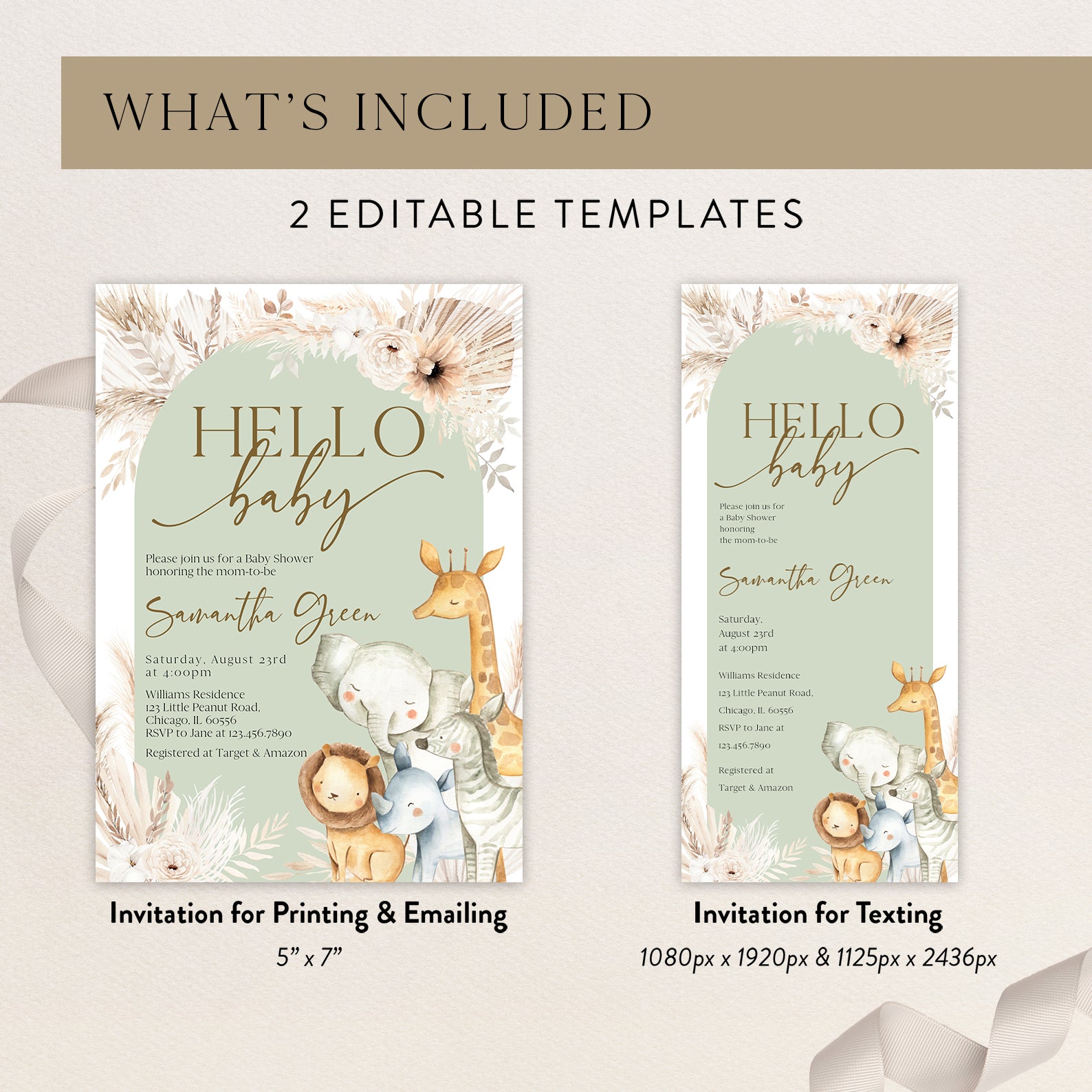 Celebrate the arrival of your little one with our enchanting "Hello Baby" digital invitation! Featuring a charming green arch adorned with boho leaves and florals, this invitation sets a delightful tone for your baby shower. On the right side, adorable animals like a lion, rhino, zebra, elephant, and giraffe add a playful touch, making it perfect for a whimsical celebration. Easy to customize and send, this invitation is sure to impress your guests and create excitement for the big day!