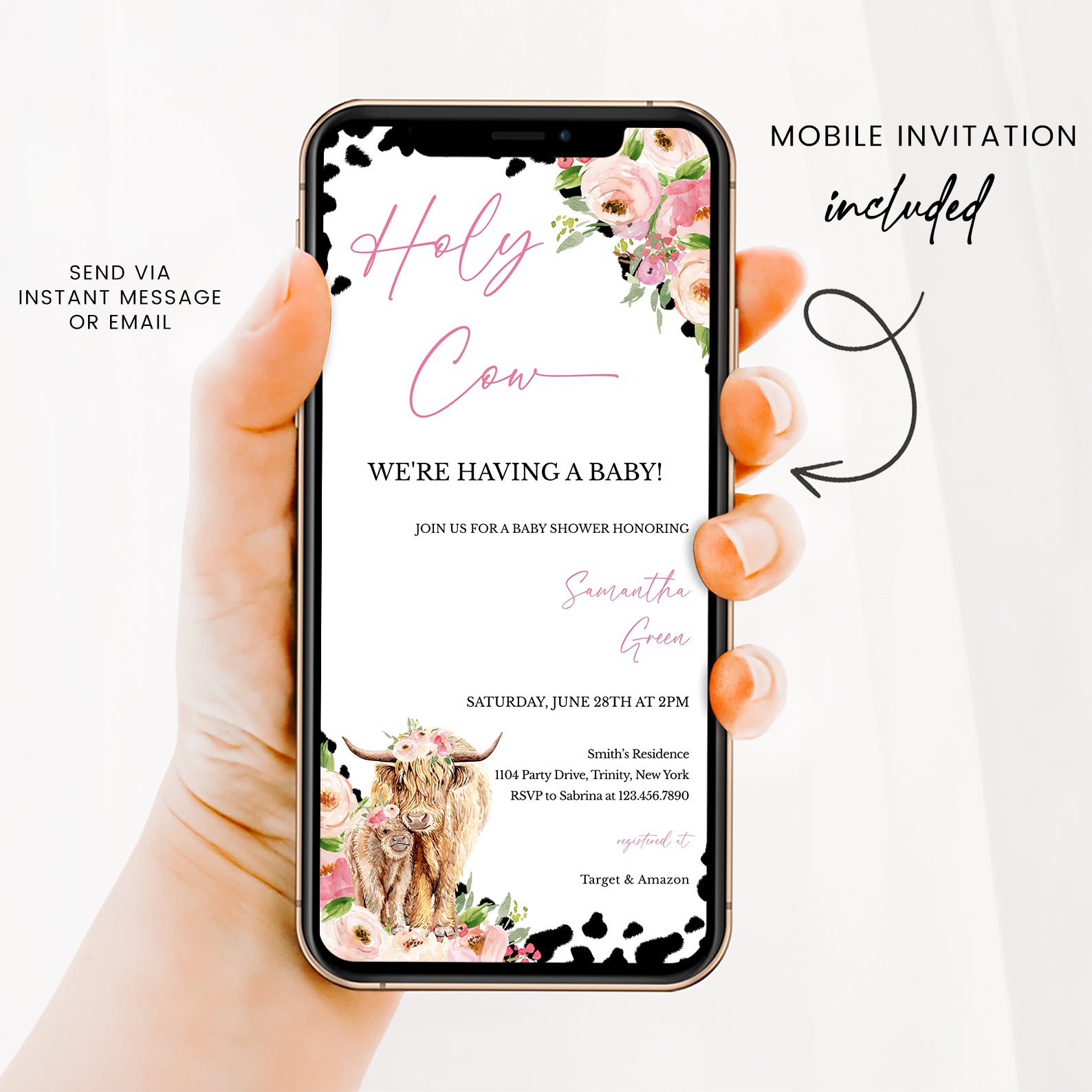 Celebrate your little one's upcoming arrival with our charming "Holy Cow, We're Having a Baby" digital invitation! This delightful design features playful black cow prints in the corners, beautifully complemented by soft pink florals that add a touch of elegance. The heartwarming image of a Highland mother and baby cow, adorned with flowers, captures the joy of this special occasion. Perfect for inviting friends and family to your baby shower, this invitation sets the tone for a fun and memorable celebration. Download, customize, and send it out in minutes. Let the festivities begin!