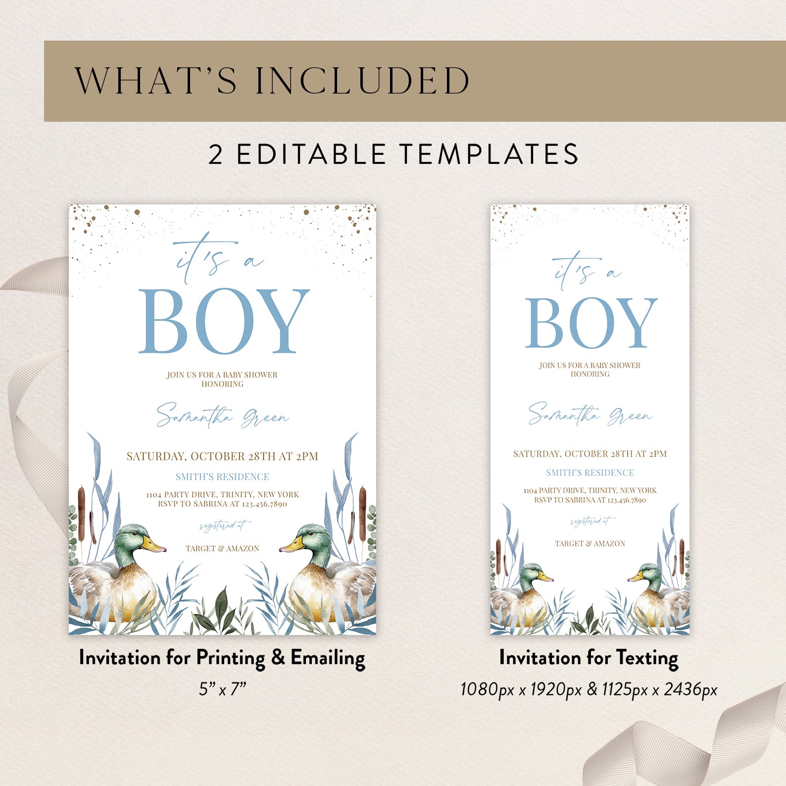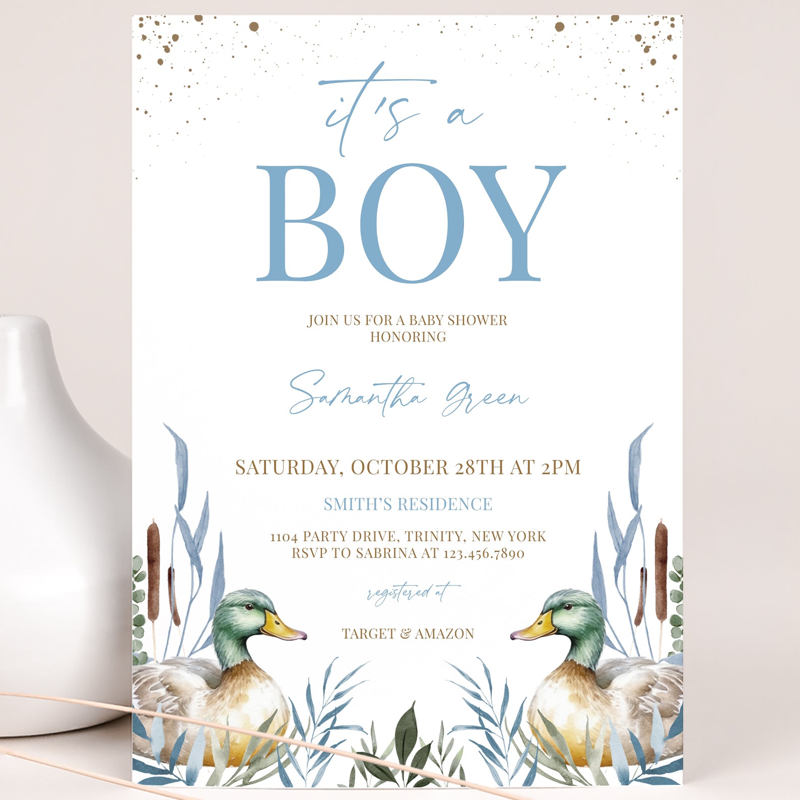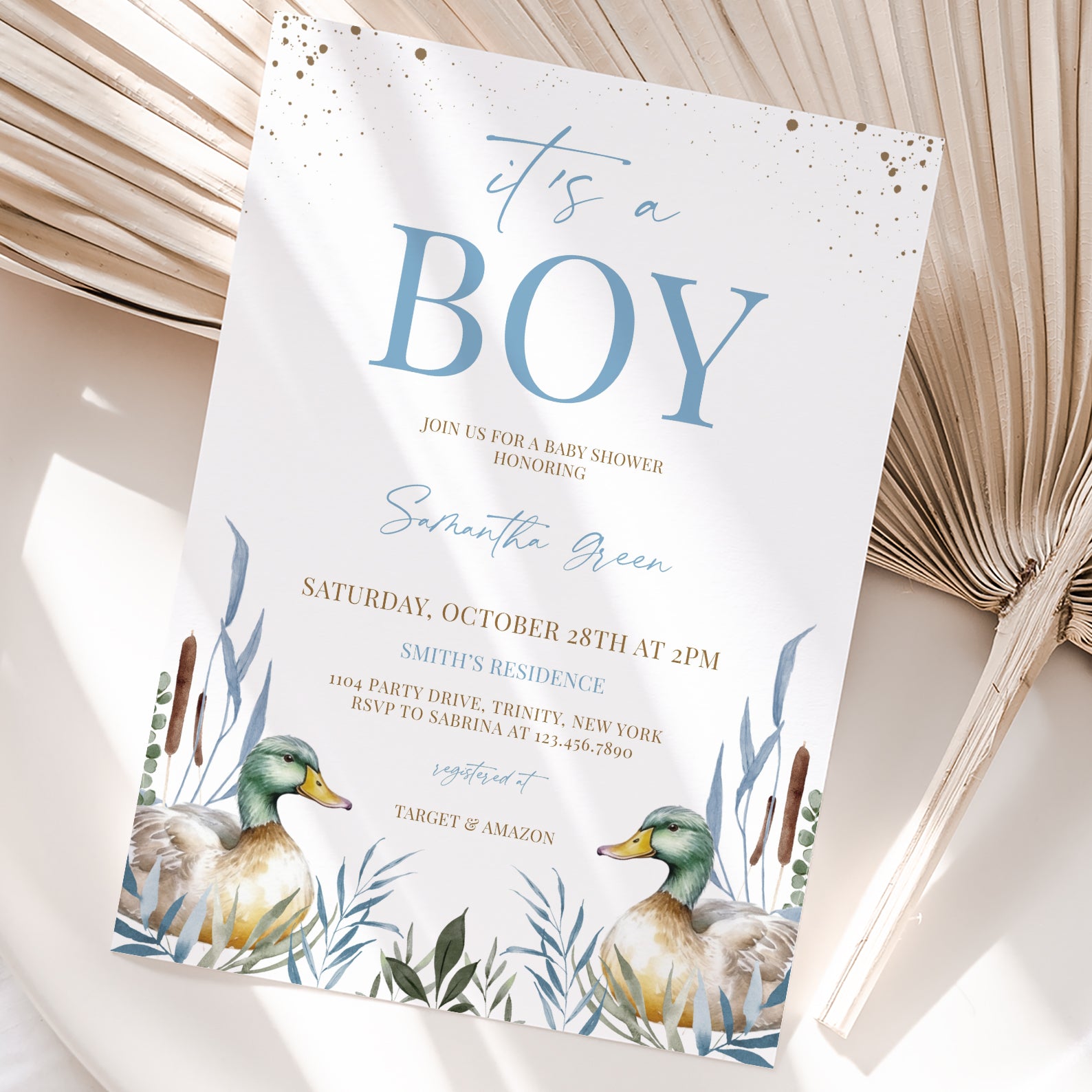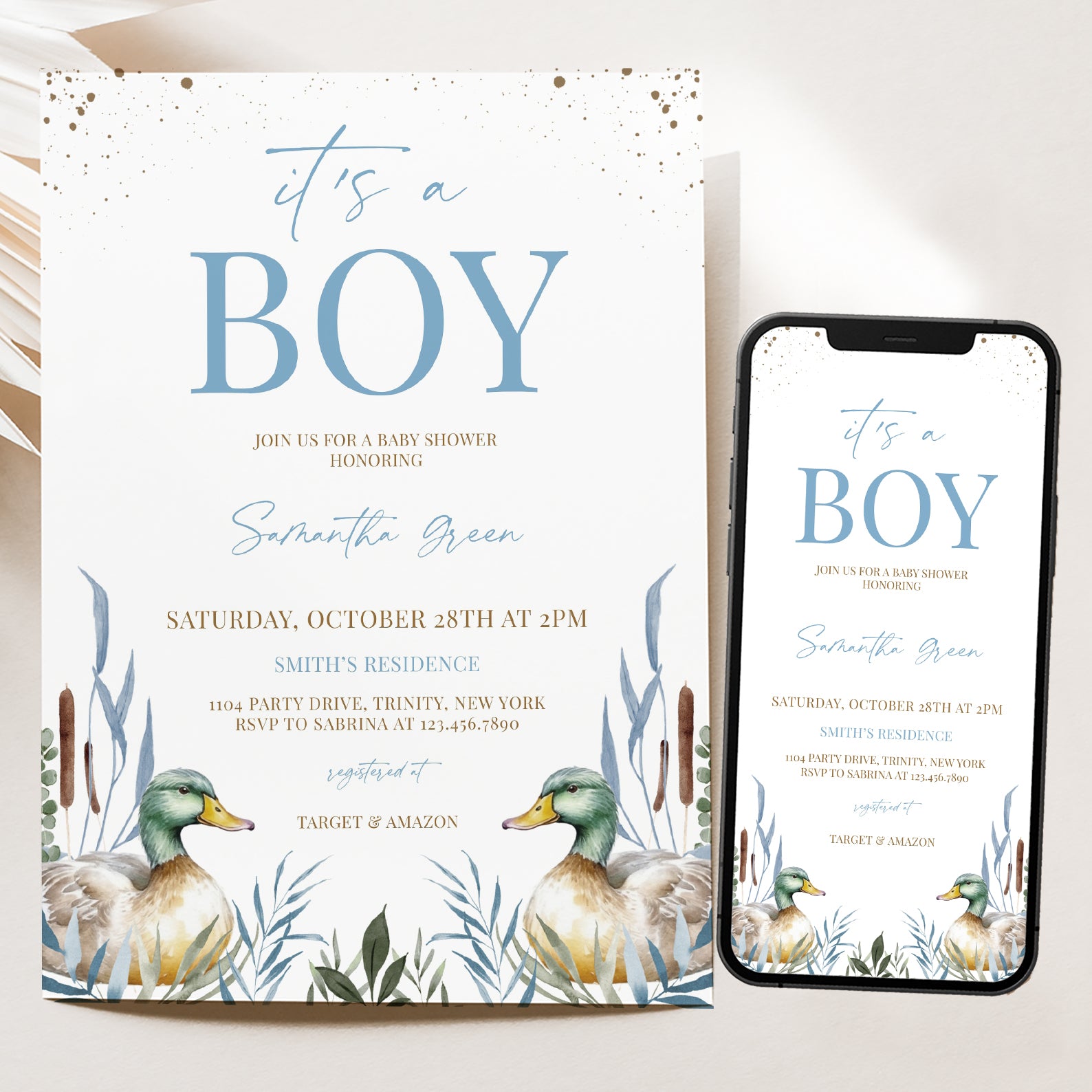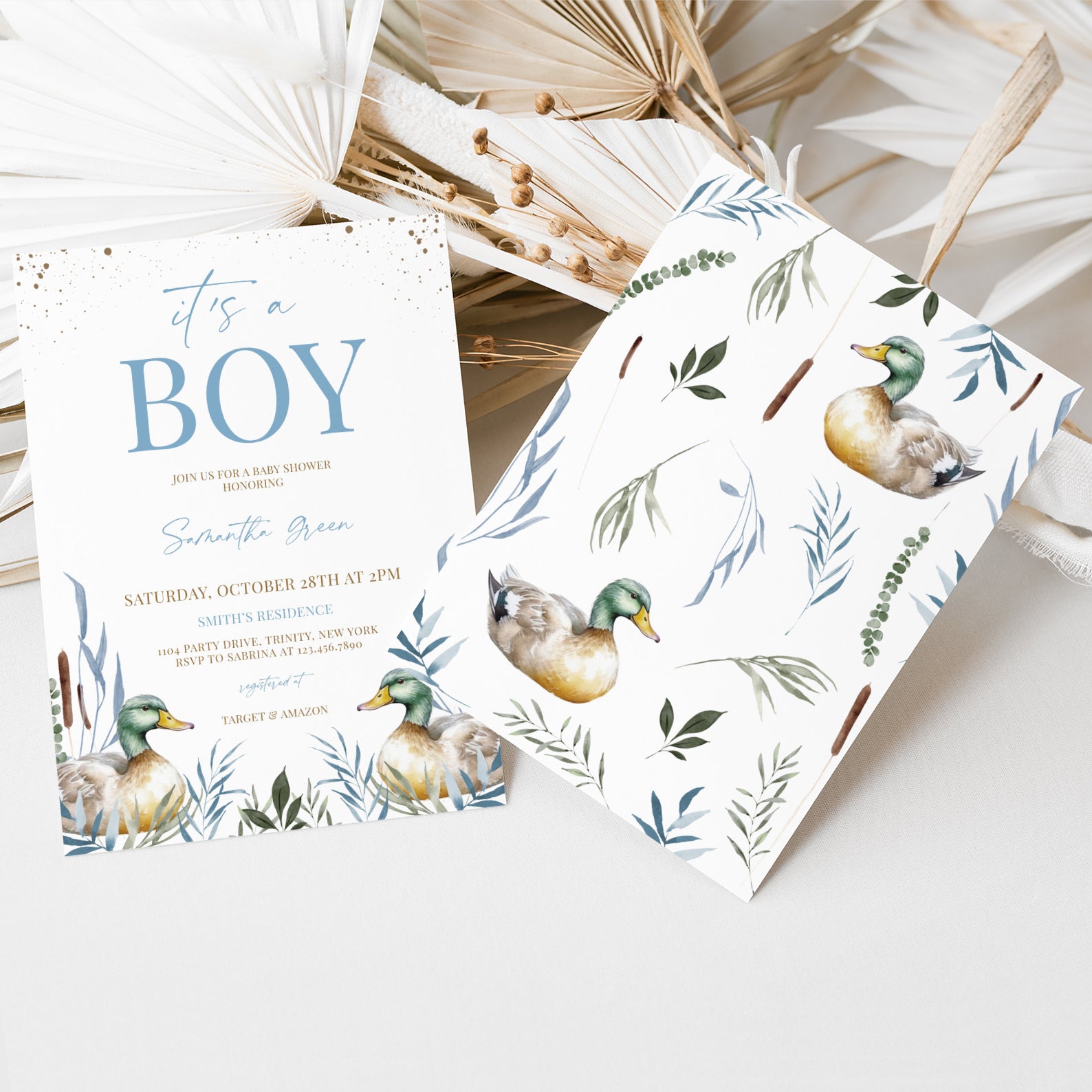 - Purchase this It’s a Boy Mallard Ducks Pond Baby Shower Digital Invite template
