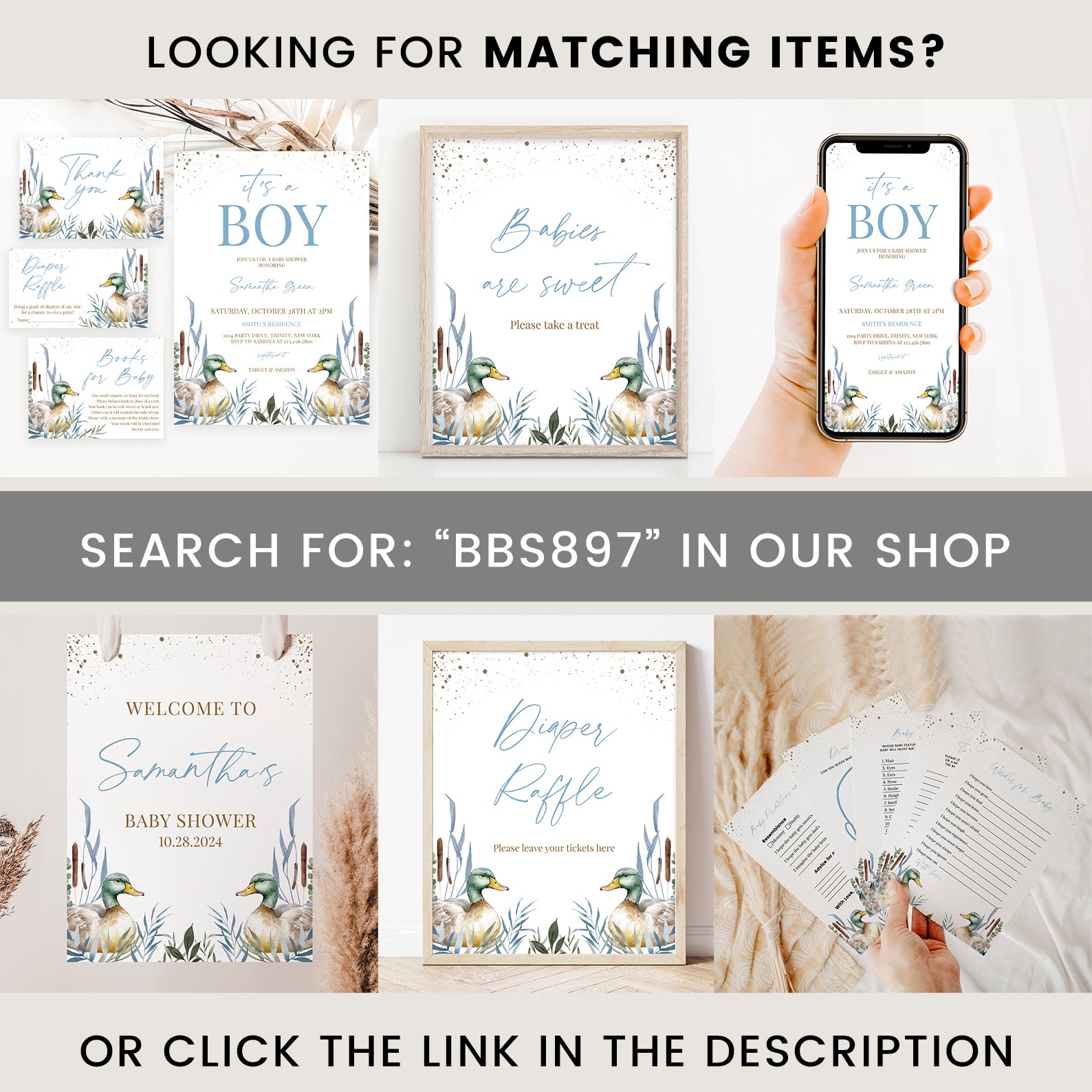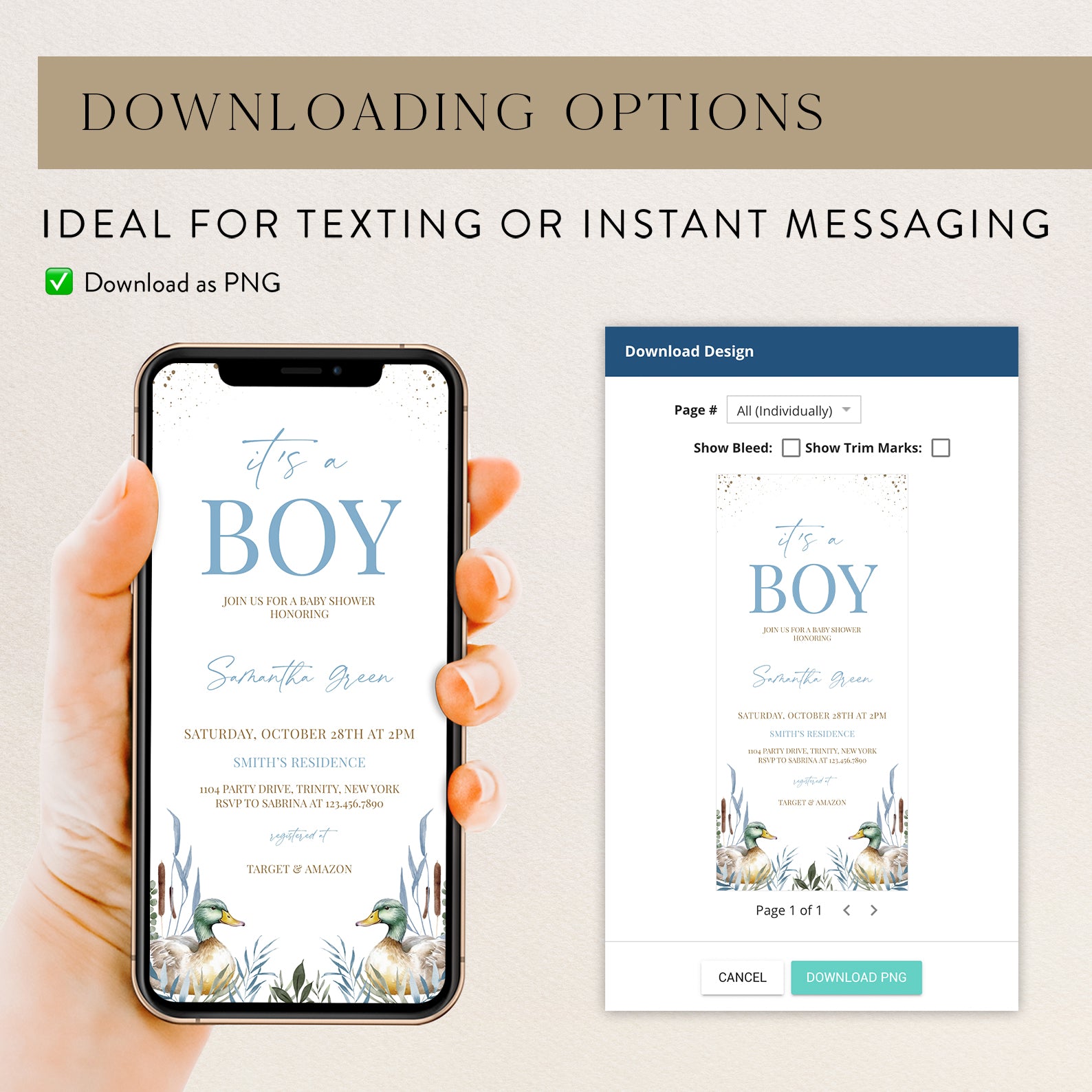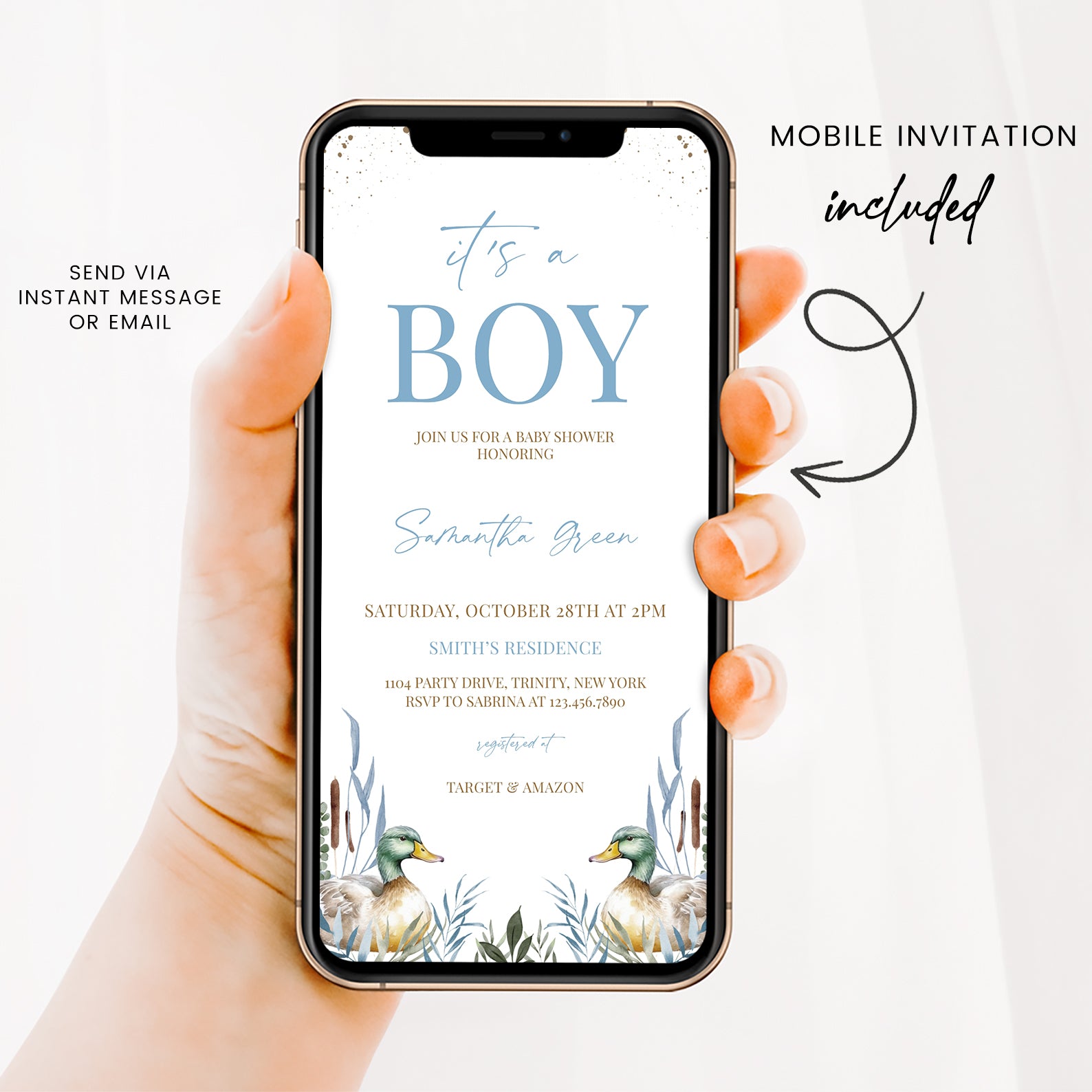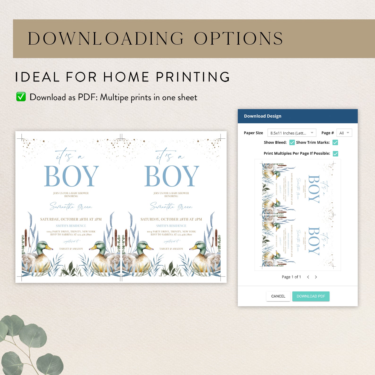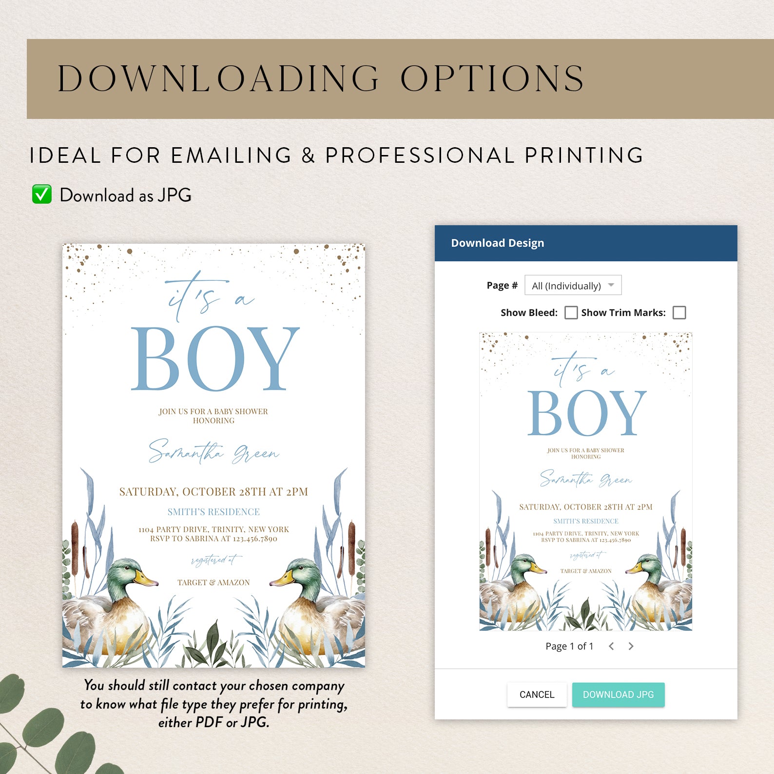 - Purchase this It’s a Boy Mallard Ducks Pond Baby Shower Digital Invite template