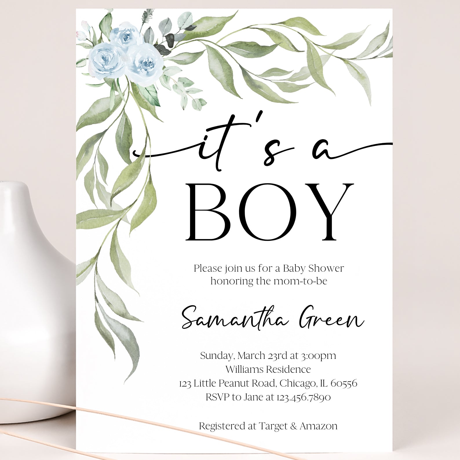 - Purchase this Minimalist Baby Shower Invite with Blue Roses & Greenery template