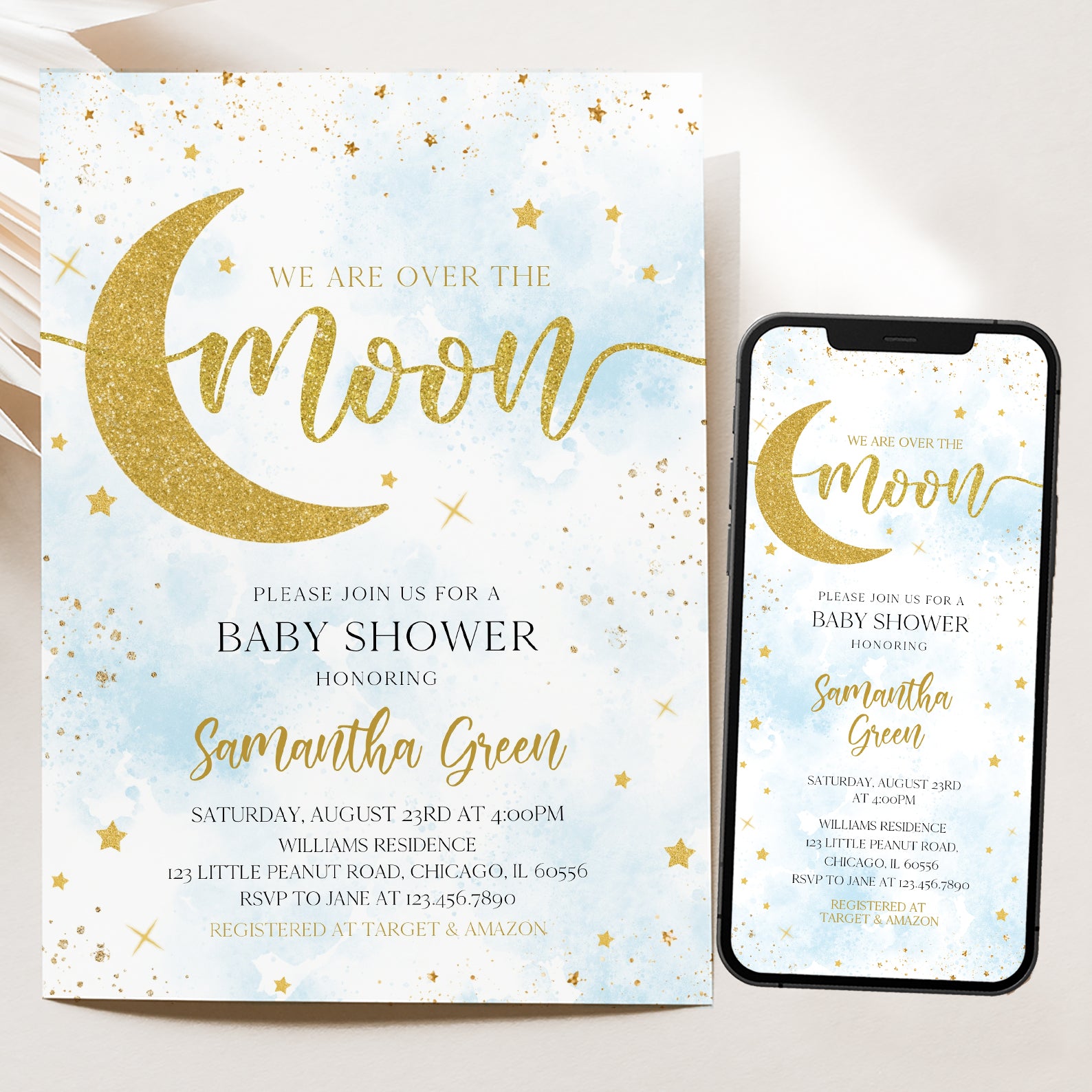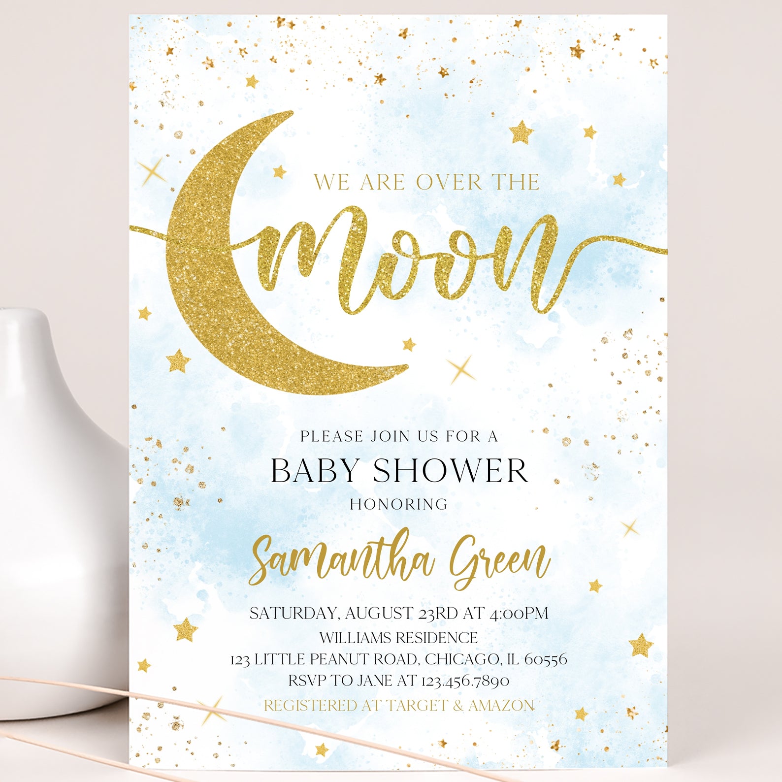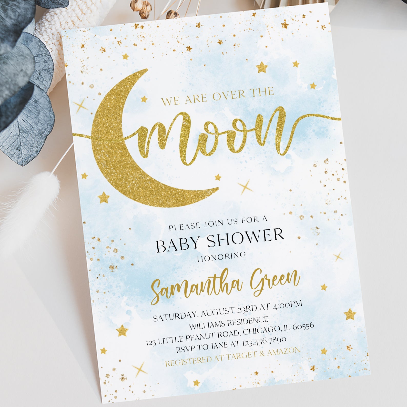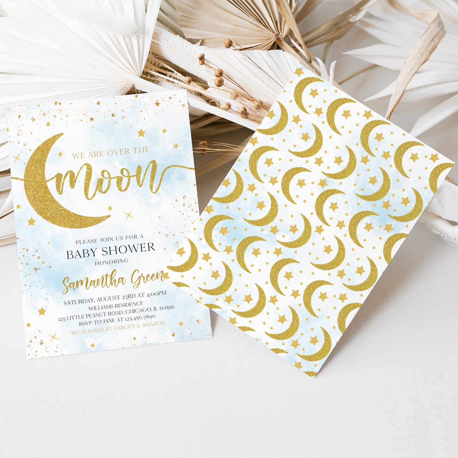 - Purchase this Over the Moon Baby Shower Blue Digital Invite: Gold Moon & Stars template
