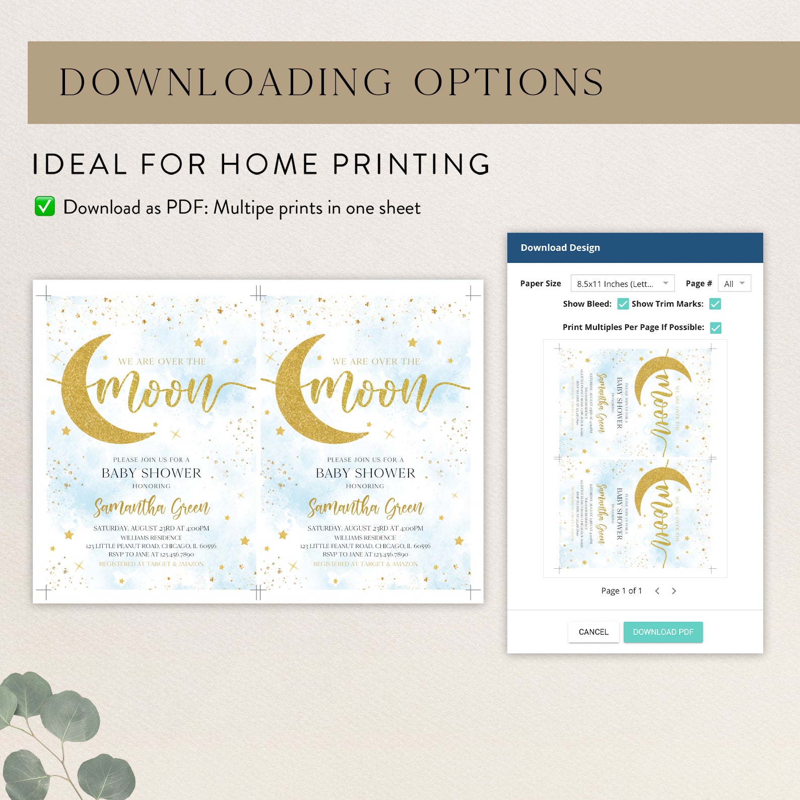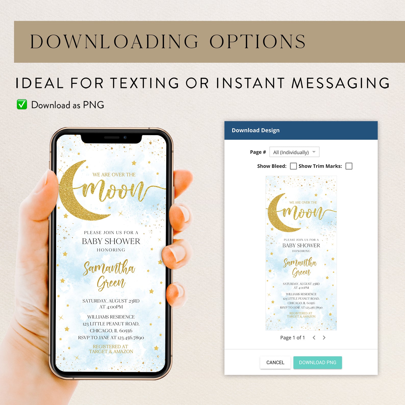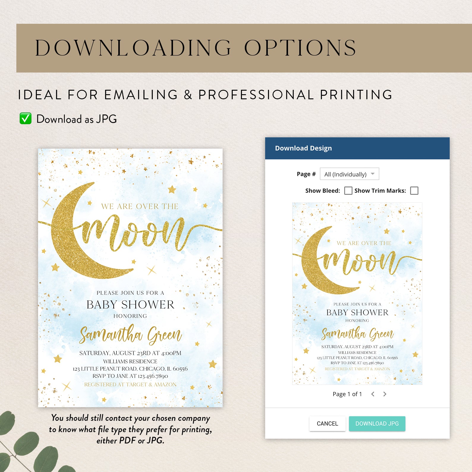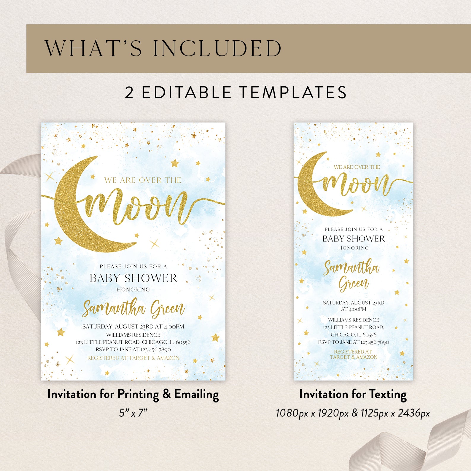 - Purchase this Over the Moon Baby Shower Blue Digital Invite: Gold Moon & Stars template