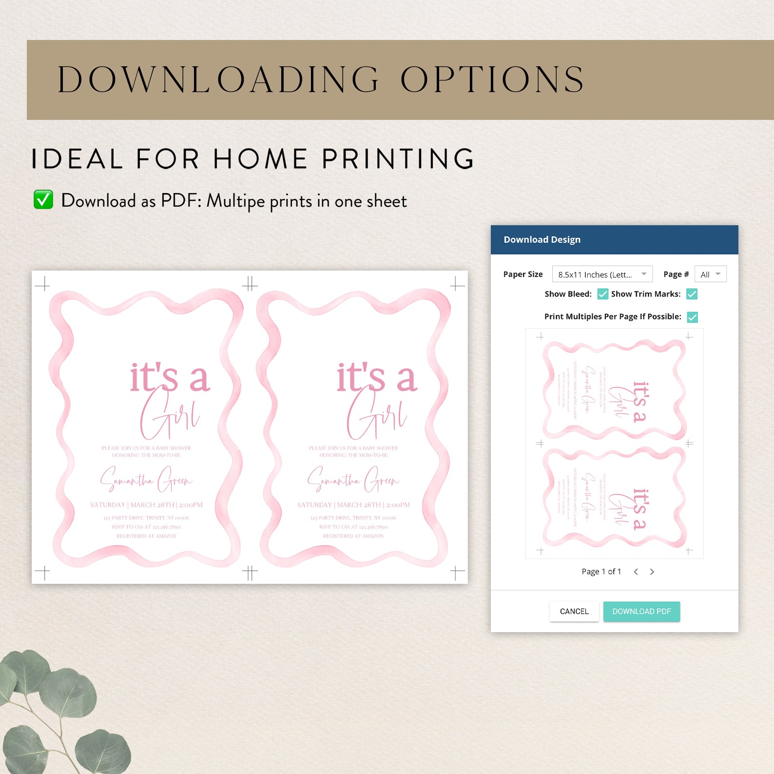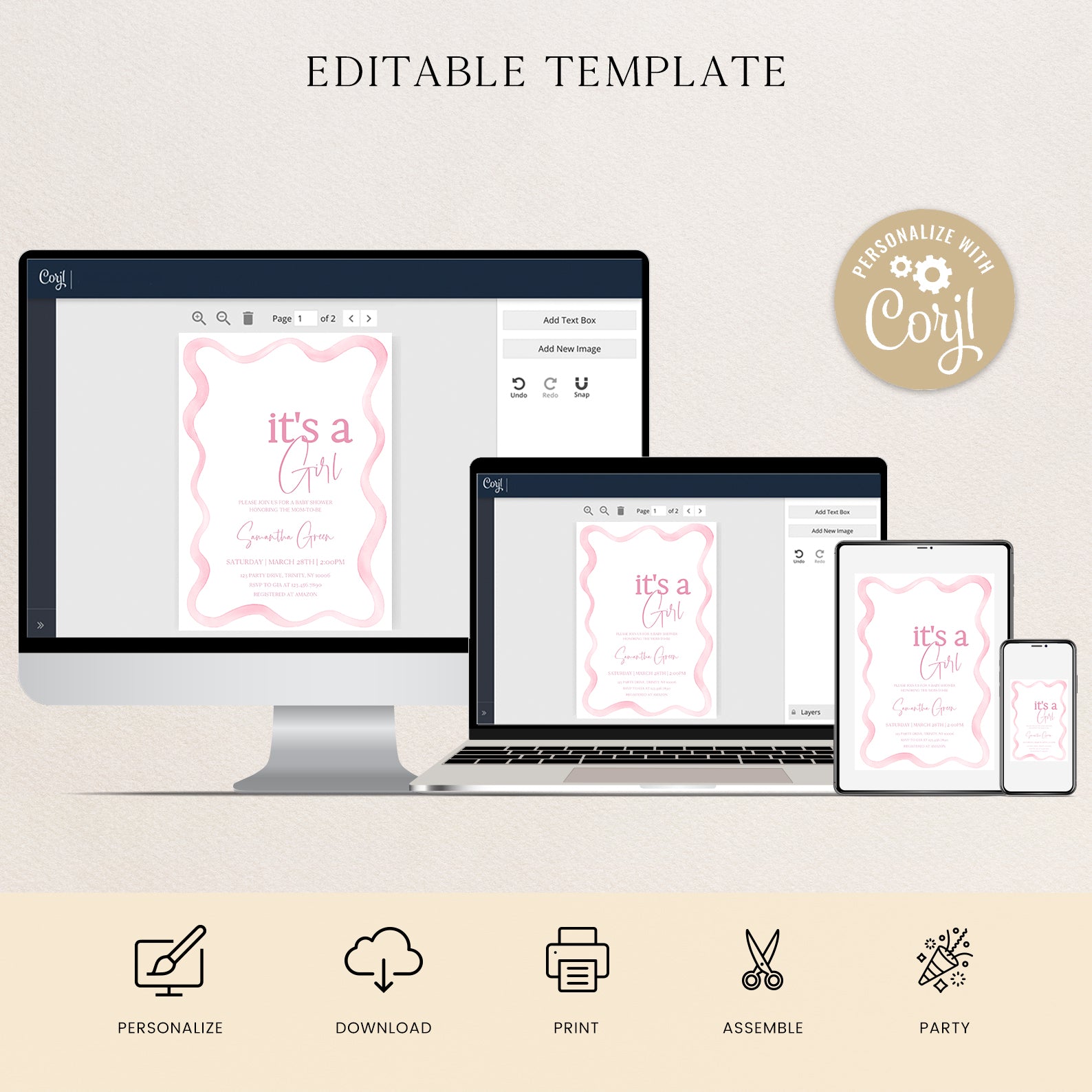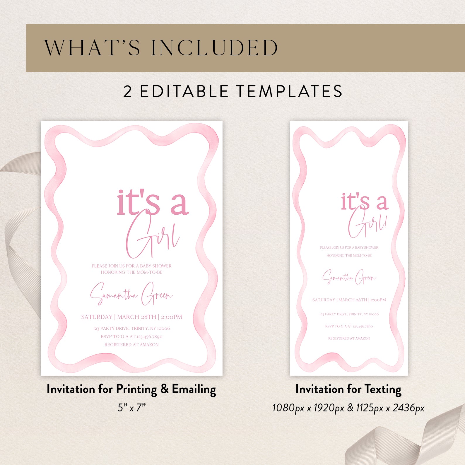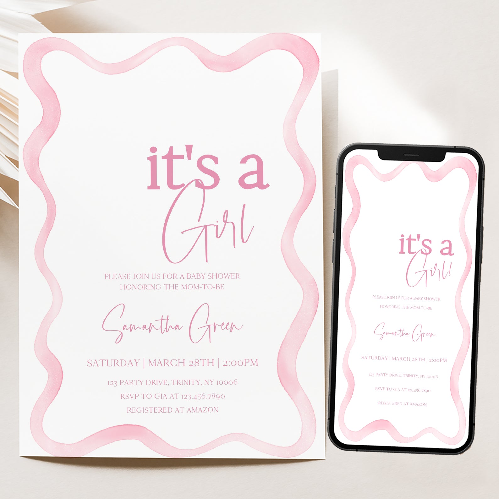 - Purchase this Pink Minimalist Wavy Border Baby Shower Digital Invitation template