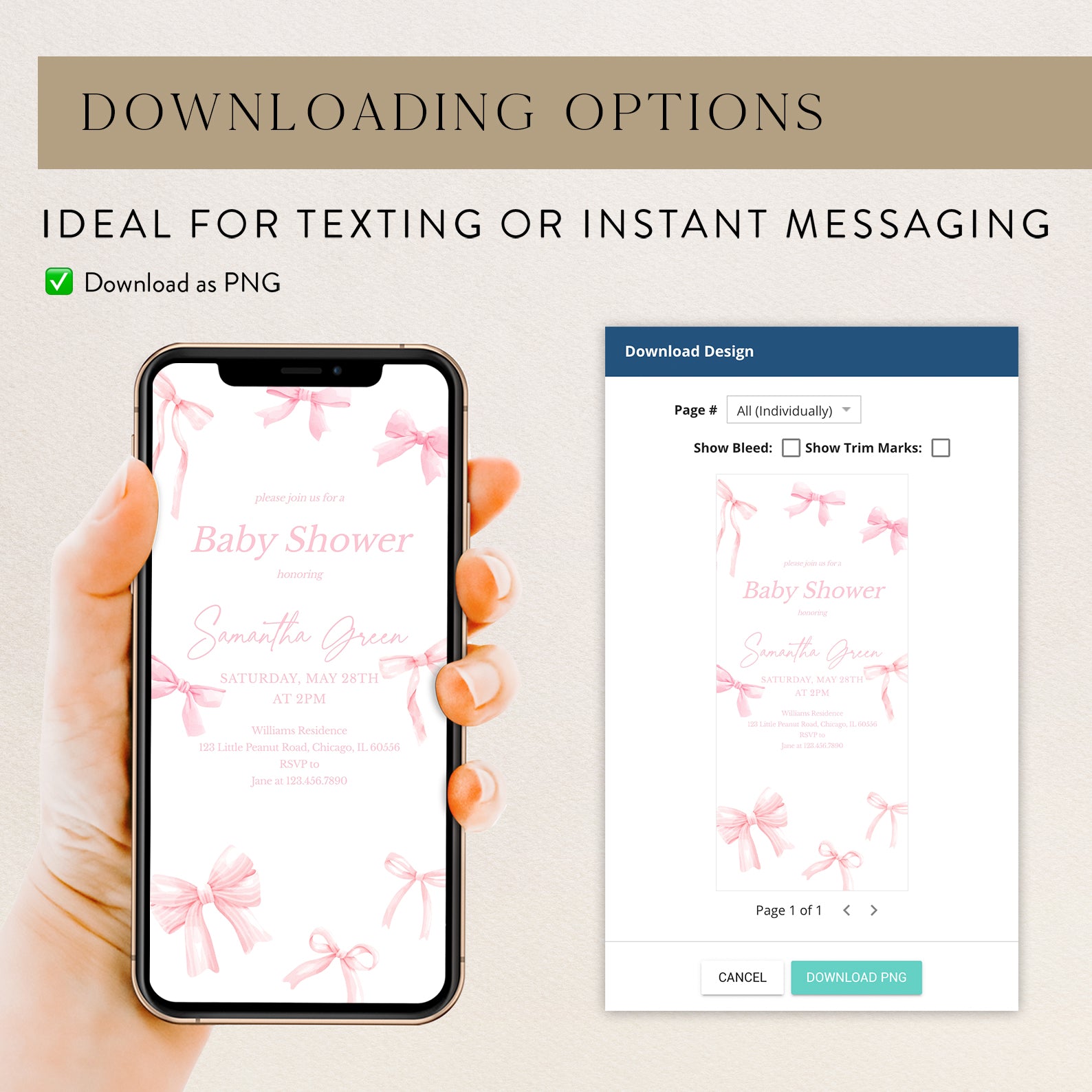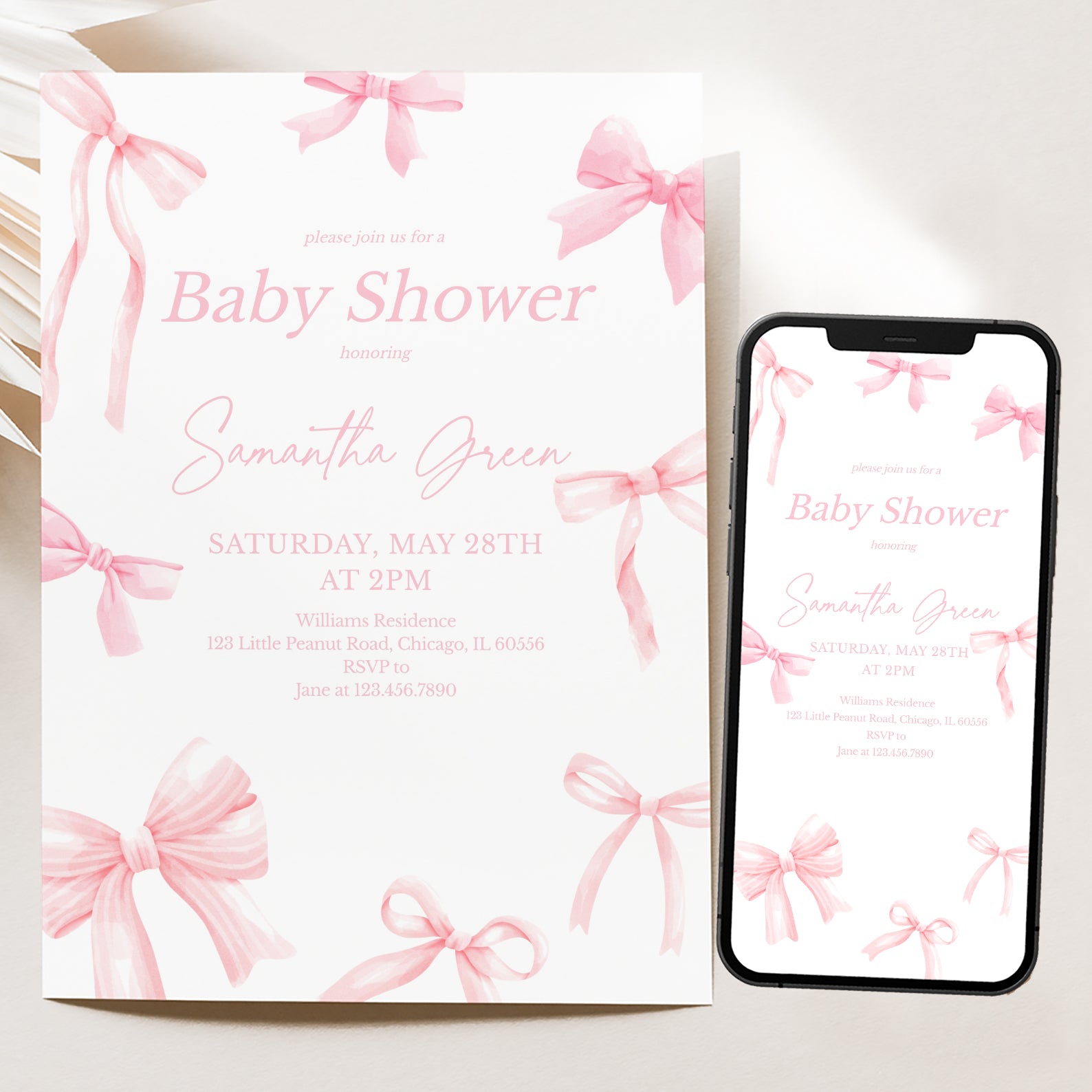 Celebrate the upcoming arrival of your little one with our charming pink-themed baby shower digital invitation! Adorned with delicate pink ribbons, this beautifully designed invitation sets the perfect tone for your special event. Effortlessly customizable, it allows you to add your own details and send it out to guests in just a few clicks. Make your baby shower unforgettable with this elegant and convenient invitation that captures the joy and excitement of welcoming a new baby!
