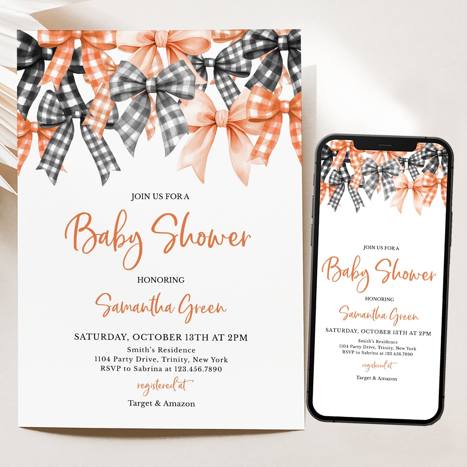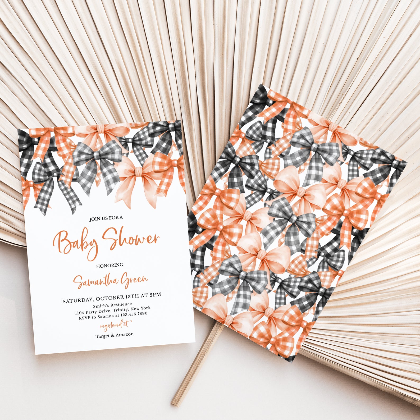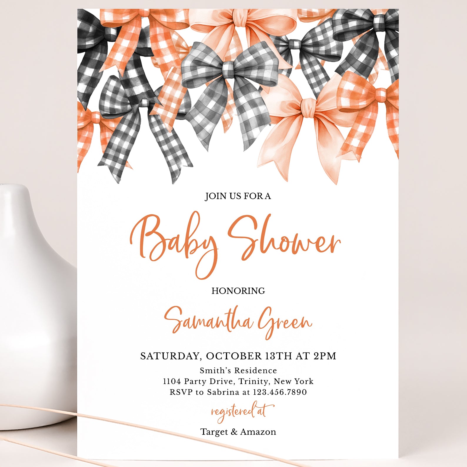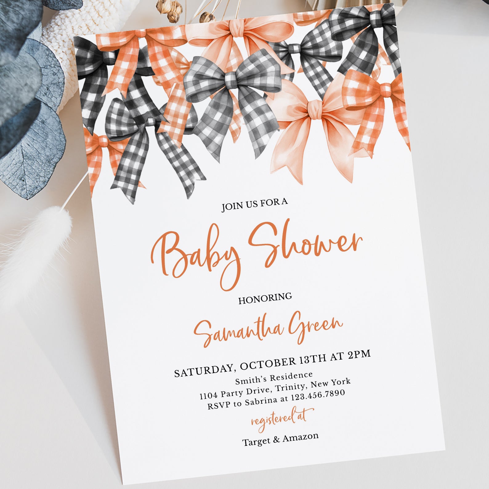 - Purchase this Plaid Ribbon Baby Shower Invite: Orange & Black Theme template