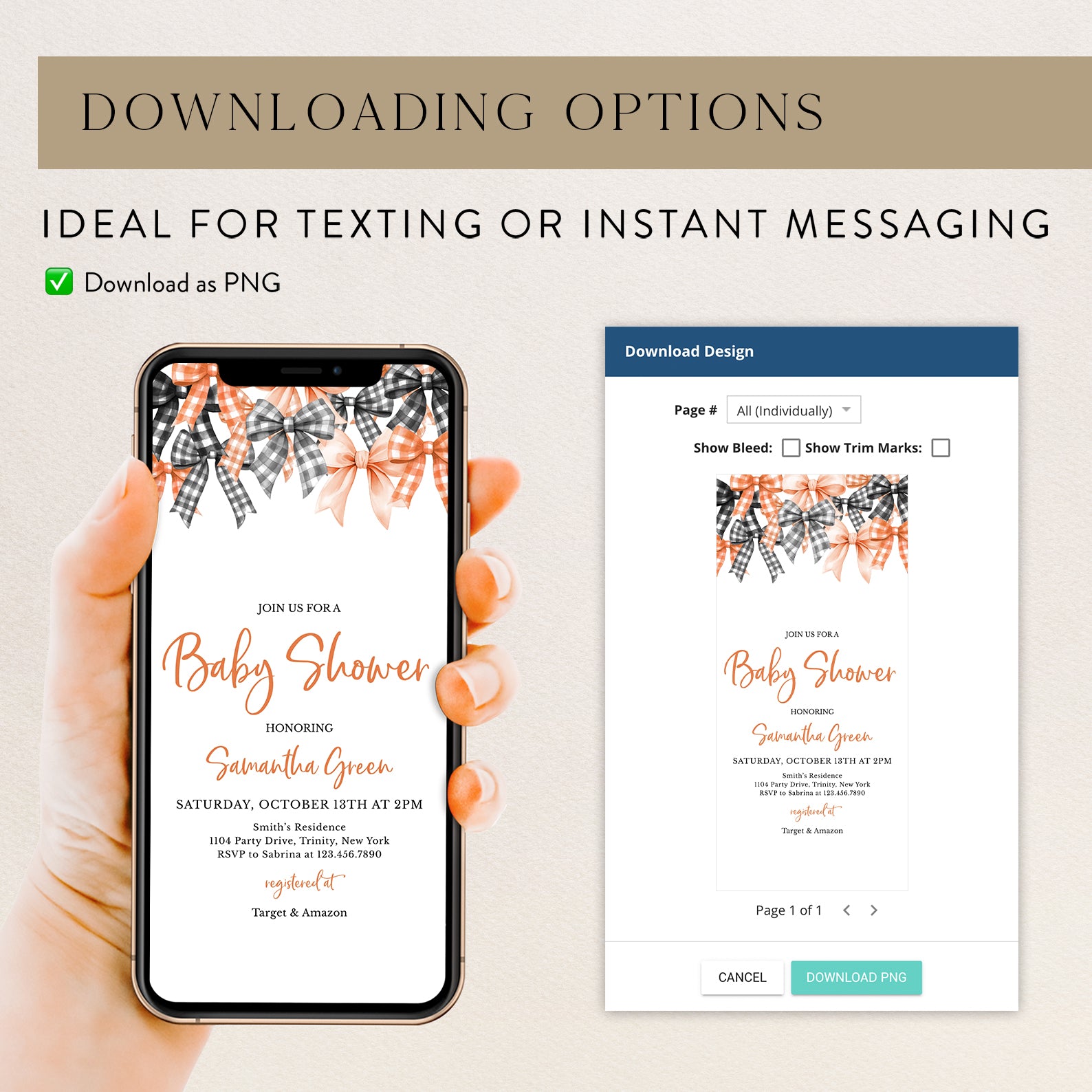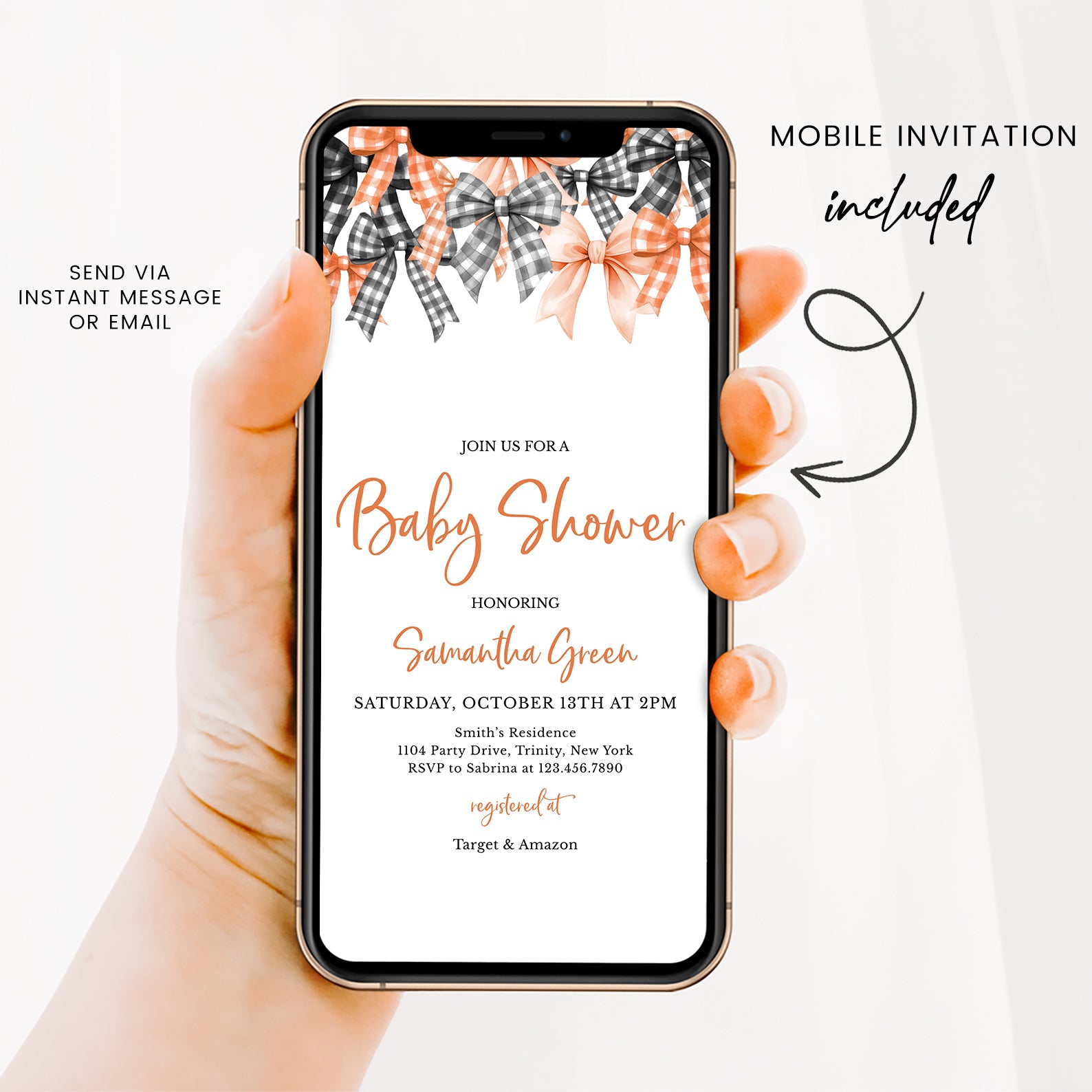 Celebrate the upcoming arrival of your little one with our charming baby shower digital invitation, featuring a delightful orange and black theme. Adorned with elegant bow ribbons and a mix of plain and plaid patterns, this invitation sets the perfect tone for your special event. Effortlessly customizable and easy to share, it’s the ideal way to gather friends and family for a memorable celebration. Make your baby shower unforgettable with this stylish and inviting design!