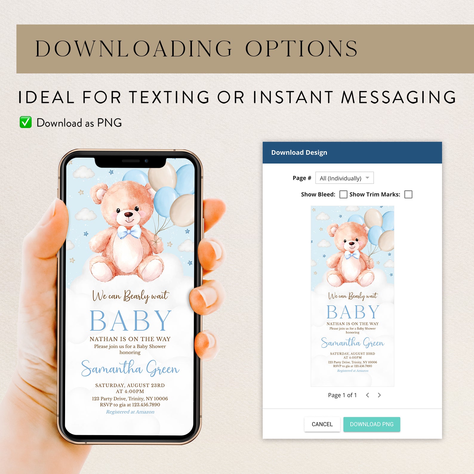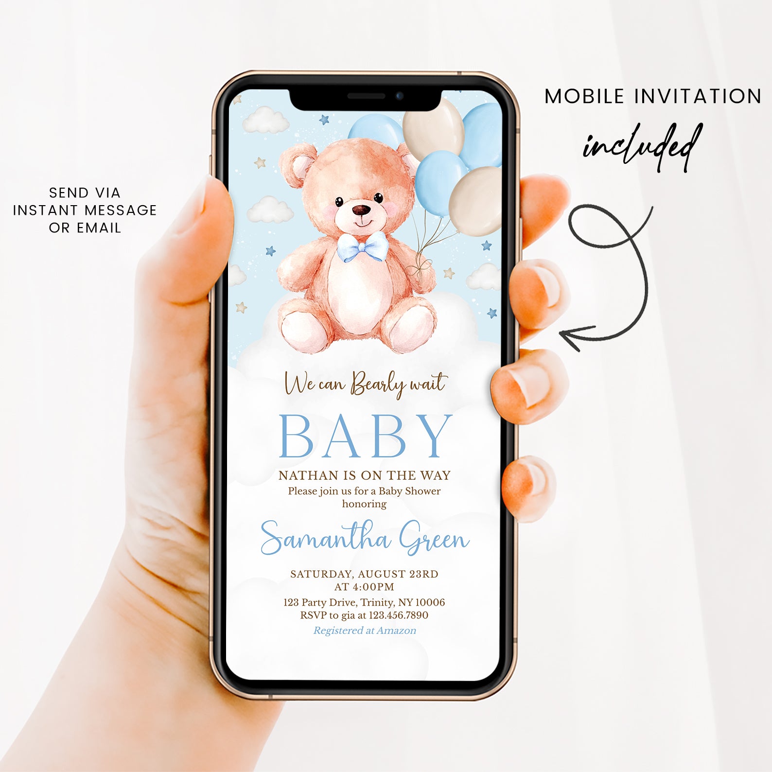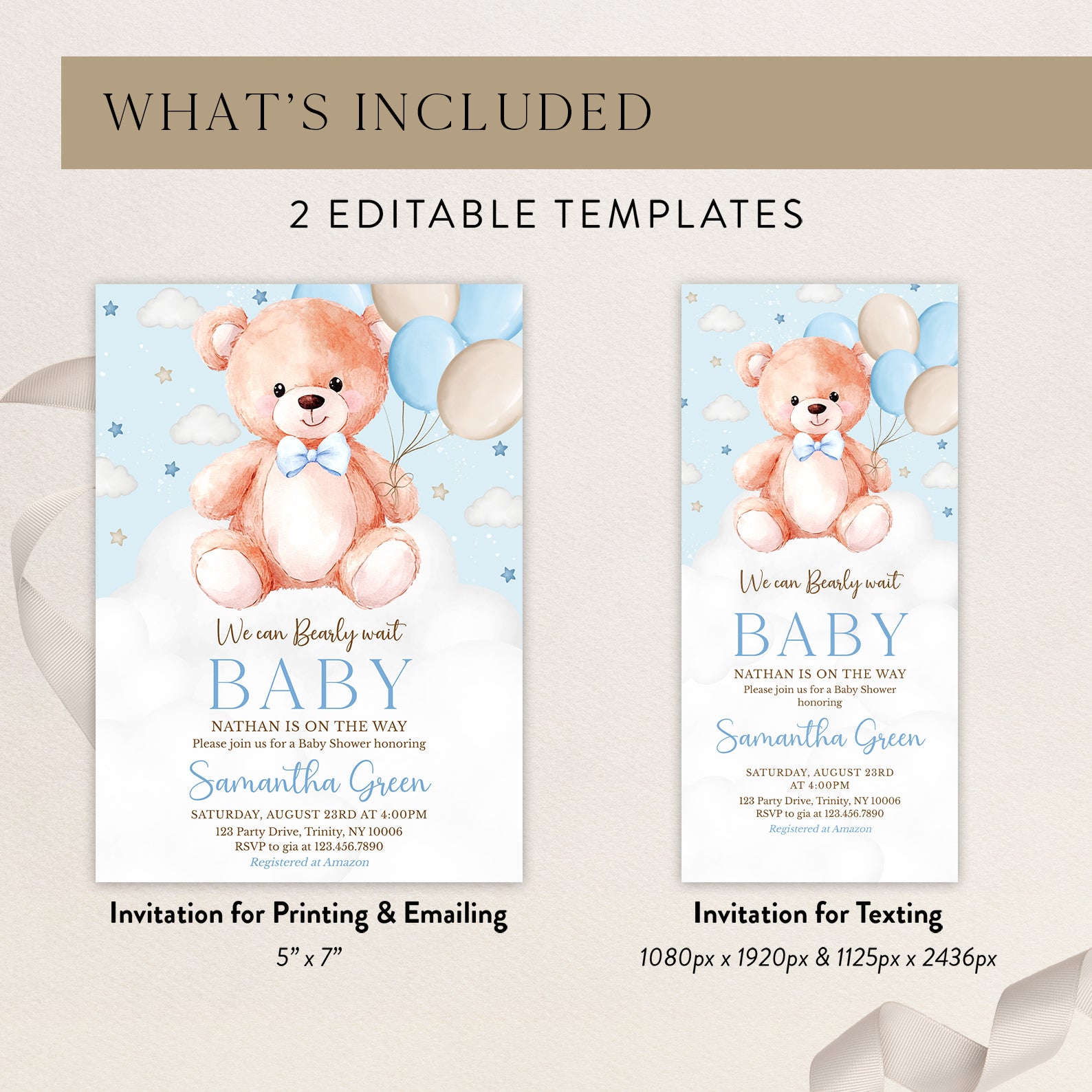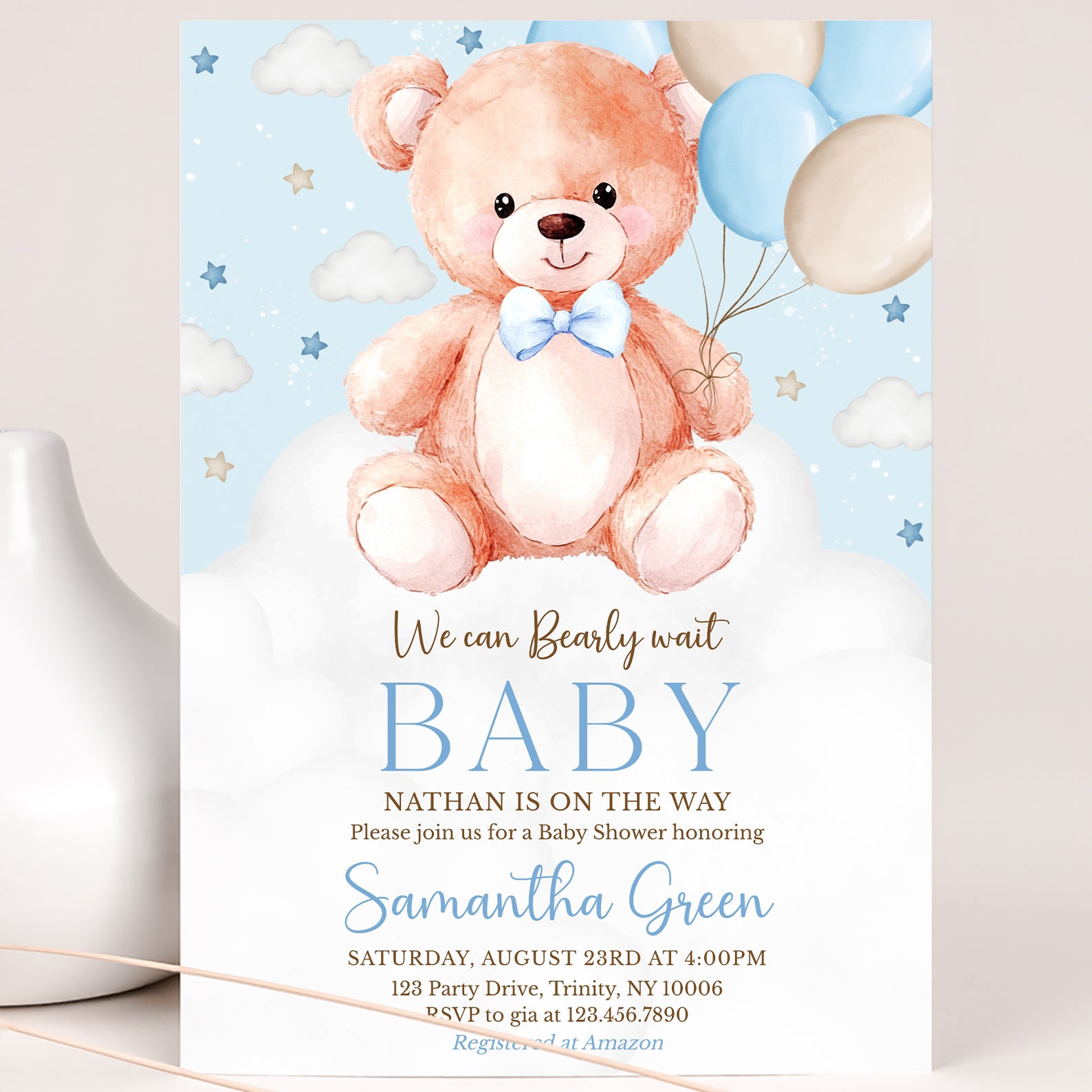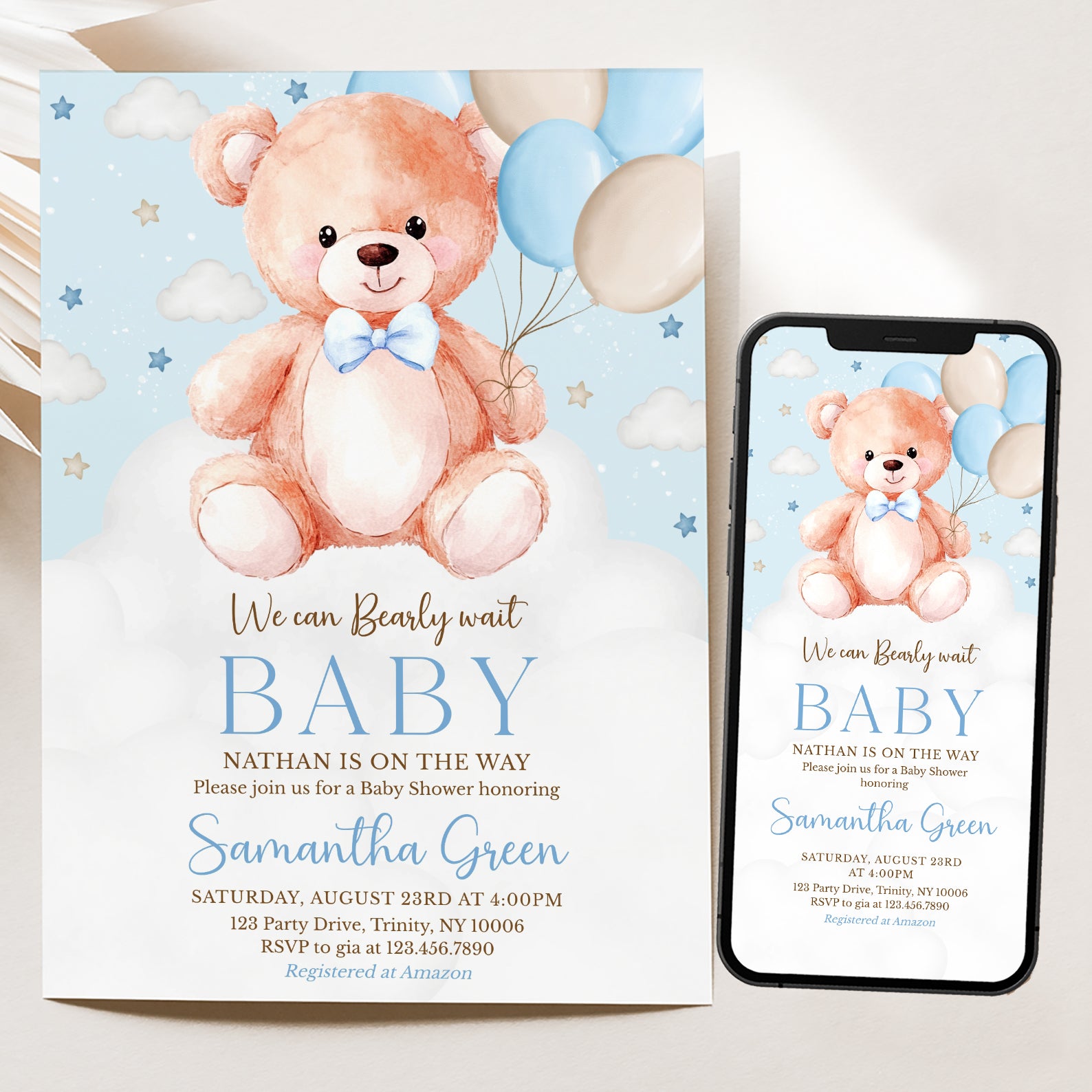 Celebrate the upcoming arrival of your little one with our charming "We Can Bearly Wait" baby shower digital invitation! Featuring an adorable teddy bear draped in a blue ribbon, this invitation captures the joy of welcoming a baby boy. The bear is playfully holding blue and light beige balloons while nestled on a fluffy white cloud, surrounded by twinkling stars and soft clouds. Perfect for setting a whimsical tone for your baby shower, this digital invitation is easy to customize and share, making it a delightful choice for your special celebration.