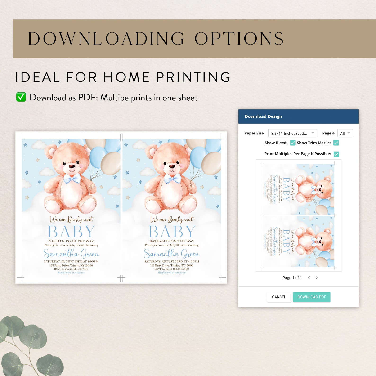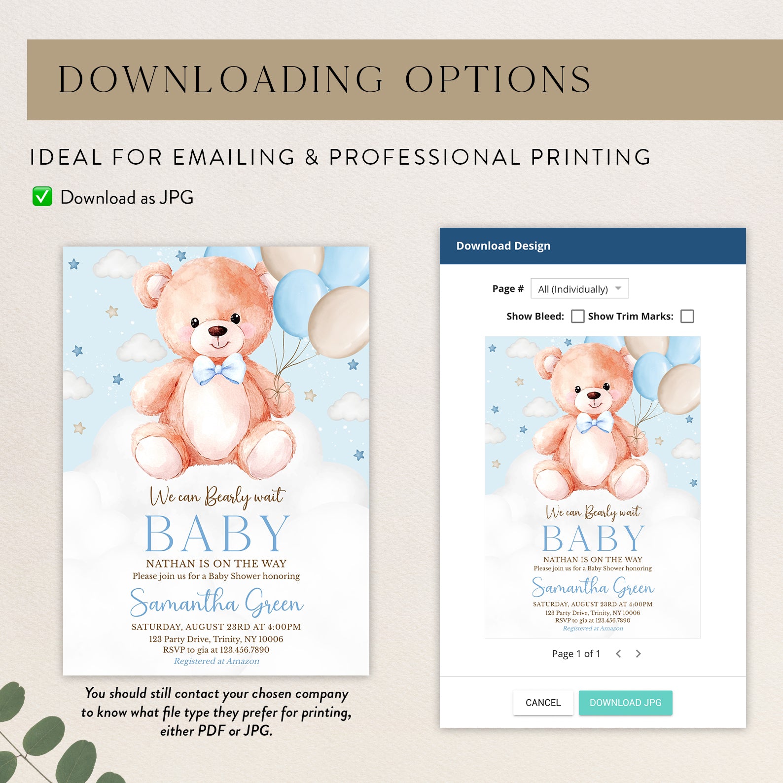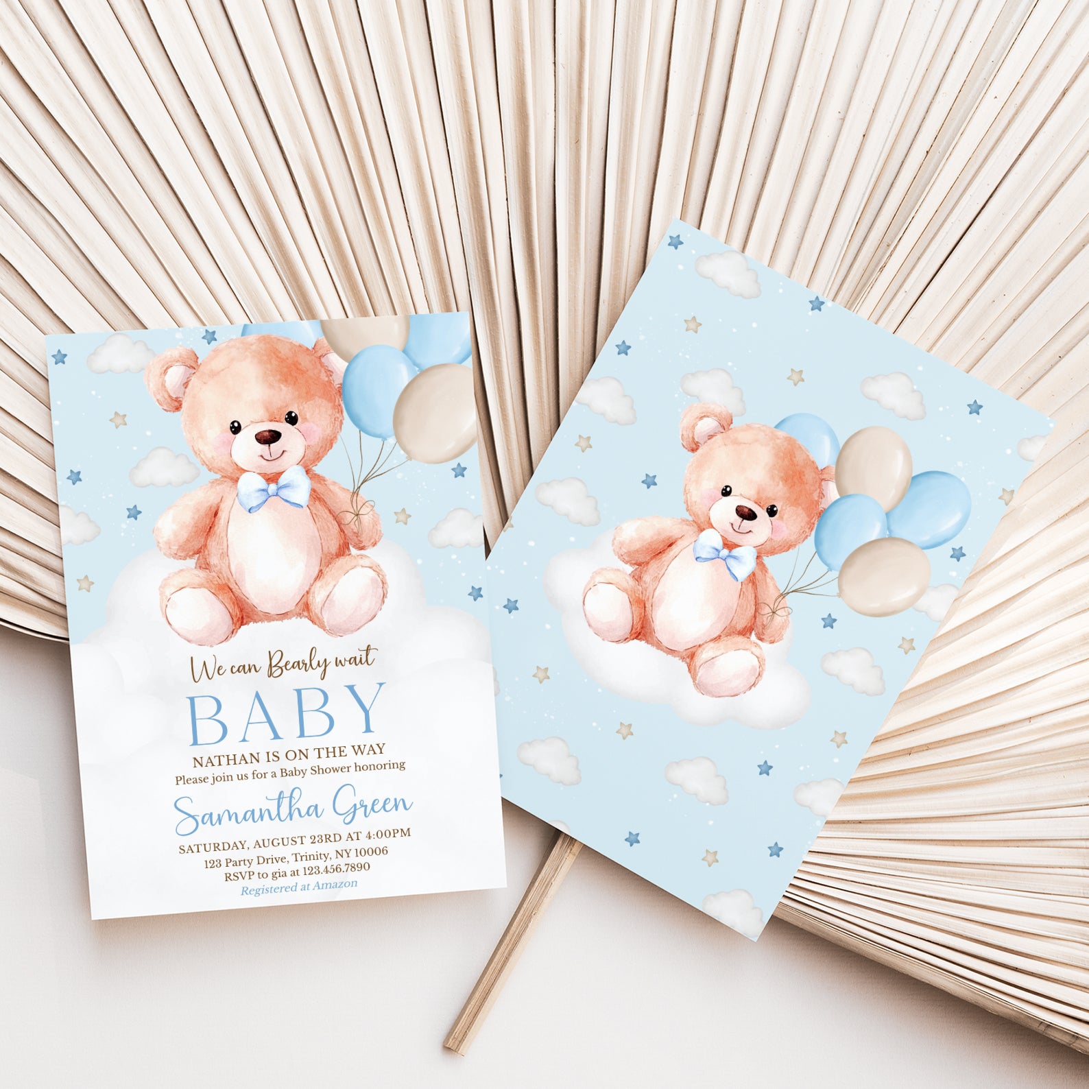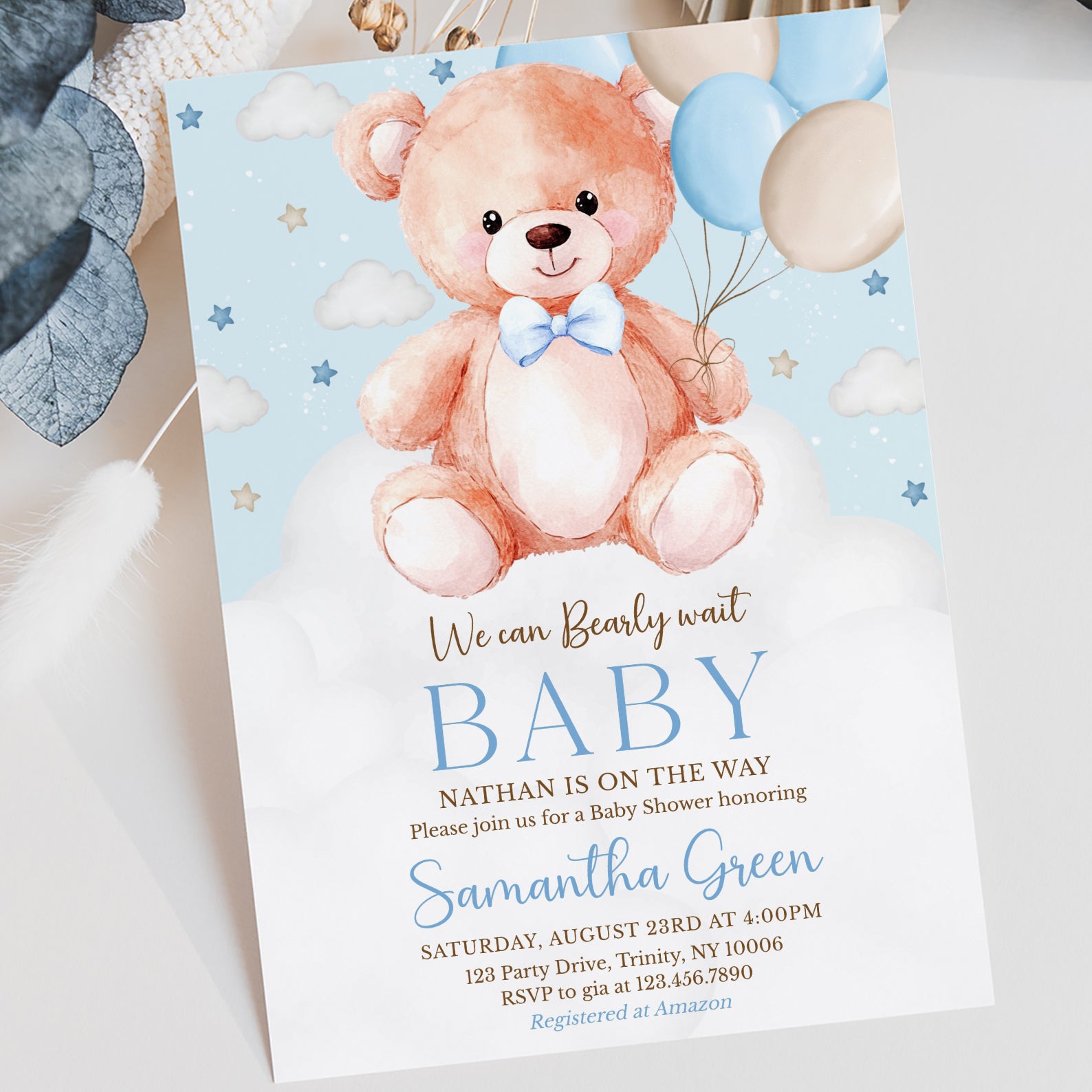 - Purchase this We Can Bearly Wait Blue Baby Shower Invite with Teddy Bear template