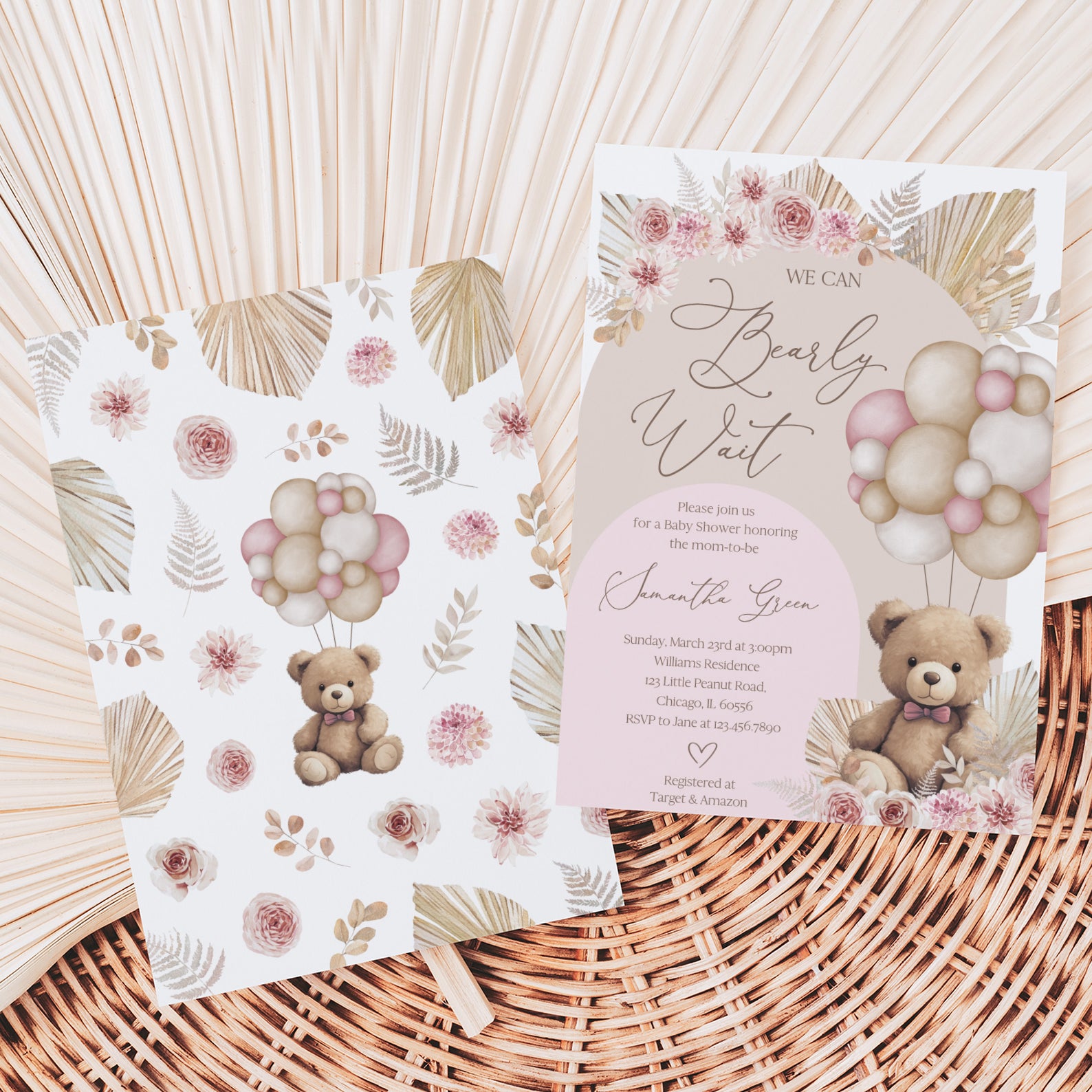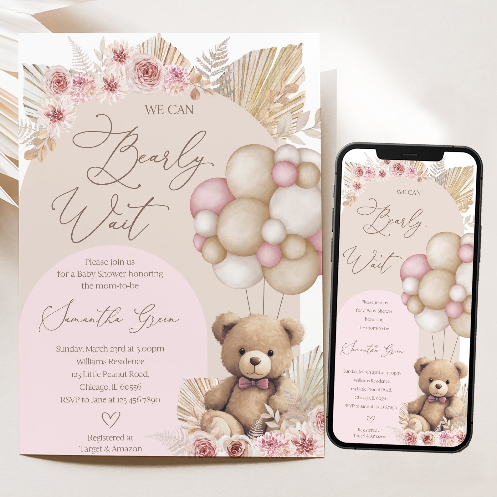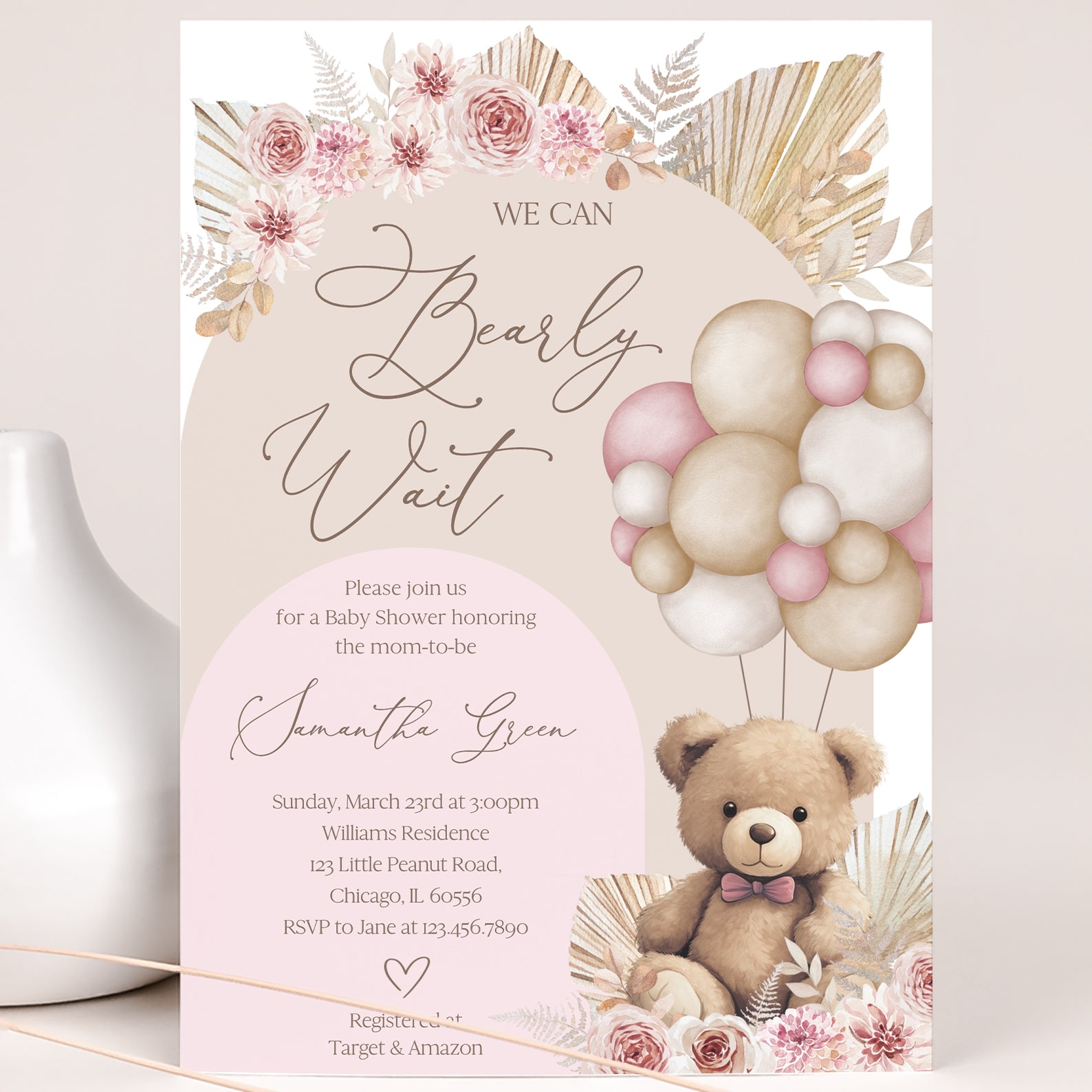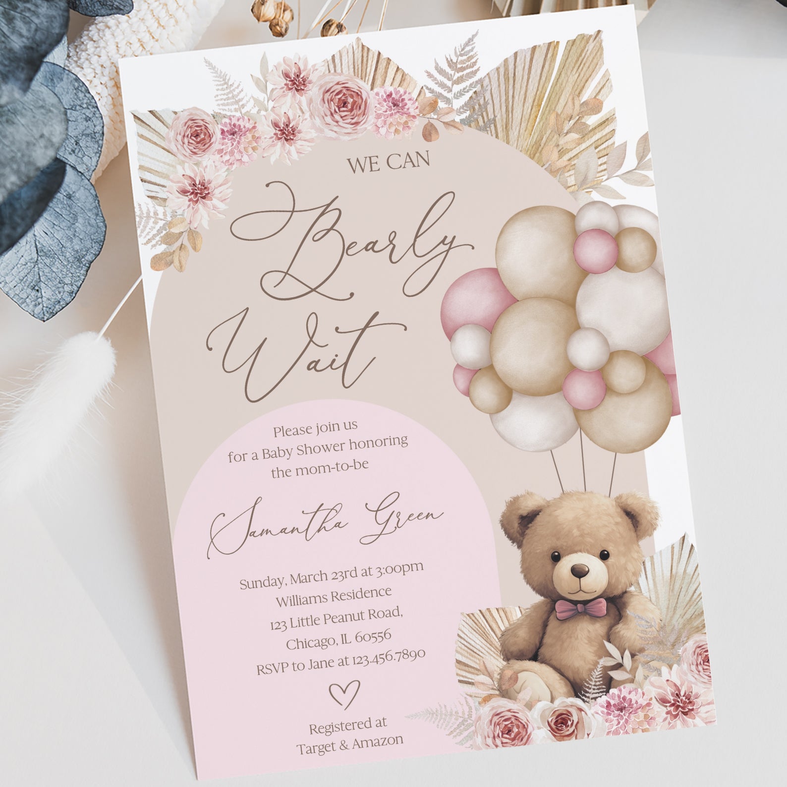 - Purchase this We Can Bearly Wait Teddy Bear Baby Shower Invite, Pink Boho template